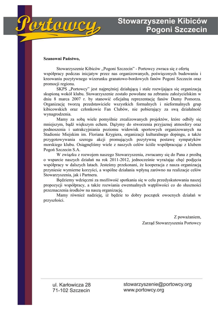 Szanowni Państwo, Stowarzyszenie Kibiców „Pogoni Szczecin” - Portowcy zwraca się z ofertą współpracy podczas inicjatyw przez nas organizowanych, poświęconych budowaniu i kreowaniu pozytywnego wizerunku granatowo-bordowych fanów Pogoni Szczecin oraz promocji regionu. SKPS „Portowcy” jest najpręŜniej działającą i stale rozwijająca się organizacją skupioną wokół klubu. Stowarzyszenie zostało powołane na zebraniu załoŜycielskim w dniu 8 marca 2007 r. by stanowić oficjalną reprezentację fanów Dumy Pomorza. Organizację tworzą przedstawiciele wszystkich formalnych i nieformalnych grup kibicowskich oraz członkowie Fan Clubów, nie pobierający za swą działalność wynagrodzenia. Mamy za sobą wiele pomyślnie zrealizowanych projektów, które odbiły się mniejszym, bądź większym echem. DąŜymy do stworzenia przyjaznej atmosfery oraz podnoszenia i uatrakcyjniania poziomu widowisk sportowych organizowanych na Stadionie Miejskim im. Floriana Krygiera, organizacji kulturalnego dopingu, a takŜe przygotowywania szeregu akcji promujących pozytywną postawę sympatyków morskiego klubu. Osiągnęliśmy wiele z naszych celów ściśle współpracując z klubem Pogoń Szczecin S.A. W związku z rozwojem naszego Stowarzyszenia, zwracamy się do Pana z prośbą o wsparcie naszych działań na rok 2011-2012, jednocześnie wyraŜając chęć podjęcia współpracy w dalszych latach. Jesteśmy przekonani, Ŝe kooperacja z nasza organizacją przyniesie wymierne korzyści, a wspólne działania wpłyną zarówno na realizacje celów Stowarzyszenia, jak i Partnera. Będziemy wdzięczni za moŜliwość spotkania się w celu przedyskutowania naszej propozycji współpracy, a takŜe rozwiania ewentualnych wątpliwości co do słuszności przeznaczenia środków na naszą organizację. Mamy równieŜ nadzieję, iŜ będzie to dobry początek owocnych działań w przyszłości. Z powaŜaniem, Zarząd Stowarzyszenia Portowcy Oferta współpracy Świadczenia ze strony Stowarzyszenia Kibiców Pogoni Szczecin - Portowcy: 1. Nadanie tytułu Partnera Strategicznego Stowarzyszenia Kibiców „Pogoni Szczecin” - Portowcy w bieżącym sezonie, 2. Możliwość stosowania nadanego tytułu z możliwością wykorzystania logo SKPS „Portowcy” w celach marketingowych, 3. Możliwość umieszczenia tablic reklamowych wokół płyty boiska za bramkami podczas meczów Pogoni Szczecin (dwa banery o wymiarach 1x3 m lub jeden podwójny 1x6 m), 4. Promocja oraz po pomoc moc w kreowaniu marki Partnera, jako firmy aktywnie uczestniczącej i wspierającej działalność Stowarzyszenia Kibiców Pogoni Szczecin, 5. Promocja Partnera Strategicznego podczas wszystkich akcji reklamowych prowadzonych przez Stowarzyszenie Kibiców „Pogoni Szczecin” - Portowcy we współpracujących z nami mediach, 6. Możliwość dystrybucji materiałów promocyjnych Partnera podczas meczów oraz eventów organizowanych przez Stowarzyszenie, 7. Umieszczenie logo Partnera we wszystkich materiałach promocyjnych Stowarzyszenia (prezentacje, kalendarze, vlepki, plakaty meczowe, kartki okolicznościowe itp.), 8. Zamieszczenie logo Partnera w formie banera internetowego na głównej stronie oficjalnego serwisu Stowarzyszenia - www.portowcy.org oraz portalach współpracujących ze Stowarzyszeniem wraz z linkiem do strony Partnera, 9. Zaproszenie do udziału we wszystkich akcjach, eventach, oraz spotkaniach organizowanych przez Stowarzyszenie, 10. Możliwo Możliwość przedłużenia ść przed łużenia umowy w kolejnych sezonach na zasadach pierwszeństwa sprzedaży Ponadto jesteśmy gotowi sprostać zadaniom nie wymienionym powyżej, które są istotne z punktu widzenia prowadzonego przez Państwa biznesu. Z wyrazami szacunku, Zarząd Stowarzyszenia Portowcy