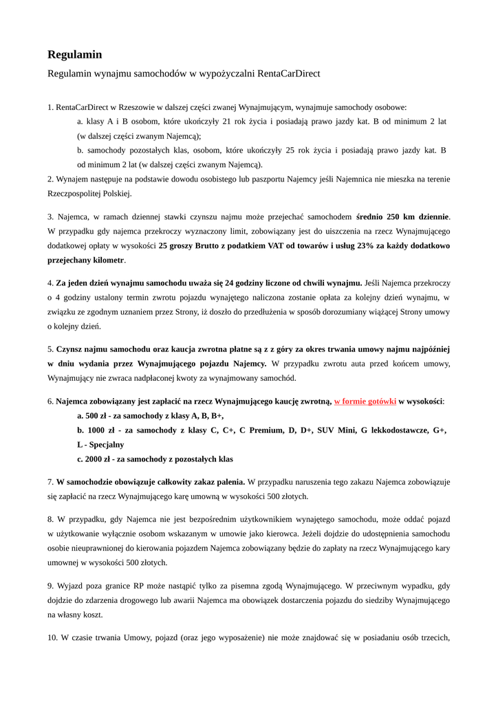 Regulamin Regulamin wynajmu samochodów w wypożyczalni RentaCarDirect 1. RentaCarDirect w Rzeszowie w dalszej części zwanej Wynajmującym, wynajmuje samochody osobowe: a. klasy A i B osobom, które ukończyły 21 rok życia i posiadają prawo jazdy kat. B od minimum 2 lat (w dalszej części zwanym Najemcą); b. samochody pozostałych klas, osobom, które ukończyły 25 rok życia i posiadają prawo jazdy kat. B od minimum 2 lat (w dalszej części zwanym Najemcą). 2. Wynajem następuje na podstawie dowodu osobistego lub paszportu Najemcy jeśli Najemnica nie mieszka na terenie Rzeczpospolitej Polskiej. 3. Najemca, w ramach dziennej stawki czynszu najmu może przejechać samochodem średnio 250 km dziennie. W przypadku gdy najemca przekroczy wyznaczony limit, zobowiązany jest do uiszczenia na rzecz Wynajmującego dodatkowej opłaty w wysokości 25 groszy Brutto z podatkiem VAT od towarów i usług 23% za każdy dodatkowo przejechany kilometr. 4. Za jeden dzień wynajmu samochodu uważa się 24 godziny liczone od chwili wynajmu. Jeśli Najemca przekroczy o 4 godziny ustalony termin zwrotu pojazdu wynajętego naliczona zostanie opłata za kolejny dzień wynajmu, w związku ze zgodnym uznaniem przez Strony, iż doszło do przedłużenia w sposób dorozumiany wiążącej Strony umowy o kolejny dzień. 5. Czynsz najmu samochodu oraz kaucja zwrotna płatne są z z góry za okres trwania umowy najmu najpóźniej w dniu wydania przez Wynajmującego pojazdu Najemcy. W przypadku zwrotu auta przed końcem umowy, Wynajmujący nie zwraca nadpłaconej kwoty za wynajmowany samochód. 6. Najemca zobowiązany jest zapłacić na rzecz Wynajmującego kaucję zwrotną, w formie gotówki w wysokości: a. 500 zł - za samochody z klasy A, B, B+, b. 1000 zł - za samochody z klasy C, C+, C Premium, D, D+, SUV Mini, G lekkodostawcze, G+, L - Specjalny c. 2000 zł - za samochody z pozostałych klas 7. W samochodzie obowiązuje całkowity zakaz palenia. W przypadku naruszenia tego zakazu Najemca zobowiązuje się zapłacić na rzecz Wynajmującego karę umowną w wysokości 500 złotych. 8. W przypadku, gdy Najemca nie jest bezpośrednim użytkownikiem wynajętego samochodu, może oddać pojazd w użytkowanie wyłącznie osobom wskazanym w umowie jako kierowca. Jeżeli dojdzie do udostępnienia samochodu osobie nieuprawnionej do kierowania pojazdem Najemca zobowiązany będzie do zapłaty na rzecz Wynajmującego kary umownej w wysokości 500 złotych. 9. Wyjazd poza granice RP może nastąpić tylko za pisemna zgodą Wynajmującego. W przeciwnym wypadku, gdy dojdzie do zdarzenia drogowego lub awarii Najemca ma obowiązek dostarczenia pojazdu do siedziby Wynajmującego na własny koszt. 10. W czasie trwania Umowy, pojazd (oraz jego wyposażenie) nie może znajdować się w posiadaniu osób trzecich, które nie zostały wymienione w umowie jako kierowca zgodnie z pkt 8 niniejszego regulaminu, być przedmiotem procesów sądowych ani zastawu, być wykorzystany w sposób odbiegający od zwykłego użytkowania zgodnie z przeznaczeniem, właściwościami oraz otrzymanymi od Wynajmującego instrukcjami producenta i sprzedawcy, a także zgodnie z przepisami dotyczącymi ruchu drogowego, wynikającym z jego budowy oraz zgodnie z przeznaczeniem określonym w dowodzie dopuszczającym pojazd do ruchu (w dowodzie rejestracyjnym) tj. w szczególności: podnajmowany, użyty w wyścigach samochodowych, treningach, rajdach, testach na prędkość, użyty do holowania lub pchania innych pojazdów, użyty do ciągnięcia przyczep, użyty wbrew przepisom prawa. W przypadku niedopełnienia wskazanego powyżej obowiązku, Najemca odpowiada materialnie i prawnie za wszystkie straty i szkody powstałe w tym czasie. 11. W przypadku uszkodzenia samochodu uniemożliwiającego jego samodzielne poruszanie się (uszkodzenie mechaniczne), Najemca zobowiązany jest do niezwłocznego kontaktu telefonicznego z Wynajmującym. 12. W przypadku kolizji drogowej lub kradzieży wynajętego samochodu Najemca jest zobowiązany niezwłoczne zawiadomić Policję oraz Wynajmującego o zaistniałym zdarzeniu. 13. Najemca odpowiada materialnie za straty lub szkody powstałe z jego winy lub zaniedbania. 14. W przypadku powstania szkody w wynajętym samochodzie z winy Najemcy, w szczególności w przypadku kierowania samochodem przez Najemcę w stanie nietrzeźwości, stanie wskazujący na spożycie alkoholu, nie zachowania ostrożności, spowodowania kolizji drogowej, okres naprawy samochodu traktowany będzie jako kontynuacja umowy najmu wraz z wszelkimi konsekwencjami finansowymi oraz prawnymi. 15. Wynajmujący nie odpowiada za straty materialne powstałe w wyniku nie dotarcia wypożyczanym samochodem do celu podróży z powodów awarii, kolizji itp. W przypadku awarii samochodu Najemcy przysługuje prawo do samochodu zastępczego zgodnie z posiadaną polisą ubezpieczeniową wynajmowanego pojazdu. 16. Wynajmujący nie odpowiada za wykroczenia drogowe popełnione przez Najemcę (mandaty karne, zdjęcia z foto radarów, opłaty za zdjęcia). 17. Wynajmujący nie ponosi odpowiedzialności za rzeczy przewożone lub pozostawione w samochodzie przez Najemcę lub osobę wskazaną w pkt 8 niniejszego regulaminu. 18. Przekroczenie terminu umowy i nie powiadomienie Wynajmującego o zamiarze wydłużenia okresu najmu upoważnia Wynajmującego do powiadomienia Policji o kradzieży pojazdu oraz podwyższenia stawki wynajmu o 150% za każdą dodatkową dobę samowolnego użytkowania przedmiotu najmu. 19. Najemca zobowiązany jest do zabezpieczenia samochodu przed kradzieżą, w szczególności do każdorazowego zamykania samochodu oraz włączanie wszystkich urządzeń anty kradzieżowych; starannego zabezpieczenia poza pojazdem dokumentów oraz kluczyków do wynajętego samochodu. 20. Wynajmujący wynajmuje Najemcy do eksploatacji pojazd sprawny technicznie, czysty (wewnątrz i na zewnątrz) oraz posiadający ubezpieczenie OC/AC/NW. 21. Podczas okresu najmu Najemca