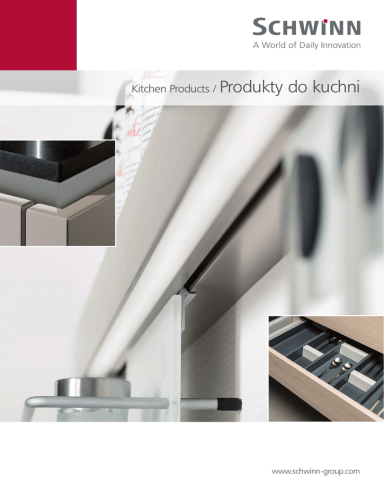 Kitchen Products / Produkty do kuchni www.schwinn-group.com Miejsce nawet w najmniejszej wnęce There is room in the smallest niche Systemy relingów nie są obecnie jedynie praktycznymi i dekoracyjnymi elementami pomagającymi w przechowywaniu rzeczy w kuchni, lecz spełniają o wiele więcej funkcji. Z ich pomocą można w sposób sensowny uzyskać dodatkowe miejsce. Właśnie takie opcje wykorzystania oferuje nowy system relingów firmy Schwinn. Jego możliwości zostały ostatnio poszerzone o spektakularny wariant systemu, wyposażony w gniazda zasilające i oświetlenie blatu roboczego, jak również podwieszoną półeczkę. Kitchen railing systems today are much more than practical and decorative storage devices. They create useful and attractive spaces. The new Schwinn railing system expands into new dimensions by building on the inherent benefits. It now offers power supply, task lighting and an integrated shelf. System relingowy z funkcją oświetleniową Light railing system Bez uchwytu a mimo to z indywidualną nutą Handle-free with optional individual touch Firma Schwinn potrafi sprostać także wyzwaniom systemów bezuchwytowych - opracowano linearne, funkcjonalne, ryflowane profile o wielostronnych możliwościach zastosowania. Co niezwykłe, profile te – przy statycznej obciążalności i trwałym wykończeniu powierzchni – oferują jednocześnie zindywidualizowane możliwości dekoracyjne. Można zamocowywać je w pionie lub poziomie, według własnej fantazji i życzeń. For a handle-free cabinet design, Schwinn offers a fully integrated handle option. It is linear, functional, and versatile. We considered load bearing capacity, finish durability requirements and the need for a customizable look. The new Schwinn C and L channels are for vertical or horizontal use. Profile do systemów bezuchwytowych Handle-free channel system Wszystko w porządku Everything in its place Firma Schwinn opracowała funkcjonalny system organizacji wewnętrznej do szuflad. Dzięki niemu wszystkie używane codziennie przybory kuchenne znajdują się cały czas w zasięgu ręki. Ten modułowy system obejmuje trzy profile z tworzywa sztucznego o różnych szerokościach, dostosowane elementy przesuwne oraz elementy zakończające. Wszystkie te elementy pozwalają na bezproblemowe zestawianie najróżniejszych kombinacji. Schwinn has developed a modular drawer divider system that helps keep order in any drawer. Channels in three different widths, movable divider blocks and a flexible trim piece create a system that can be configured to accommodate numerous drawer dimensions. System organizacji wewnętrznej do szuflad Drawer divider system System relingów z oświetleniem Light railing system Ref. 33845 230 V przyłącz bezpośredni 110-Volt outlet Po lewej: powerbox (moduł mocy) z transfor- Left side: Power box with 30-Watt LED transformer and switch in multiple color and finish options. matorem LED 30 W i wyłącznikiem, kolorystyka i wykończenie powierzchni do wyboru Po prawej: e-box z gniazdem wtykowym ze stykiem ochronnym 230 V Montaż ścienny przy pomocy modułów zakończeniowych Pomiędzy nimi profil aluminiowy z taśmą ledową na całej długości, dzięki czemu oświetlenie blatu roboczego jest bardziej efektywne Right side: E-box with 110-Volt outlet Wall mounting bracket integrated in end units on the left and right side Aluminum channel with full-length LED lighting strip for efficient workplace illumination Concealed wire management Kabel poprowadzony w profilu Compatible with existing square rail components W dolnej części profilu wpust do zawieszenia Integrated shelf różnych elementów (reling kwadratowy) Górną część wyprofilowano jako powierzchnię płaską do odstawiania różnych rzeczy Akcesoria / Accessories Ref. 88923 Ref. 88924 Ref. 88927 Ref. 88934 Ref. 88930 Ref. 88932 Profile do systemów bezuchwytowych Handle free channel system Ref. 33848 + Ref. 33849 Wytłaczane profile aluminiowe, anodowane w kolorze stal szlachetna Możliwość dostawy do wyboru w wersji oryginalnej, do bezpośredniego zastosowania bądź też w wersji do malowania proszkowego/kaszerowania we własnym zakresie lub z nałożoną powłoką laminatową w celu ujednolicenia dekoracji na profilach i na frontach meblowych Końcówki – kapturki z tworzywa sztucznego Połączenie zewnętrzne i wewnętrzne pod skosem poprzeczki wewnętrzne profili wykonane z tworzywa sztucznego Aluminum extrusions with electroplated stainless steel finish Available in finished or unfinished for custom finishes including laminating Plastic end caps Profil typu L / L-Profile: Outer and inner miter-cut channels Ref. 33848 Standard extrusion length 6 meter Custom length options Horizontal and vertical installation Dostawa w następującej długości: profile sześciometrowe do konfekcjonowania we własnym zakresie Profil typu C / C-Profile: Ref. 33849 Możliwość długości konfekcjonowanych Możliwość zastosowania w poziomie i w pionie Akcesoria / Accessories Ref. 6K340/68 (L+R) Ref. 6K340/78 (L+R) Ref. 6K339/54 (L+R) Ref. 6K339/59 (L+R) Ref. 6K136 Ref. 6K350 Ref. 6K351 System organizacji wewnętrznej do szuflad Drawer divider system Ref. 66986 Wytłaczane profile z tworzywa sztucznego o jednolitej kolorystyce całego profilu Dyed plastic extrusion Plastic channel can be cut to length for any drawer depth Indywidualne dostosowanie do głębokości szuflady dzięki przycięciu profilu na odpowiednią długość Left and right trim Three different channel widths to accommodate different drawer widths: 60 x 80 mm, 60 x 100 mm, 60 x 130mm Wyrównujący profil zakończeniowy po prawej i po lewej stronie Różne opcje zestawiania elementów, dzięki czemu można odpowiednio podzielić szerokość, dostosowując podział do wszystkich produkowanych i dostępnych w handlu systemów szufladowych Movable plastic divider blocks Elementy przesuwne z tworzywa sztucznego pozwalają bezstopniowo podzielić szufladę na 