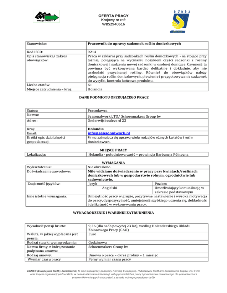 OFERTA PRACY Krajowy nr ref: WBS2940616 Stanowisko: Pracownik do uprawy sadzonek roślin doniczkowych Kod ISCO: Opis stanowiska/ zakres obowiązków: 9214 Praca w szklarni przy sadzonkach roślin doniczkowych - na stojąco przy taśmie, polegająca na wycinaniu nożykiem części sadzonki z rośliny doniczkowej i sadzeniu nowej sadzonki w osobnej doniczce. Czynność ta powinna być wykonywana bardzo delikatnie i dokładnie, aby nie uszkodzić przycinanej rośliny. Również do obowiązków należy pielęgnacja roślin doniczkowych, plewienie i przygotowywanie sadzonek do wysyłki, kontrola końcowa produktu. 6+ Holandia Liczba etatów: Miejsce zatrudnienia – kraj: DANE PODMIOTU OFERUJĄCEGO PRACĘ Status: Nazwa: Pracodawca Seasonalwork LTO/ Schoenmakers Group bv Onderwijsboulevard 22 Adres: Kraj: Email: Krótki opis działalności gospodarczej: Holandia [email protected] Firma zajmująca się uprawą wielu rodzajów różnych kwiatów i roślin doniczkowych. MIEJSCE PRACY Holandia - południowa część – prowincja Barbancja Północna Lokalizacja: WYMAGANIA Nie określono Mile widziane doświadczenie w pracy przy kwiatach/roślinach doniczkowych lub w gospodarstwie rolnym, ogrodnictwie lub sadownictwie. Język Poziom Angielski Umożliwiający komunikację w zakresie podstawowym Umiejętność pracy w grupie, pozytywne nastawienie i wysoka motywacja do pracy, dyspozycyjność, umiejętność szybkiego uczenia się, dokładność i delikatność w wykonywaniu pracy. Wykształcenie: Doświadczenie zawodowe: Znajomość języków: Inne istotne wymagania: WYNAGRODZENIE I WARUNKI ZATRUDNIENIA Wysokość pensji brutto: Waluta, w jakiej wypłacana jest pensja: Rodzaj stawki wynagrodzenia: Nazwa firmy, z którą zostanie podpisana umowa: Rodzaj umowy: Wymiar czasu pracy 9,26 (dla osób powyżej 23 lat), według Holenderskiego Układu Zbiorowego Pracy (CAO) Euro Godzinowa Schoenmakers Group bv Umowa o pracę – okres próbny – 1 miesiąc Pełny wymiar czasu pracy EURES (Europejskie Służby Zatrudnienia) to sieć współpracy pomiędzy Komisją Europejską, Publicznymi Służbami Zatrudnienia krajów UE/ EOG oraz innych organizacji partnerskich, w celu dostarczania informacji, usług pośrednictwa pracy i poradnictwa zawodowego dla pracodawców i pracowników chcących skorzystać z zasady wolnego przepływu osób Czas trwania umowy: (nieokreślony/ określony) Liczba godzin tygodniowo: Data rozpoczęcia: Zakwaterowanie: Inne: Określony – 1 rok Ok. 40, 5 dni w tygodniu Od zaraz - do uzgodnienia z pracodawcą Pracodawca oferuje zakwaterowanie koszt ponosi pracownik - 65 Euro tygodniowo (łącznie z kosztami gazu, wody, elektryczności). Koszt ubezpieczenia ponosi pracownik – 18,50 Euro tygodniowo. SPOSÓB SKŁADANIA WNIOSKU Wymagane dokumenty (list motywacyjny, CV itp.): Język, w którym muszą być sporządzone przedkładane dokumenty: Do kogo należy wysłać dokumenty: (do pracodawcy/ doradcy EURES) CV z aktualnym zdjęciem oraz odręcznie podpisaną zgodą na przetwarzanie danych osobowych Język angielski Gdzie należy wysłać dokumenty: (adres, adres e-mail, nr faksu z kodem kraju itp.) email: [email protected] – w tytule emaila proszę wpisać - Holandia – Pracownik do uprawy przy sadzonek roślin doniczkowych Tel. 85 74 97 235 WUP w Białymstoku ul. Pogodna 22 15-354 Białystok Email do pracodawcy: [email protected] Dane teleadresowe doradcy EURES lub przedstawiciela pracodawcy: Kandydaci proszeni są o przesłanie CV do doradcy EURES z Wojewódzkiego Urzędu Pracy w Białymstoku WAŻNOŚĆ Data publikacji: Termin przedkładania podań o pracę / zakończenia ważności oferty: 08.06.2016 r. Do odwołania Uprzejmie informujemy, że skontaktujemy się wyłącznie z wybranymi kandydatami. UWAGA: 1. Umowa z zagranicznym pracodawcą zostanie zawarta zgodnie z prawem kraju zatrudnienia. Oznacza to, że wszystkie roszczenia odnośnie do warunków, które obejmuje umowa, można kierować wyłącznie do odpowiedniego sądu w kraju zatrudnienia. Publiczne służby zatrudnienia (EURES) nie mogą pośredniczyć ani reprezentować pracownika w sądzie kraju zatrudnienia w przypadku sporu z pracodawcą. 2. Publiczne służby zatrudnienia (EURES) dokładają wszelkich starań, aby zapewnić rzetelność i wiarygodność ofert pracy zgłoszonych w lokalnym urzędzie pracy. Należy wyjaśnić, że oferta pracy została zgłoszona przez stronę trzecią i EURES nie odpowiada za ewentualne rozbieżności między warunkami pracy określonymi w ofercie pracy i warunkami oferowanymi przez potencjalnego pracodawcę. 3. Publiczne służby zatrudnienia (EURES) informują, że będą zbierać, przetwarzać i przekazywać potencjalnym pracodawcom zgodnie z przepisami dotyczącymi ochrony danych osobowych wszystkie dane osobowe dostarczone przez osoby poszukujące pracy. EURES (Europejskie Służby Zatrudnienia) to sieć współpracy pomiędzy Komisją Europejską, Publicznymi Służbami Zatrudnienia krajów UE/ EOG oraz innych organizacji partnerskich, w celu dostarczania informacji, usług pośrednictwa pracy i poradnictwa zawodowego dla pracodawców i pracowników chcących skorzystać z zasady wolnego przepływu osób