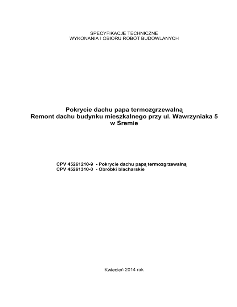 SPECYFIKACJE TECHNICZNE WYKONANIA I OBIORU ROBÓT BUDOWLANYCH Pokrycie dachu papa termozgrzewalną Remont dachu budynku mieszkalnego przy ul. Wawrzyniaka 5 w Śremie CPV 45261210-9 - Pokrycie dachu papą termozgrzewalną CPV 45261310-0 - Obróbki blacharskie Kwiecień 2014 rok 1.WSTĘP 1.1.Przedmiot ST Przedmiotem niniejszej specyfikacji technicznej (ST) są wymagania dotyczące wykonania i odbioru pokryć dachowych papą termozgrzewalną wraz z obróbkami blacharskimi oraz rynnami i rurami spustowymi wykonanymi z blachy ocynkowanej. Obiektem budowy – remontu, jest budynek położony w Śremie przy ulicy Wawrzyniaka 5 Zadanie inwestycyjne prowadzone jest pod nazwą: „Remont dachu budynku mieszkalnego przy ul. Wawrzyniaka 5 w Śremie”. Zamawiającym jest: Gmina Śrem z siedzibą przy placu 20 Października 1 w Śremie. 1.2.Zakres stosowania ST specyfikacja techniczna (ST) będzie stosowana jako dokument przetargowy i kontraktowy przy zlecaniu i realizacji robót wymienionych w pkt. 1.1. 1.3.Zakres robót objętych ST Roboty, których dotyczy specyfikacja, obejmują wszystkie czynności umożliwiające i mające na celu wykonanie pokryć dachowych papą z obróbkami blacharskimi, rynnami i rurami spustowymi oraz elementami wystającymi ponad dach budynku. W ramach prac budowlanych przewiduje się wykonanie następujących robót: - demontaż oraz utylizacja starej papy, - demontaż rynien i rur spustowych, - demontaż obróbek blacharskich, - pokrycie dwuwarstwowe papą zgrzewalną , - obróbki blacharskie z blachy ocynkowanej - rynny i rury spustowe z blachy ocynkowanej 1.4.Określenia podane w niniejszej ST .Określenia podane w niniejszej ST są zgodne z obowiązującymi odpowiednimi normami i przepisami 1.5.Ogólne wymagania dotyczące robót Wykonawca robót jest odpowiedzialny za jakość ich wykonania oraz za zgodność z dokumentacją projektową, SST i poleceniami Inspektora nadzoru. 2.MATERIAŁY 2.1.Ogólne wymagania dotyczące materiałów materiały stosowane do wykonywania pokryć dachowych powinny mieć: - Aprobaty Techniczne lub być produkowane zgodnie z obowiązującymi normami, - Certyfikat lub Deklarację Zgodności z Aprobatą Techniczną lub z PN, - Certyfikat na znak bezpieczeństwa, - Certyfikat zgodności ze zharmonizowaną normą europejską wprowadzoną do zbioru norm polskich, - Na opakowaniach powinien znajdować się termin przydatności do stosowania. papa nawierzchniowa ,papa asfaltowa zgrzewalna wierzchniego krycia, modyfikowana SBS na osnowie z włókniny poliestrowej . Od wierzchniej strony papa pokryta jest gruboziarnistą posypką, zabezpieczona folią z tworzywa sztucznego. Spodnia strona papy pokryta jest folią z tworzywa sztucznego. Wymagania podstawowe - gramatura osnowy – 250g/m2 - grubość – 5,2 + 0,2 - papa modyfikowana SBS, podkładowa o grubości 4 mm. Osnowa - kompozyt szklano-poliestrowy - 200g/m2. Zawartość asfaltu modyfikowanego SBS bez wypełniaczy wynosi 3000 g/m2, siły zrywające 1600/1400 N, wydłużenie 10/10 %, stabilność wymiarów 0,0 %, giętkość - brak rys i pęknięć w temp. - 20 *C, - roztwór asfaltowy wg normy PN-74/B-24622 - blacha stalowa ocynkowana wg normy PN-61/-10245 ,Pn-73/H-92122 ,blacha płaska gr. 0,55mm obustronnie ocynkowana. - Sposób transportu i składowania powinien być zgodny z warunkami i wymaganiami podanymi przez producenta. Wykonawca obowiązany jest posiadać na budowie pełną dokumentację dotyczącą składowanych na budowie materiałów przeznaczonych do wykonywania pokryć dachowych. 2.2.Rodzaje materiałów Wszelkie materiały do wykonywania pokryć dachowych powinny odpowiadać wymaganiom zawarte w normach polskich lub aprobatach ITB dopuszczających dany materiał do powszechnego stosowania w budownictwie. 2.2.1.Papa asfaltowo – polimerowa wierzchniego krycia Wstęga papy powinna być bez dziur i załamań, o równych krawędziach; Przy rozwijaniu rolki niedopuszczalne są uszkodzenia powstałe na skutek sklejenia się papy; Papa powinna mieć jednolite ubarwienie. 2.3.Pakowanie, przechowywanie i transport. Rolki papy powinny być po środku owinięte paskiem papieru szerokości co najmniej 20 cm i związane drutem lub sznurkiem. Na każdej rolce papy powinna być umieszczona nalepka z podstawowymi danymi określonymi w normie i świadectw ie. Rolki papy należy przechowywać w pomieszczeniach krytych, chroniących przed zawilgoceniem i działaniem promieni słonecznych, w odległości co najmniej 120 cm od grzejników. 2.4.Blacha powlekana oraz elementy prefabrykowane z blachy stalowej powlekanej (rynny, rury spustowe) Wszystkie materiały dekarskie powinny być przechowywane i magazynowane zgodnie z instrukcją producenta oraz według odpowiednich norm wyrobu. 3.SPRZĘT 3.1.Sprzęt do wykonywania robót Roboty można wykonywać ręcznie lub przy użyciu innych specjalistycznych narzędzi. 4.TRANSPORT 4.2.1.Lepik asfaltowy i materiały wiążące powinny być pakowane, przechowywane i transportowane w sposób wskazany w normach polskich. 4.2.2.Pakowanie, przechowywanie i transport pap : - rolki papy powinny być po środku owinięte paskiem papieru szerokości co najmniej 20 cm i związane drutem lub sznurkiem grubości co najmniej 0,5mm; - na każdej rolce papy powinna być umieszczona nalepka z podstawowymi danymi określonymi w PN; - rolki papy należy przechowywać w pomieszczeniach krytych, chroniących przed zawilgoceniem i działaniem promieni słonecznych i w odległości co najmniej 120 cm od grzejników; - rolki papy należy układać w stosy (do 1200 szt) w pozycji stojącej, w jednej warstwie. - Odległość między warstwami 80 cm. 5.WYKONANIE ROBÓT 5.1.Wymagania ogólne dla podłoży Podłoża pod pokrycia z papy powinny odpowiadać wymaganiom podanym w normie PN80/B-10240, w przypadku zaś podłoży nie ujętych w tej normie, wymaganiom podanym w aprobatach technicznych. Powierzchnia podłoża powinna być równa, prześwit pomiędzy powierzchnią podłoża ł