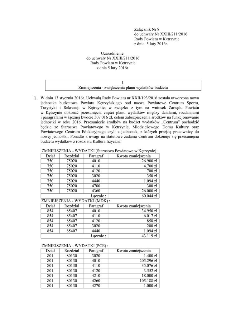 Załącznik Nr 8 do uchwały Nr XXIII/211/2016 Rady Powiatu w Kętrzynie z dnia 5 luty 2016r. Uzasadnienie do uchwały Nr XXIII/211/2016 Rady Powiatu w Kętrzynie z dnia 5 luty 2016r. I. Zmniejszenia - zwiększenia planu wydatków budżetu 1. W dniu 13 stycznia 2016r. Uchwałą Rady Powiatu nr XXII/193/2016 została utworzona nowa jednostka budżetowa Powiatu Kętrzyńskiego pod nazwą Powiatowe Centrum Sportu, Turystyki i Rekreacji w Kętrzynie; w związku z tym na wniosek Zarządu Powiatu w Kętrzynie dokonać przesunięcia części planu wydatków między działami, rozdziałami i paragrafami w łącznej kwocie 507.016 zł, celem zabezpieczenia środków na funkcjonowanie jednostki w roku 2016. Przesunięcie środków na budżet wydatków „Centrum” pochodzić będzie ze Starostwa Powiatowego w Kętrzynie, Młodzieżowego Domu Kultury oraz Powiatowego Centrum Edukacyjnego czyli z jednostek, z których przejdą pracownicy do nowej jednostki. Ponadto z uwagi na statutowe zadania Centrum dokonuje się przesunięcia budżetu wydatków z rozdziału Kultura fizyczna. ZMNIEJSZENIA - WYDATKI (Starostwo Powiatowe w Kętrzynie) : Dział Rozdział Paragraf Kwota zmniejszenia 750 75020 4010 26.900 zł 750 75020 4110 4.700 zł 750 75020 4120 700 zł 750 75020 3020 350 zł 750 75020 4440 1.094 zł 750 75020 4700 300 zł 750 75020 4360 26.000 zł Łącznie : 60.044 zł ZMNIEJSZENIA - WYDATKI (MDK) : Dział Rozdział Paragraf Kwota zmniejszenia 854 85407 4010 34.950 zł 854 85407 4110 6.017 zł 854 85407 4120 858 zł 854 85407 3020 200 zł 854 85407 4440 1.094 zł Łącznie : 43.119 zł ZMNIEJSZENIA - WYDATKI (PCE) : Dział Rozdział Paragraf 801 80130 3020 801 80130 4010 801 80130 4110 801 80130 4120 801 80130 4210 801 80130 4260 801 80130 4270 Kwota zmniejszenia 1.400 zł 205.296 zł 35.076 zł 3.552 zł 18.000 zł 105.188 zł 1.000 zł 4280 315 zł 4300 10.500 zł 4360 1.121 zł 4410 200 zł 4430 1.000 zł 4440 9.299 zł 4480 2.000 zł 4700 300 zł Łącznie : 394.247 zł ZMNIEJSZENIA - WYDATKI: Dział Rozdział Paragraf Kwota zmniejszenia 926 92605 4110 300 zł 926 92605 4120 40 zł 926 92605 4170 1.700 zł 926 92605 4190 6.616 zł 926 92605 4210 300 zł 926 92605 4300 650 zł Łącznie : 9.606 zł ZWIĘKSZENIA – WYDATKI (Powiatowe Centrum Sportu, Turystyki i Rekreacji): Dział Rozdział Paragraf Kwota zwiększenia 801 80195 3020 1.950 zł 801 80195 4010 271.846 zł 801 80195 4110 46.893 zł 801 80195 4120 5.264 zł 801 80195 4170 3.700 zł 801 80195 4190 13.616 zł 801 80195 4210 25.400 zł 801 80195 4260 105.188 zł 801 80195 4270 2.250 zł 801 80195 4280 315 zł 801 80195 4300 11.150 zł 801 80195 4360 1.157 zł 801 80195 4410 200 zł 801 80195 4430 2.300 zł 801 80195 4440 11.487 zł 801 80195 4480 2.000 zł 801 80195 4530 2.000 zł 801 80195 4700 300 zł Łącznie : 507.016 zł 801 801 801 801 801 801 801 801 80130 80130 80130 80130 80130 80130 80130 80130 2. Z uwagi na przeniesienie pracownika z Powiatowego Centrum Edukacyjnego w Kętrzynie do Starostwa Powiatowego w Kętrzynie, dokonać przesunięcia części planu wydatków między działami, rozdziałami i paragrafami w łącznej kwocie 46.090 zł. ZMNIEJSZENIA – WYDATKI (PCE) : Dział Rozdział Paragraf 801 80130 4010 801 80130 4110 801 80130 4120 801 80130 3020 801 80130 4440 Łącznie : Kwota zmniejszenia 37.409 zł 6.570 zł 917 zł 100 zł 1.094 zł 46.090 zł ZWIĘKSZENIA – WYDATKI (Starostwo Powiatowe w Kętrzynie): Dział Rozdział Paragraf Kwota zwiększenia 750 75020 4010 37.409 zł 750 75020 4110 6.570 zł 750 75020 4120 917 zł 750 75020 3020 100 zł 750 75020 4440 1.094 zł Łącznie : 46.090 zł 3. Z dniem 1 stycznia 2016 r. rozporządzeniem Ministra Finansów dokonano zmiany rozporządzenia w sprawie szczegółowej klasyfikacji dochodów, wydatków, przychodów i rozchodów oraz środków pochodzących ze źródeł zagranicznych, które wprowadziło w dziale 755 nowy rozdział „75515 – Nieodpłatna pomoc prawna”. W związku z powyższym na wniosek Skarbnika Powiatu dokonać przesunięcia planu wydatków w wysokości 185.400 zł ujętych w budżecie Powiatu na rok 2016 w dziale 852, rozdział 85295 przeznaczonych na nieodpłatną pomoc prawną dla mieszkańców powiatu zgodnie z ustawą o nieodpłatnej pomocy prawnej i edukacji prawnej z dnia 5 sierpnia 2015r. (Dz.U. z 2015r. poz. 1255), do nowego działu i rozdziału. Ponadto wyodrębnić w ramach budżetu wydatków kwotę 59.946 zł na dotację dla Lokalnej Grupy Działania „Barcja”, która w ramach otwartego konkursu ofert została wybrana do realizacji zadania publicznego w zakresie prowadzenia punktu nieodpłatnej pomocy prawnej dla mieszkańców Powiatu Kętrzyńskiego. ZMNIEJSZENIA – WYDATKI : Dział Rozdział Paragraf 852 85295 4300 Łącznie : Kwota zmniejszenia 185.400 zł 185.400 zł ZWIĘKSZENIA – WYDATKI : Dział Rozdział Paragraf 755 75515 2360 755 75515 4210 755 75515 4300 Łącznie : Kwota zwiększenia 59.946 zł 3.700 zł 121.754 zł 185.400 zł 4. W związku ze zmianą z dniem 1 stycznia 2016r. rozporządzenia w sprawie algorytmu przekazywania środków z Państwowego Funduszu Rehabilitacji Osób Niepełnosprawnych samorządom wojewódzkim i powiatowym (Dz.U. z dnia 23.12.2015r., poz. 2265) dokonać zwiększenia kwoty dotacji ze środków Powiatu dla Warsztatu Terapii Zajęciowej prowadzonego przez Mazurskie Stowarzyszenie na Rzecz Osób Niepełnosprawnych. Zgodnie z art. 10b ust. 6 ustawy z dnia 27 sierpnia 1997r. o rehabilitacji zawodowej i społecznej oraz zatrudnieniu osób niepełnosprawnych (Dz. U. z 2011r. nr 127, poz. 721, z póź. zm.) do obowiązku powiatu należy dofinansowanie kosztów działalności warsztatów terapii zajęciowej w części kwoty utrzymania uczestników nie objętej dofinansowaniem ze środków PFRON. Środki na zwiększenie dotacji przesunąć z planu wydatków Starostwa Powiatowego w Kętrzynie. ZMNIEJSZENIA – WYDATKI : Dział Rozdział Paragraf 750 75020 4360 Łącznie : Kwota zmniejszenia 5.333 z
