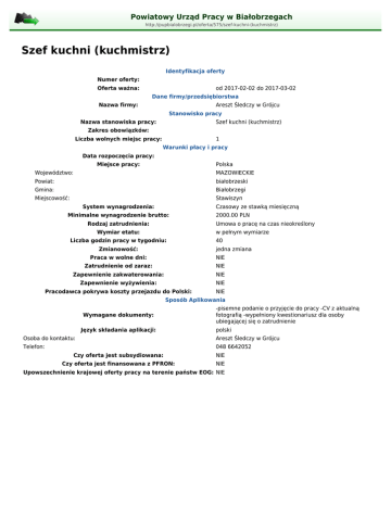 Powiatowy Urząd Pracy w Białobrzegach http://pupbialobrzegi.pl/oferta/575/szef-kuchni-(kuchmistrz) Szef kuchni (kuchmistrz) Identyfikacja oferty Numer oferty: Oferta ważna: od 2017-02-02 do 2017-03-02 Dane firmy/przedsiębiorstwa Nazwa firmy: Areszt Śledczy w Grójcu Stanowisko pracy Nazwa stanowiska pracy: Szef kuchni (kuchmistrz) Zakres obowiązków: Liczba wolnych miejsc pracy: 1 Warunki płacy i pracy Data rozpoczęcia pracy: Miejsce pracy: Polska Województwo: MAZOWIECKIE Powiat: białobrzeski Gmina: Białobrzegi Miejscowość: Stawiszyn System wynagrodzenia: Czasowy ze stawką miesięczną Minimalne wynagrodzenie brutto: Rodzaj zatrudnienia: 2000.00 PLN Umowa o pracę na czas nieokreślony Wymiar etatu: w pełnym wymiarze Liczba godzin pracy w tygodniu: Zmianowość: 40 jedna zmiana Praca w wolne dni: NIE Zatrudnienie od zaraz: NIE Zapewnienie zakwaterowania: NIE Zapewnienie wyżywienia: NIE Pracodawca pokrywa koszty przejazdu do Polski: NIE Sposób Aplikowania Wymagane dokumenty: Język składania aplikacji: -pisemne podanie o przyjęcie do pracy -CV z aktualną fotografią -wypełniony kwestionariusz dla osoby ubiegającej się o zatrudnienie polski Osoba do kontaktu: Areszt Śledczy w Grójcu Telefon: 048 6642052 Czy oferta jest subsydiowana: NIE Czy oferta jest finansowana z PFRON: NIE Upowszechnienie krajowej oferty pracy na terenie państw EOG: NIE