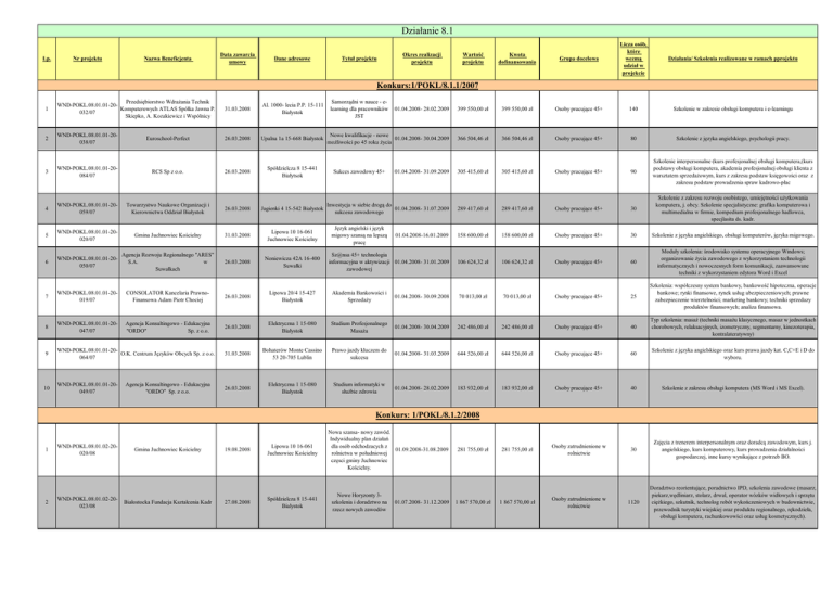 Działanie 8.1 Lp. Nr projektu Nazwa Beneficjenta Data zawarcia umowy Dane adresowe Tytuł projektu Okres realizacji projektu Wartość projektu Kwota dofinansowania Grupa docelowa Licza osób, które wezmą udział w projekcie Działania/ Szkolenia realizowane w ramach pprojektu Konkurs:1/POKL/8.1.1/2007 Samorządni w nauce - elearning dla pracowników JST 1 Przedsiębiorstwo Wdrażania Technik WND-POKL.08.01.01-20Komputerowych ATLAS Spółka Jawna P. 032/07 Skiepko, A. Kozakiewicz i Wspólnicy 31.03.2008 Al. 1000- lecia P.P. 15-111 Białystok 2 WND-POKL.08.01.01-20038/07 Euroschool-Perfect 26.03.2008 Upalna 1a 15-668 Białystok 3 WND-POKL.08.01.01-20084/07 RCS Sp z o.o. 26.03.2008 Spółdzielcza 8 15-441 Białytsok 4 WND-POKL.08.01.01-20059/07 Towarzystwo Naukowe Organizacji i Kierownictwa Oddział Białystok 26.03.2008 Jagienki 4 15-542 Białystok 5 WND-POKL.08.01.01-20020/07 Gmina Juchnowiec Kościelny 31.03.2008 Lipowa 10 16-061 Juchnowiec Kościelny 6 WND-POKL.08.01.01-20050/07 Agencja Rozwoju Regionalnego "ARES" S.A. w Suwałkach 26.03.2008 Noniewicza 42A 16-400 Suwałki 7 WND-POKL.08.01.01-20019/07 CONSOLATOR Kancelaria PrawnoFinansowa Adam Piotr Chociej 26.03.2008 Lipowa 20/4 15-427 Białystok Akademia Bankowości i Sprzedaży 8 WND-POKL.08.01.01-20047/07 Agencja Konsultingowo - Edukacyjna "ORDO" Sp. z o.o. 26.03.2008 Elektryczna 1 15-080 Białystok 9 WND-POKL.08.01.01-20O.K. Centrum Języków Obcych Sp. z o.o. 064/07 31.03.2008 10 WND-POKL.08.01.01-20049/07 26.03.2008 Agencja Konsultingowo - Edukacyjna "ORDO" Sp. z o.o. 01.04.2008- 28.02.2009 399 550,00 zł 399 550,00 zł Osoby pracujące 45+ 140 Szkolenie w zakresie obsługi komputera i e-learningu Nowe kwalifikacje - nowe 01.04.2008- 30.04.2009 możliwości po 45 roku życia 366 504,46 zł 366 504,46 zł Osoby pracujące 45+ 80 Szkolenie z języka angielskiego, psychologii pracy. 01.04.2008- 31.09.2009 305 415,60 zł 305 415,60 zł Osoby pracujące 45+ 90 Szkolenie interpersonalne (kurs profesjonalnej obsługi komputera,(kurs podstawy obsługi komputera, akademia profesjonalnej obsługi klienta z warsztatem sprzedażowym, kurs z zakresu podstaw księgowości oraz z zakresu podstaw prowadzenia spraw kadrowo-płac Inwestycja w siebie drogą do 01.04.2008- 31.07.2009 sukcesu zawodowego 289 417,60 zł 289 417,60 zł Osoby pracujące 45+ 30 Szkolenie z zakresu rozwoju osobistego, umiejętności użytkowania komputera, j. obcy. Szkolenie specjalistyczne: grafika komputerowa i multimedialna w firmie, kompedium profesjonalnego hadlowca, specjlasita ds. kadr. 01.04.2008-16.01.2009 158 600,00 zł 158 600,00 zł Osoby pracujące 45+ 30 Szkolenie z języka angielskiego, obsługi komputerów, języka migowego. Sz@nsa 45+ technologia informacyjna w aktywizacji 01.04.2008- 31.01.2009 zawodowej 106 624,32 zł 106 624,32 zł Osoby pracujące 45+ 60 Moduły szkolenia: środowisko systemu operacyjnego Windows; organizowanie życia zawodowego z wykorzystaniem technologii informatycznych i nowoczesnych form komunikacji, zaawansowane techniki z wykorzystaniem edytora Word i Excel 01.04.2008- 30.09.2008 70 013,00 zł 70 013,00 zł Osoby pracujące 45+ 25 Szkolenia: współczesny system bankowy, bankowość hipoteczna, operacje bankowe; rynki finansowe, rynek usług ubezpieczeniowych; prawne zabezpieczenie wierztelności; marketing bankowy; techniki sprzedazy produktów finansowych; analiza finansowa. Studium Profesjonalnego Masażu 01.04.2008- 30.04.2009 242 486,00 zł 242 486,00 zł Osoby pracujące 45+ 40 Typ szkolenia: masaż (techniki masażu klasycznego, masaz w jednostkach chorobowych, relaksacyjnych, izometryczny, segmentarny, kinezoterapia, kontralateratywny) Bohaterów Monte Cassino 53 20-705 Lublin Prawo jazdy kluczem do sukcesu 01.04.2008- 31.03.2009 644 526,00 zł 644 526,00 zł Osoby pracujące 45+ 60 Szkolenie z języka angielskiego oraz kurs prawa jazdy kat. C,C+E i D do wyboru. Elektryczna 1 15-080 Białystok Studium informatyki w służbie zdrowia 01.04.2008- 28.02.2009 183 932,00 zł 183 932,00 zł Osoby pracujące 45+ 40 Szkolenie z zakresu obsługi komputera (MS Word i MS Excel). 281 755,00 zł Osoby zatrudnienione w rolnictwie 30 Zajęcia z trenerem interpersonalnym oraz doradcą zawodowym, kurs j. angielskiego, kurs komputerowy, kurs prowadzenia działalności gospodarczej, inne kursy wynikające z potrzeb BO. 1 867 570,00 zł Osoby zatrudnienione w rolnictwie 1120 Doradztwo reorientujące, poradnictwo IPD, szkolenia zawodowe (masarz, piekarz,wędliniarz, stolarz, drwal, operator wózków widłowych i sprzętu ciężkiego, szkutnik, technolog robót wykończeniowych w budownictwie, przewodnik turystyki wiejskiej oraz produktu regionalnego, rękodzieła, obsługi komputera, rachunkowowści oraz usług kosmetycznych). Sukces zawodowy 45+ Język angielski i język migowy szansą na lepszą pracę Konkurs: 1/POKL/8.1.2/2008 1 WND-POKL.08.01.02-20020/08 2 WND-POKL.08.01.02-20023/08 Gmina Juchnowiec Kościelny Białostocka Fundacja Kształcenia Kadr 19.08.2008 Lipowa 10 16-061 Juchnowiec Kościelny 27.08.2008 Spółdzielcza 8 15-441 Bialystok Nowa szansa- nowy zawód. Indywidualny plan działań dla osób odchodzacych z 01.09.2008-31.08.2009 rolnictwa w południowej częsci gminy Juchnowiec Kościelny. Nowe Horyzonty 3szkolenia i doradztwo na rzecz nowych zawodów 01.07.2008- 31.12.2009 281 755,00 zł 1 867 570,00 zł 3 WND-POKL.08.01.02-20013/08 Stowarzyszenie "Miasta w Internecie" 25.08.2008 Krakowska 11a 33-100 Tarnów TR@NSPOD- Podlaskie Partnerstwo dla eRozwoju 01.09.2008- 28.02.2010 1 264 200,00 zł 1 264 200,00 zł 4 WND-POKL.08.01.02-20009/08 Stowarzyszenie B-4 20.08.2008 Sokoła 4a/2 35-010 Rzeszów Nowa Rola 01.08.2008- 30.09.2009 564 745,00 zł 564 745,00 zł Osoby zatrudnione: przedstawiciele władztw województwa, jst, samorządów 400 osób i gospodarczych i zwodowych, 100 Szkolenia i warsztaty prezentujące różne aspekty eRozwoju regionalnego przedsiębiorstw kluczowych podmiotów (podniesienie wiedzy na temat inwes