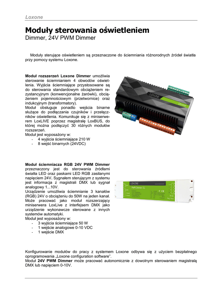 Loxone Moduły sterowania oświetleniem Dimmer, 24V PWM Dimmer Moduły sterujące oświetleniem są przeznaczone do ściemniania różnorodnych źródeł światła przy pomocy systemu Loxone. Moduł rozszerzeń Loxone Dimmer umożliwia sterowanie ściemnianiem 4 obwodów oświetlenia. Wyjścia ściemniające przystosowane są do sterowania standardowym obciążeniem rezystancyjnym (konwencjonalne żarówki), obciążeniem pojemnościowym (przetwornice) oraz indukcyjnym (transformatory). Moduł obsługuje ponadto wejścia binarne służące do podłączania czujników i przełączników oświetlenia. Komunikuje się z miniserwerem LoxLIVE poprzez magistralę LoxBUS, do której można podłączyć 30 różnych modułów rozszerzeń. Moduł jest wyposażony w: - 4 wyjścia ściemniające 210 W - 8 wejść binarnych (24VDC) Moduł ściemniacza RGB 24V PWM Dimmer przeznaczony jest do sterowania źródłami światła LED oraz paskami LED RGB zasilanymi napięciem 24V. Sygnałem sterującym z systemu jest informacja z magistrali DMX lub sygnał analogowy 1...10V. Urządzenie umożliwia ściemnianie 3 kanałów (RGB) 24V o obciążeniu do 50W na jeden kanał. Może pracować jako moduł rozszerzający miniserwera LoxLive z interfejsem DMX jako urządzenie wykonawcze sterowane z innych systemów automatyki. Moduł jest wyposażony w: - 3 wyjścia ściemniające 50 W - 1 wejście analogowe 0-10 VDC - 1 wejście DMX Konfigurowanie modułów do pracy z systemem Loxone odbywa się z użyciem bezpłatnego oprogramowania „Loxone configuration software”. Moduł 24V PWM Dimmer może pracować autonomicznie z dowolnym sterowaniem magistralą DMX lub napięciem 0-10V. Loxone Parametry techniczne: Moduł ściemniacza 24V PWM Dimmer Moduł ściemniacza Loxone Dimmer 12-24 V DC 24 V DC 6,3 A 60 mA 1 dioda LED 2 diody LED Wejścia 1 analogowe 0...10 VDC 8 binarnych 24 VDC Wyjścia 3 ściemniane, każde 50 W 4 ściemniane, każde 210 W Interfejsy DMX - zaciski LoxBUS - zaciski Temperatura 05 C - 40C 0 C - 55C Urządzenie Napięcie zasilania Pobór prądu Wskaźniki Wilgotność Montaż 20-80% bez kondensacji nawierzchniowy Obudowa Wymiary Masa Stopień ochrony Szyna DIN 35 mm tw. sztuczne 185 x 45 x 20 mm 155 x 85 x 49 mm 100 g ok. 500 g IP20