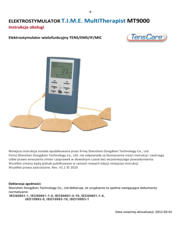 -1- ELEKTROSTYMULATOR T.I.M.E. MultiTherapist MT9000 Instrukcja obsługi Elektrostymulator wielofunkcyjny TENS/EMS/IF/MIC Niniejsza instrukcja została opublikowana przez firmę Shenzhen Dongdixin Technology Co., Ltd. Firma Shenzhen Dongdixin Technology Co., Ltd. nie odpowiada za tłumaczenie treści instrukcji i zastrzega sobie prawo wnoszenia zmian i poprawek w dowolnym czasie bez wcześniejszego powiadomienia. Wszelkie zmiany będą jednak publikowane w ramach nowych edycji niniejszej instrukcji. Wszelkie prawa zastrzeżone. Rev. V1.1 © 2010 Deklaracja zgodności: Shenzhen Dongdixin Technology Co., Ltd deklaruje, że urządzenie to spełnia następujące dokumenty normatywne: Data ostatniej aktualizacji: 2012-03-01 -2- SPIS TREŚCI: 1. INFORMACJE DOTYCZĄCE BEZPIECZEŃSTWA.....................................................................................................................3 1.1 Ogólne...........................................................................................................................................................................3 1.2. Podłoże medyczne .......................................................................................................................................................3 1.3 Wskazania .....................................................................................................................................................................4 1.4 Przeciwwskazania .........................................................................................................................................................4 1.5 Ostrzeżenia, środki ostrożności i reakcje niepożądane ................................................................................................5 2. OPIS URZĄDZENIA...............................................................................................................................................................7 2.1 Panel przedni i tylny......................................................................................................................................................7 2.2 Ekran LCD ......................................................................................................................................................................7 3. SPECYFIKACJA......................................................................................................................................................................8 3.1 Akcesoria.......................................................................................................................................................................8 3.2 Dane techniczne............................................................................................................................................................8 3.3 Charakterystyka impulsów w poszczególnych rodzajach programów .......................................................................10 4. INSTRUKCJA STOSOWANIA ...............................................................................................................................................11 4.1 Baterie.........................................................................................................................................................................11 4.2 Podłączenie przewodów do elektrod .........................................................................................................................11 4.3 Podłącz przewody do urządzenia................................................................................................................................11 4.4 Elektrody.....................................................................................................................................................................12 4.4.2 Zakładanie elektrod na skórę...................................................................................................................................12 4.4.3 Rozmieszczenie elektrod i parametry......................................................................................................................12 4.5 Włączenie....................................................................................................................................................................12 4.6 Wybór trybu stymulacji...............................................................................................................................................12 4.7 Wybór programu ........................................................................................................................................................13 4.8 Regulacja intensywności kanałów ..............................................................................................................................15 4.9 Funkcja blokady bezpieczeństwa................................................................................................................................16 4.10 Zatrzymanie stymulacji .............................................................................................................................................16 4.11 Wyłączenie urządzenia .............................................................................................................................................16 4.12 Wskaźnik niskiego stanu baterii................................................................................................................................16 5. PROGRAMY .......................................................................................................................................................................16 6. CZYSCZENIE I OCHRONA ...................................................................................................................................................17 6.1 Porady związane z ochroną skóry.................