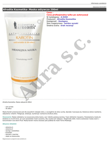 Informacje o produkcie Utworzono 02-03-2017 Afrodita Kozmetika- Maska odżywcza 200ml Cena : Cena profesjonalna tylko po autoryzacji Au r a s. c. Nr katalogowy : A-9268 Producent : Afrodita Kozmetika Dostępność : Dostępny Stan magazynowy : bardzo wysoki Średnia ocena : brak recenzji Afrodita Kozmetika- Maska odżywcza 200ml ❍ ❍ anti wrinkle lift effect Maska Karotin przeznaczona jest dla wszystkich rodzajów skóry, a szczególnie do skóry suchej, dojrzałej i łuszczącej się. Dostarcza skórze nawilżenia, odżywienia i witamin. Pielęgnuje, witalizuje, wyrównuje i wzmacnia strukturę skóry. Stosowanie: Maskę nakładamy na oczyszczoną skórę twarzy, szyi i dekoltu grubszą warstwą. Twarz delikatnie masujemy. Pozostawiamy maskę do działania na 15-20 minut, po czym pozostałość maski usuwamy. Aby uzyskać jak najlepszy i długotrwały efekt, można zastosować maskę razem z koncentratem Cera Derm Fluid. Maskę Karotin można stosować jako podkład do maski Termo Modelage. Aktywne składniki: ❍ ❍ ❍ ❍ ❍ ❍ witamina A witamina E wyciąg z prawoślazu β-karoten ekstrakt z marchwi olejek ze słonecznika Wygenerowano w programie www.oscGold.com Kod: A-9268 s. c. ❍ olejek z soi olejek z kiełków pszenicy olejek eteryczny z bergamotki a ❍ Au r ❍