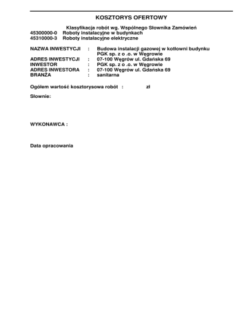 KOSZTORYS OFERTOWY 45300000-0 45310000-3 Klasyfikacja robót wg. Wspólnego Słownika Zamówień Roboty instalacyjne w budynkach Roboty instalacyjne elektryczne NAZWA INWESTYCJI : ADRES INWESTYCJI INWESTOR ADRES INWESTORA BRANŻA : : : : Budowa instalacji gazowej w kotłowni budynku PGK sp. z o .o. w Węgrowie 07-100 Węgrów ul. Gdańska 69 PGK sp. z o .o. w Węgrowie 07-100 Węgrów ul. Gdańska 69 sanitarna Ogółem wartość kosztorysowa robót : Słownie: WYKONAWCA : Data opracowania zł ZESTAWIENIE MATERIAŁÓW Lp. Nazwa 1. uruchomienie systemu bezpieczeństwa gazowego GAZEX 2. punkt redukcyjno - pomiarowy PEGAS-PRPFM25-GM16N-GX-Z7-1 3. asfalt izolacyjny wysokotopliwy IW-80,IW-100 4. asfaltoza P1,P2 5. blachy stalowe grube-walcowane na gorąco St0 grub.5-19 mm 6. drut stalowy do spawania śr. 2.5-4 mm 7. farba olejna nawierzchniowa 8. farba olejna do gruntowania ogólnego stosowania 9. farba ftalowa nawierzchniowa 10. acetylen techniczny rozpuszczony 11. tlen techniczny 12. piasek do zapraw 13. cement portlandzki zwykły 35 14. rury stalowe typ B,przewodowe ogólnego przeznaczenia o sprawdzonej szczelności,o zwykłej dokładności wykonania,z końcami gładkimi,bez zabezpieczenia przed korozją,gatunek stali R, R35,R45 o średnicy nominalnej wlotu i wylotu stacji do 50/50 mm 15. rury stalowe ze szwem przewodowe gwintowane czarne śr.15 mm 16. rury stalowe b szwu przewodowe czarne o śr.nom. 50 mm 17. rury stalowe b.szwu przewodowe czarne o śr.nom. 100 mm 18. rury stalowe b. szwu przewodowe czarne o śr.nom. 25 mm 19. rury stalowe typ S,przewodowe o sprawdzonej szczelności,wymaganym badaniu,o pow.zewn.zabezp.powłoką asfaltową podwójną przekładką nasyconą asfaltem ze stali w gat.St 35X,St 3S o śr.nom. 50 mm 20. złączka nakrętna równoprzelotowa z żeliwa ciągliwego o śr. nominalnej 25 mm 21. złączka nakrętna równoprzelotowa z żeliwa ciągliwego o śr. nominalnej 50 mm 22. dwuzłączka prosta nakrętno-wkrętna z żeliwa ciągliwego o śr. nominalnej 50 mm 23. dwuzłączka prosta nakrętno-wkrętna z żeliwa ciągliwego o śr. nominalnej 25 mm 24. łączniki z żeliwa ciągliwego czarne śr.15 mm 25. łączniki z żeliwa ciągliwego czarne o śr.nom. 50 mm 26. łączniki z żeliwa ciągliwego czarne o śr.nom. 100 mm 27. łączniki z żeliwa ciągliwego czarne o śr.nom. 25 mm 28. Łuk stalowy gładki, czarny, o promieniu gięcia R=3 Dn, kącie wewnętrznym 90 stop., o średnicy 50 mm 29. kurki gazowe mosiężne śr.15 mm 30. filtry gazowe o śr. 50 mm 31. zawory kulowe do gazu gwintowane o śr. 50 mm 32. zawory kulowe do gazu gwintowane o śr. 25 mm 33. uchwyty do rurociągów stalowych o śr.nom. 50 mm 34. uchwyty do rurociągów stalowych o śr.nom. 100 mm 35. uchwyty do rurociągów stalowych o śr.nom. 25 mm 36. welon z włókna szklanego do izolacji antykorozyjnej 37. sznur konopny kręcony czesankowy pojedynczy smołowany 38. detektor gazu DG-12 39. centrala alarmowa MD-2.Z 40. sygnalizator optyczny LED i akustyczny 110dB SL-32 41. puszka natynkowa (pusta) 42. listwa elektroinstalacyjna 43. przewody kabelkowe 44. łącznik Jm Ilość Il wyk. szt 1.0000 1.0000 kpl 1.0000 1.0000 kg kg kg 8.7995 0.1625 24.2992 8.7995 0.1625 24.2992 kg dm3 dm3 0.2703 0.2568 0.3726 0.2703 0.2568 0.3726 dm3 kg m3 m3 t m 0.0939 0.7303 1.1188 0.1100 0.0362 2.7999 0.0939 0.7303 1.1188 0.1100 0.0362 2.7999 m 0.0093 0.0093 m 9.7849 9.7849 m 1.8540 1.8540 m 1.5598 1.5598 m 0.3499 0.3499 szt. 3.0000 3.0000 szt. 1.0000 1.0000 szt. 1.0000 1.0000 szt. 3.0000 3.0000 szt. szt. 0.0082 3.4195 0.0082 3.4195 szt. 0.9001 0.9001 szt. 0.7044 0.7044 szt 2.0000 2.0000 szt. szt. szt. szt. szt. 0.0041 1.0000 1.0000 3.0000 4.7489 0.0041 1.0000 1.0000 3.0000 4.7489 szt. 0.7912 0.7912 szt. 0.9429 0.9429 m2 1.9619 1.9619 kg 2.7000 2.7000 szt szt szt 2.0000 2.0000 2.0000 2.0000 2.0000 2.0000 szt m m szt 1.0204 9.3615 41.5975 6.1197 1.0204 9.3615 41.5975 6.1197 -2- Norma STD Wersja 4.24a Il inw. Cena jedn. Wartość Grupa ZESTAWIENIE MATERIAŁÓW Lp. Nazwa Jm 45. kołki rozporowe 46. materiały pomocnicze szt zł Ilość Il inw. 26.3200 Il wyk. Cena jedn. Wartość Grupa 26.3200 RAZEM Słownie: ZESTAWIENIE ROBOCIZNY Lp. 1. robocizna Nazwa Jm r-g Ilość Cena jedn. 64.3923 RAZEM Wartość Ilość Cena jedn. 3.7299 0.0700 1.0501 RAZEM Wartość Słownie: ZESTAWIENIE SPRZĘTU Lp. 1. żuraw samochodowy 5-6 t 2. samochód dostawczy 0.9 t 3. samochód skrzyniowy do 5 t Nazwa Jm m-g m-g m-g Słownie: -3- Norma STD Wersja 4.24a Lp. Podstawa wyceny Opis Jedn. miary 1 2 3 4 Budowa instalacji gazowej w kotłowni budynku PGK sp. z o.o. w Węgrowie 1 Instalacja gazowa 1 KNR 2-19 0210- Szafkowe stacje redukcyjno-pomiarowe o średnicy no- kpl. d.1 01 minalnej wlotu i wylotu stacji do 50/50 mm 2 KNR 2-19 0217- Przejścia gazociągu przez ściany z betonu żwirowego o przej. d.1 01 grubości do 25 cm dla przyłączy gazowych o śr.nom. 50 mm w tulejach z rur stalowych o śr. 80 mm 3 KNNR 4 0302- Rurociągi w instalacjach gazowych stalowe o połączem d.1 06 niach gwintowanych o śr.nom. 50 mm na ścianach w budynkach niemieszkalnych 4 KNNR 4 0302- Rurociągi w instalacjach gazowych stalowe o połączem d.1 09 niach gwintowanych o śr.nom. 100 mm na ścianach w budynkach niemieszkalnych 5 KNNR 4 0302- Rurociągi w instalacjach gazowych stalowe o połączem d.1 03 niach gwintowanych o śr.nom. 25 mm na ścianach w budynkach niemieszkalnych 6 KNNR 4 0312- Kurki gazowe przelotowe o śr. 50 mm o połączeniach szt. d.1 06 gwintowanych 7 KNNR 4 0312- Filtry gazowe przelotowe o śr. 50 mm o połączeniach szt. d.1 06 gwintowanych analogia 8 KNNR 4 0430- Dwuzłączki o śr. nominalnej 50 mm szt. d.1 06 9 KNNR 4 0312- Kurki gazowe przelotowe o śr. 25 mm o połączeniach szt. d.1 03 gwintowanych 10 KNNR 4 0430- Dwuzłączki o śr. nominalnej 25 mm szt. d.1 03 11 KNNR 2 1404- Malowanie rur stalowych i blaszanych o śr. do 50 mm m d.1 04 12 KNNR 2 1404- Malowanie rur stalowych i blaszanych o śr.50-100 mm m d.1 05 13 KNNR 2 1404- Malo