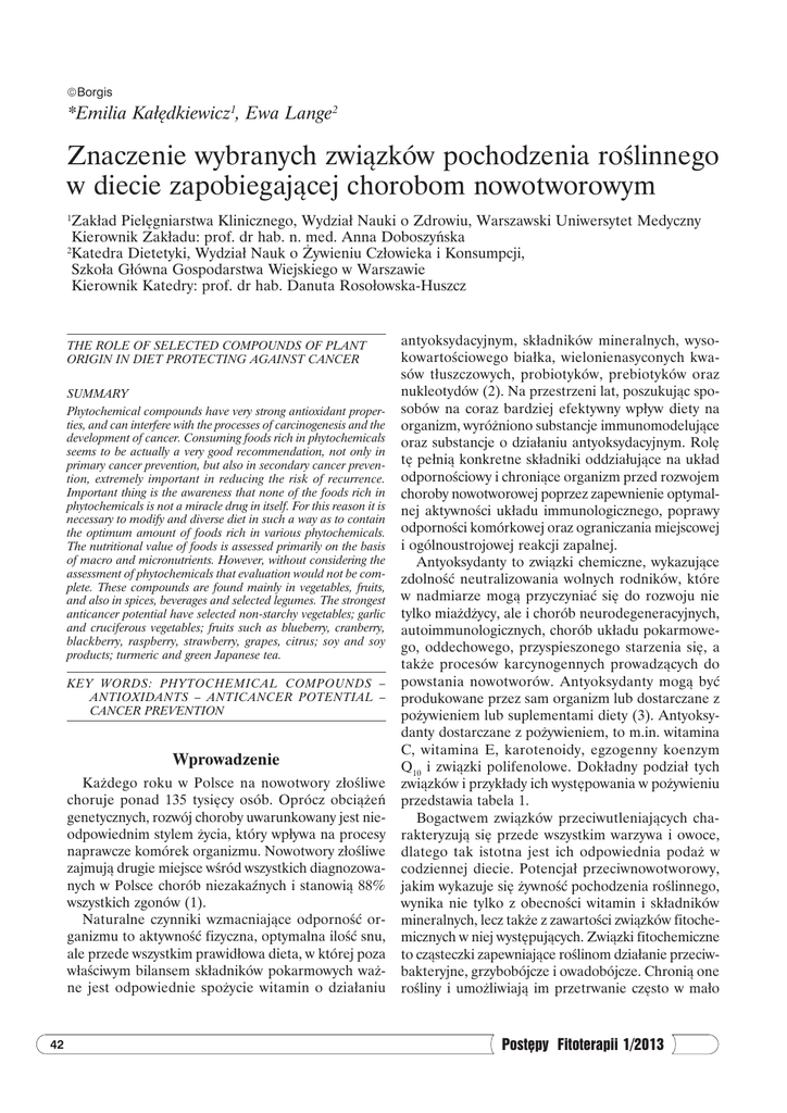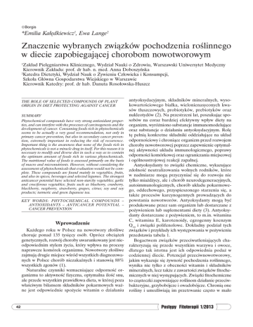 Borgis *Emilia Kałędkiewicz1, Ewa Lange2 Znaczenie wybranych związków pochodzenia roślinnego w diecie zapobiegającej chorobom nowotworowym Zakład Pielęgniarstwa Klinicznego, Wydział Nauki o Zdrowiu, Warszawski Uniwersytet Medyczny Kierownik Zakładu: prof. dr hab. n. med. Anna Doboszyńska 2 Katedra Dietetyki, Wydział Nauk o Żywieniu Człowieka i Konsumpcji, Szkoła Główna Gospodarstwa Wiejskiego w Warszawie Kierownik Katedry: prof. dr hab. Danuta Rosołowska-Huszcz 1 THE ROLE OF SELECTED COMPOUNDS OF PLANT ORIGIN IN DIET PROTECTING AGAINST CANCER SUMMARY Phytochemical compounds have very strong antioxidant properties, and can interfere with the processes of carcinogenesis and the development of cancer. Consuming foods rich in phytochemicals seems to be actually a very good recommendation, not only in primary cancer prevention, but also in secondary cancer prevention, extremely important in reducing the risk of recurrence. Important thing is the awareness that none of the foods rich in phytochemicals is not a miracle drug in itself. For this reason it is necessary to modify and diverse diet in such a way as to contain the optimum amount of foods rich in various phytochemicals. The nutritional value of foods is assessed primarily on the basis of macro and micronutrients. However, without considering the assessment of phytochemicals that evaluation would not be complete. These compounds are found mainly in vegetables, fruits, and also in spices, beverages and selected legumes. The strongest anticancer potential have selected non-starchy vegetables; garlic and cruciferous vegetables; fruits such as blueberry, cranberry, blackberry, raspberry, strawberry, grapes, citrus; soy and soy products; turmeric and green Japanese tea. KEY WORDS: PHYTOCHEMICAL COMPOUNDS – ANTIOXIDANTS – ANTICANCER POTENTIAL – CANCER PREVENTION Wprowadzenie Każdego roku w Polsce na nowotwory złośliwe choruje ponad 135 tysięcy osób. Oprócz obciążeń genetycznych, rozwój choroby uwarunkowany jest nieodpowiednim stylem życia, który wpływa na procesy naprawcze komórek organizmu. Nowotwory złośliwe zajmują drugie miejsce wśród wszystkich diagnozowanych w Polsce chorób niezakaźnych i stanowią 88% wszystkich zgonów (1). Naturalne czynniki wzmacniające odporność organizmu to aktywność fizyczna, optymalna ilość snu, ale przede wszystkim prawidłowa dieta, w której poza właściwym bilansem składników pokarmowych ważne jest odpowiednie spożycie witamin o działaniu 42 antyoksydacyjnym, składników mineralnych, wysokowartościowego białka, wielonienasyconych kwasów tłuszczowych, probiotyków, prebiotyków oraz nukleotydów (2). Na przestrzeni lat, poszukując sposobów na coraz bardziej efektywny wpływ diety na organizm, wyróżniono substancje immunomodelujące oraz substancje o działaniu antyoksydacyjnym. Rolę tę pełnią konkretne składniki oddziałujące na układ odpornościowy i chroniące organizm przed rozwojem choroby nowotworowej poprzez zapewnienie optymalnej aktywności układu immunologicznego, poprawy odporności komórkowej oraz ograniczania miejscowej i ogólnoustrojowej reakcji zapalnej. Antyoksydanty to związki chemiczne, wykazujące zdolność neutralizowania wolnych rodników, które w nadmiarze mogą przyczyniać się do rozwoju nie tylko miażdżycy, ale i chorób neurodegeneracyjnych, autoimmunologicznych, chorób układu pokarmowego, oddechowego, przyspieszonego starzenia się, a także procesów karcynogennych prowadzących do powstania nowotworów. Antyoksydanty mogą być produkowane przez sam organizm lub dostarczane z pożywieniem lub suplementami diety (3). Antyoksydanty dostarczane z pożywieniem, to m.in. witamina C, witamina E, karotenoidy, egzogenny koenzym Q10 i związki polifenolowe. Dokładny podział tych związków i przykłady ich występowania w pożywieniu przedstawia tabela 1. Bogactwem związków przeciwutleniających charakteryzują się przede wszystkim warzywa i owoce, dlatego tak istotna jest ich odpowiednia podaż w codziennej diecie. Potencjał przeciwnowotworowy, jakim wykazuje się żywność pochodzenia roślinnego, wynika nie tylko z obecności witamin i składników mineralnych, lecz także z zawartości związków fitochemicznych w niej występujących. Związki fitochemiczne to cząsteczki zapewniające roślinom działanie przeciwbakteryjne, grzybobójcze i owadobójcze. Chronią one rośliny i umożliwiają im przetrwanie często w mało Postępy Fitoterapii 1/2013 Znaczenie wybranych związków pochodzenia roślinnego w diecie zapobiegającej chorobom nowotworowym Tabela 1. Wybrane antyoksydanty i przykłady ich występowania w pożywieniu (wg 3). Antyoksydant Witaminy Karotenoidy Podział na grupy Podział na podgrupy Przykłady występowania w pożywieniu wit. z gr. A tłuszcze i oleje rybne, wątroba wołowa, masło wit. C papryka, nać pietruszki, brukselka, kalarepa, brokuły, owoce dzikiej róży, czarne porzeczki, cytrusy wit. E oleje roślinne, kiełki pszenicy, migdały, orzechy włoskie i ziemne α i β-karoten marchew, pomidory, papryka, zielone warzywa liściaste likopen pomidory luteina szpinak, sałata, brokuły, seler Koenzym Q10 mięso, ryby, olej sezamowy kwasy fenolowe maliny, czarne porzeczki, poziomki, czerwona cebula, herbata lignany siemię lniane, ziarna zbóż, kawa stilbeny obecne w resweratrolu, przeciwutleniaczu występującym w owocach, pestkach winogron, winie Polifenole flawonoidy katechiny morele, wiśnie, czerwone wino, kakao, zielona herbata flawony seler naciowy, nać pietruszki, ziarna zbóż izoflawony ziarno soi flawanony białe części cytrusów, nasiona brzoskwiń flawanole cebula, herbata antocyjany czerwone wino, ziarna zbóż, winogrona, jagody, żurawina sprzyjającym środowisku. Z uwagi na to, że związki fitochemiczne występują w roślinach w różnych ilościach, różny jest potencjał przeciwnowotworowy roślin. Na przestrzeni lat udało się wyróżnić ro
