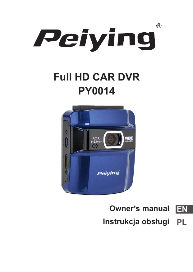 Full HD CAR DVR PY0014 Owner’s manual EN Instrukcja obsługi PL Owner’s manual Introdustion The foreword in pieces Thank you for purchasing the company vehicle traveling data recorder. Before the formal use, please read this manual carefully, to ensure that the correct use of the product. Keep this manual for future use. Infringement of copyright warning Please note that this product is for personal use only, the method of use shall not violate the goods infringe on domestic or international copyright laws. Even recorded images for personal use only, please note that in some cases to use this product to record performances, exhibitions or business activities of the images may infringe the copyright or other legal rights and interests of others. Matters needing attention - please do not open or disassemble the product without authorization, which may lead to electric shock, or equipment damage. If you have any needs, please to service Heart or professional processing. - the product can be used for other USE, such as photography, take, etc. - please do not pile up on the equipment items, don’t pressure according to the screen, otherwise may lead to a broken screen. - do not use sharp objects touch screen, so as not to damage the screen. - do not let children play with the equipment. In the boot state pull out after the car charger from the cigarette lighter socket, equipment will be shut down. If you have the following situation, please Purchase or service center: - the charger is damaged or cable rupture. - the casing damage, damage to the transformer, or revealing the internal parts; Please note that the charger itself also consumes power, in the case of not to use, please pull out in the car charger from the ciga- EN 3 Owner’s manual rette lighter to avoid to steam Car battery discharge. The working conditions - don’t be exposed to high temperatures or direct sunlight, especially in the car. Avoid the equipment into the dust. - avoid in damp environment use. Please note that in a closed environment, the moisture in the air easy to condense and attached to the equipment On. - avoid touch and intense impact. - equipment and its accessories from flammable and explosive, corrosive liquid or gas. - cleaning equipment, please put down from the scaffold before it. Using a soft wet cloth clean screen and equipment surface. - not to remove, modify or repair the equipment. This may lead to equipment damage. Please send special authorization service Center for maintenance. Mixer temperature humidity Equipment normal working temperature is 00 ~ +400, the humidity is 10% ~ 80%. Please place the equipment in a safe place. Transport EN - in the case of sudden changes in temperature or humidity, may cause moisture condensation inside the machine, which can cause Prepare a short circuit. - protect the machine, in order to avoid in the process of transportation into the dust or encounter collisions. - transport equipment, please use the original packaging. Car adapter (car charger) Car adapter all can use in your car cigarette lighter socket (dc 12 or 24 V). 4 Owner’s manual Specification • 3 Mpx camera • Wide angle lens 148° • Max. video resolution: 1920x1080 • Video format: MOV • Image format: JPEG • 2.4” LCD display • microSD card reader (max 32 GB) • Interface: USB 2.0, HDMI • Built-in microphone & speaker • Motion detection Product structure Front view EN 1. MENU/MODE 2. UP 3. DOWN 4. OK 5. Display 5 Owner’s manual Back view 6. Camera 7. Speaker Left view EN 9. POWER 6 10. TF slot Owner’s manual Right view 11. USB 12.HDMI 13.Reset Up view EN 14. HOLDER 7 Owner’s manual Method of use Insert the memory card 1. According to the instructions carefully insert the card into the card slot. Errors or rough insert memory card may lead to memory card or the card slot is broken. 2. Insert the memory card will be saved as image recording. 3. If the device does not recognize the card, please take out the insert to try again. If you still can’t identify, may be the card is damaged Card or device does not support this type of memory card. Please try to replace another memory card. 4. Please pay attention to often change the memory card and copy content to other storage medium. Don’t have burn on the video card Program or run other executable file, it could erase the above data. The start up and shut down of equipment Use the built-in battery, or connect car-mounted charger can boot device or connected to computers. Note: when using the built-in power supply vehicle traveling data recorder, when low battery tips in low electricity, save the video before the automatic shutdown. Reset When the machine is caused by improper operation, abnormal situation, can press reset button again after boot, this machine can be back to normal. EN 8 Switch work mode This machine has three work modes: Video ,Photo and Playback. Press MODE key to switch. Owner’s manual Video mode Video mode icon Wide dynamic range Video segmentation time Recording icon Exposure compensation Resolution Gravity induction video Start/stop video: insert car charger start automatically start video machines. Video process, the upper left corner of the screen in . In the process of video press REC red recording icon flash button to stop recording, press the REC button again, can be video again. Photo mode Picture mode icon ISO Hand shake Image resolution Image quality EN Residual capacity White balance 9 Owner’s manual Photos: aim the camera recording, keep the recorder doesn’t shake, press „OK” button, „ cut” sound, the machine makes a photo shoot. The user can choose different shooting mode according to their own requirements. Playback mode Press „up” or „down” key files were selected, press „OK” button to confirm play. Playback mode: press „menu” button twice to enter the playback menu, under this menu to delete the file and protection, can also choose the slide show. Specification