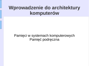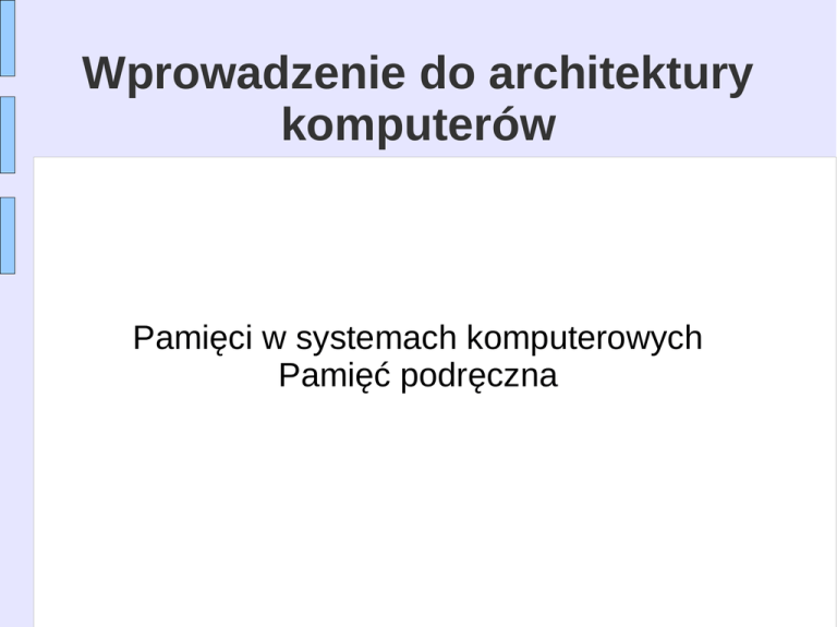 Wprowadzenie do architektury komputerów Pamięci w systemach komputerowych Pamięć podręczna Typy pamięci półprzewodnikowych RAM 4 Pamięć półprzewodnikowa RAM ● ● ● ● ● Pamięć o dostępie swobodnym Odczyt/Zapis Utrata informacji przy braku zasilania Tymczasowe przechowywanie Statyczna lub dynamiczna Operacje na komórce pamięci Pamięć dynamiczna RAM ● ● ● ● ● ● ● ● ● ● Komórka pamięci to kondensator Upływ ładunków Wymaga odświeżania Prosta konstrukcja Mała powierzchnia na jeden bit Stosunkowo tania Wymaga organizacji procesu odświeżania Stosunkowo wolna Stosowana jako pamięć główna operacyjna Ma analogowy charakter ● Poziom ładunku określa wartość Komórka pamięci dynamicznej ● Linia adresowa aktywna przy odczycie i zapisie ● ● Klucz tranzystorowy zamknięty (przepływ prądu) Zapis ● Ustawienie napięcia na linii danej – 1 bit ● ● Uaktywnienie linii adresowej ● ● Wysokie przy 1 niskie przy 0 Ładowanie kondensatora Odczyt ● Linie adresowe ustawione ● ● Ładunek z kondensatora dociera do wzmacniacza ● ● Klucz tranzystorowy załącza się Porównanie z napięciem referencyjnym w celu ustalenia 0 czy 1 Odświeżenie ładunku w kondensatorze Pamięć statyczna RAM ● ● ● ● ● ● ● ● ● ● Bity pamiętane jako stan klucza Nie występuje upływ ładunków Niepotrzebne odświeżanie Bardziej złożona budowa Większa powierzchnia na jeden bit Droższa niż DRAM Niepotrzebne obwody odświeżające Większa szybkość działania Wykorzystywana jako pamięć CACHE Ma naturę cyfrową ● Wykorzystuje przerzutniki Komórka pamięci statycznej ● ● Układ tranzystorów tworzy przerzutnik bistabilny Stan 1 ● ● ● Stan 0 ● ● ● ● ● C1 wysoki, C2 niski T1 T4 wyłączone, T2 T3 załączone C2 wysoki, C1 niski T2 T3 wyłączone, T1 T4 załączone Tranzystory linii adresowej T5 T6 załączone Zapis – wartość na linii B & negacja na linii NOT B Odczyt – wartość na linii B SRAM i DRAM - porównanie ● Obie muszą być zasilane ● ● Komórka pamięci dynamicznej ● ● ● ● ● ● Zasilanie niezbędne do podtrzymania danych Mniejsza, łatwiejsza w wykonaniu Większa gęstość upakowania Tańsza Wymaga odświeżania Większe pojemności Statyczna ● ● Szybsza Cache ROM ● Pamięć stała ● ● ● ● ● Nie traci zawartości przy braku napięcia Używana w układach mikroprogramowania Podprogramy biblioteczne Programy podstawowe (BIOS) Tablice funkcji Typy pamięci ROM ● Zapisane na etapie produkcji ● ● Programowalne jednorazowo (przez użytkownika) ● ● ● Bardzo drogie przy krótkich seriach PROM Potrzebne specjalne programatory Reprogramowalne ● ● ● Kasowalne, wielokrotnie zapisywane EPROM ● Kasowane promieniami UV Kasowalne, wielokrotnie zapisywane EEPROM ● Kasowane i programowane elektrycznie, kasowana pojedyncza komórka Flash memory ● Kasowanie blokami po min. 32kB Organizacja pamięci ● ● ● Układ 16Mbit może być zorganizowany jako 1M słów 16-to bitowych Układ 16Mbit może być zorganizowany jako 16 modułów po 1Mbit Układ 16Mbit może być zorganizowany jako tablica 2048 x 2048 x 4bit ● Redukcja ilości wyprowadzeń adresowych ● Multipleksowanie wierszy i kolumn ● Wystarczy 11 linii adresowych (2 11=2048) ● Dodanie jednej linii pozwala na 4 krotne zwiększenie pojemności Typowy układ 16Mb DRAM (4M x 4) SDRAM ● ● ● ● ● Dostęp synchronizowany zewnętrznym zegarem SDRAM przesyła dane zgodnie z zegarem systemowym, CPU „wie” kiedy dane będą gotowe CPU nie musi czekać, może wykonywać inne operacje Tryb Burst umożliwia sformatowanie danych w strumień i przekazanie ich blokowo DDR-SDRAM wysyła dane dwa razy na 1 takt (narastające i opadające zbocze) SDRAM – cykl odczytu DDR SDRAM ● ● SDRAM wystawia dane raz na 1 takt Double-data-rate SDRAM może wysyłać dwa razy na takt ● Zbocze narastające i zbocze opadające Pamięci zewnętrzne Służą do długotrwałego przechowywania informacji podział: – o dostępie sekwencyjnym • taśmy magnetyczne – o dostępie bezpośrednim • dyski magnetyczne – wymienne – stałe • dyski optyczne – tylko do odczytu – jednokrotnego zapisu – wielokrotnego zapisu – karty pamięciowe - tzw. dyski półprzewodnikowe Parametry pamięci zewnętrznych – pojemność nośnika • zależy od wielkości nośnika i gęstości zapisu – czas dostępu • podawany jest średni czas dostępu – prędkość transmisji • zależy od magistrali łączącej urządzenie z hostem • poprawiana przez dodanie pamięci buforowej – przewidywanie, które dane będą potrzebne – celowa, gdy odczyt z nośnika jest szybszy niż transmisja do hosta – algorytmy opróżniania pamięci buforowej decydują o skuteczności buforowania Budowa fizyczna dysku twardego Budowa dysku twardego • poduszka powietrzna 2-15um, zabezpiecza przed zetknięciem głowicy z dyskiem • automat parkujący głowice • wiele głowic, jedna aktywna – pozycjonowanie (do 50x/sek) • silnikiem krokowym • aktuatorem magnetycznym, kalibrowanym w fabryce – typy głowic • cienkowarstwowe indukcyjne • magnetorezystywne Dyski optyczne • powierzchnia nośnika ma właściwości optyczne powodujące, że światło lasera odbija się i trafia na fotodetektor lub ulega rozproszeniu (pity i landy) • dane zapisywane są na spiralnej ścieżce (ok. 5km długości) – odległość między ścieżkami: 1.6um, szerokość ścieżki 0.5um • gęstość zapisu zależy od średnicy plamki, związanej z długością promieniowania lasera i rozmiarem “pitów” i “landów” Dyski optyczne - napęd • napęd CD zawiera mechanizm napędu płyty oraz układ pozycjonowania lasera • czytniki CD stosują zmienną prędkość obrotową w celu zachowania stałej prędkości liniowej 1.25 m/s • laser pracuje w podczerwieni z falą o długości 780nm • kodowanie nadmiarowe EF