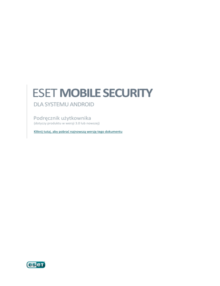 ESET MOBILE SECURITY DLA SYSTEMU ANDROID Podręcznik użytkownika (dotyczy produktu w wersji 3.0 lub nowszej) Kliknij tutaj, aby pobrać najnowszą wersję tego dokumentu Spis treści 1. Wstęp....................................................................3 1.1 Nowe.......................................................................................................3 funkcje 1.2 Wymagania .......................................................................................................3 systemowe 2. Instalacja ....................................................................4 2.1 Instalacja .......................................................................................................4 ze strony internetowej firmy ESET 2.2 Instalacja .......................................................................................................4 ze sklepu Google Play 2.3 Instalacja .......................................................................................................4 ze strony internetowej Amazon 2.4 Kreator .......................................................................................................4 uruchamiania 2.5 Odinstalowanie .......................................................................................................5 3. Licencja ....................................................................6 4. Antywirus ....................................................................7 4.1 Skanowania .......................................................................................................8 automatyczne 4.2 Kwarantanna .......................................................................................................8 4.3 Ignorowane .......................................................................................................8 zagrożenia 4.4 Dzienniki .......................................................................................................8 skanowania 4.5 Ustawienia .......................................................................................................8 zaawansowane 5. Anti-Theft ....................................................................10 5.1 my.eset.com .......................................................................................................10 5.2 Optymalizacja .......................................................................................................10 5.3 Ochrona .......................................................................................................10 SIM 5.3.1 Dodanie nowej .......................................................................10 zaufanej karty SIM 5.4 Zaufani .......................................................................................................10 odbiorcy 5.4.1 Dodanie nowego .......................................................................11 zaufanego odbiorcy 5.5 Polecenia .......................................................................................................11 SMS 5.6 Moje .......................................................................................................11 dane kontaktowe 6. Filtr ....................................................................12 SMS-ów i połączeń ESET MOBILE SECURITY 6.1 Reguły .......................................................................................................12 6.1.1 Dodanie nowej .......................................................................12 reguły 6.2 Historia .......................................................................................................13 7. Ochrona ....................................................................14 przed atakami typu „phishing” 7.1 Historia .......................................................................................................14 8. Audyt ....................................................................15 zabezpieczeń ESET, spol. s r.o. Oprogramowanie ESET Mobile Security zostało opracowane przez firmę ESET, spol. s r.o. Więcej informacji można uzyskać na witrynie www.eset.com. Wszelkie prawa zastrzeżone. Żadna część niniejszej dokumentacji nie może być powielana, przechowywana w systemie pobierania ani przesyłana w żadnej formie bądź przy użyciu jakichkolwiek środków elektronicznych, mechanicznych, przez fotokopiowanie, nagrywanie, skanowanie lub w inny sposób bez uzyskania pisemnego zezwolenia autora. Firma ESET, spol. s r.o. zastrzega sobie prawo do wprowadzania zmian w dowolnych elementach opisanego oprogramowania bez uprzedniego powiadomienia. Dział obsługi klienta: www.eset.com/support WER. 31. 7. 2014 8.1 Monitorowanie .......................................................................................................15 urządzenia 8.2 Audyt .......................................................................................................15 aplikacji 9. Ustawienia ....................................................................16 9.1 Hasło .......................................................................................................16 zabezpieczeń 10. Dział....................................................................17 obsługi klienta 1. Wstęp ESET Mobile Security to kompleksowe rozwiązanie w zakresie bezpieczeństwa, chroniące urządzenie przed nowymi zagrożeniami, filtrujące niechciane połączenia i wiadomości oraz umożliwiające zdalną kontrolę nad urządzeniem w razie jego zgubienia lub kradzieży. 1.1 Nowe funkcje W wersji 3 programu ESET Mobile Security wprowadzono następujące aktualizacje i usprawnienia: Zintegrowano funkcję ESET Anti-Theft z portalem my.eset. com Śledzenie lokalizacji — lokalizacja urządzenia jest teraz wyświetlana na mapie Zdjęcia z kamery — teraz, gdy urządzenie zostanie oznaczone jako brakujące, automatycznie wykonywane są migawki przednią i tylną kamerą Wyświetlanie wiadomości na ekranie — możli