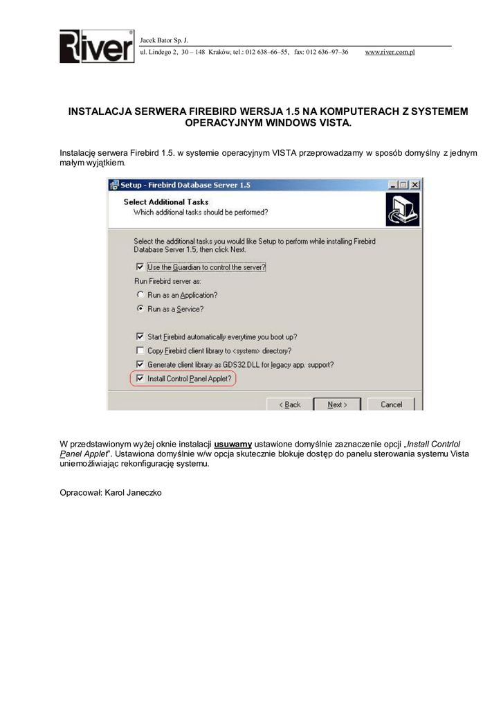 Jacek Bator Sp. J. ul. Lindego 2, 30 – 148 Kraków, tel.: 012 638–66–55, fax: 012 636–97–36 www.river.com.pl INSTALACJA SERWERA FIREBIRD WERSJA 1.5 NA KOMPUTERACH Z SYSTEMEM OPERACYJNYM WINDOWS VISTA. Instalację serwera Firebird 1.5. w systemie operacyjnym VISTA przeprowadzamy w sposób domyślny z jednym małym wyjątkiem. W przedstawionym wyżej oknie instalacji usuwamy ustawione domyślnie zaznaczenie opcji „Install Contrlol Panel Applet”. Ustawiona domyślnie w/w opcja skutecznie blokuje dostęp do panelu sterowania systemu Vista uniemożliwiając rekonfigurację systemu. Opracował: Karol Janeczko