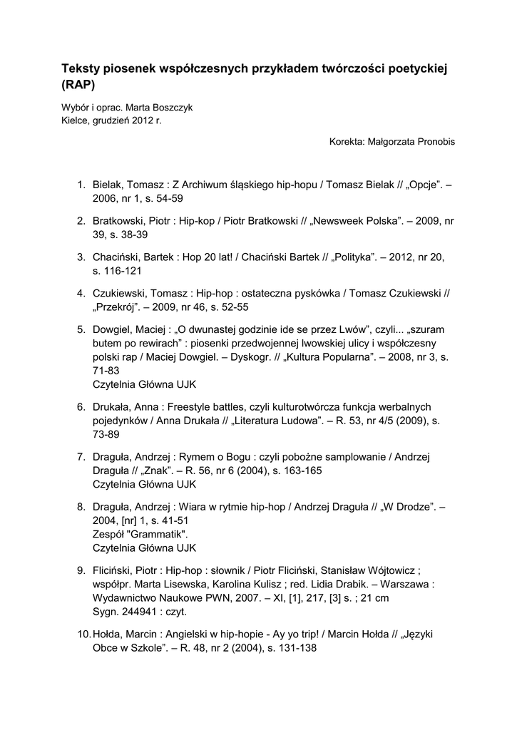 Teksty piosenek współczesnych przykładem twórczości poetyckiej (RAP) Wybór i oprac. Marta Boszczyk Kielce, grudzień 2012 r. Korekta: Małgorzata Pronobis 1. Bielak, Tomasz : Z Archiwum śląskiego hip-hopu / Tomasz Bielak // „Opcje”. – 2006, nr 1, s. 54-59 2. Bratkowski, Piotr : Hip-kop / Piotr Bratkowski // „Newsweek Polska”. – 2009, nr 39, s. 38-39 3. Chaciński, Bartek : Hop 20 lat! / Chaciński Bartek // „Polityka”. – 2012, nr 20, s. 116-121 4. Czukiewski, Tomasz : Hip-hop : ostateczna pyskówka / Tomasz Czukiewski // „Przekrój”. – 2009, nr 46, s. 52-55 5. Dowgiel, Maciej : „O dwunastej godzinie ide se przez Lwów”, czyli... „szuram butem po rewirach” : piosenki przedwojennej lwowskiej ulicy i współczesny polski rap / Maciej Dowgiel. – Dyskogr. // „Kultura Popularna”. – 2008, nr 3, s. 71-83 Czytelnia Główna UJK 6. Drukała, Anna : Freestyle battles, czyli kulturotwórcza funkcja werbalnych pojedynków / Anna Drukała // „Literatura Ludowa”. – R. 53, nr 4/5 (2009), s. 73-89 7. Draguła, Andrzej : Rymem o Bogu : czyli pobożne samplowanie / Andrzej Draguła // „Znak”. – R. 56, nr 6 (2004), s. 163-165 Czytelnia Główna UJK 8. Draguła, Andrzej : Wiara w rytmie hip-hop / Andrzej Draguła // „W Drodze”. – 2004, [nr] 1, s. 41-51 Zespół "Grammatik". Czytelnia Główna UJK 9. Fliciński, Piotr : Hip-hop : słownik / Piotr Fliciński, Stanisław Wójtowicz ; współpr. Marta Lisewska, Karolina Kulisz ; red. Lidia Drabik. – Warszawa : Wydawnictwo Naukowe PWN, 2007. – XI, [1], 217, [3] s. ; 21 cm Sygn. 244941 : czyt. 10. Hołda, Marcin : Angielski w hip-hopie - Ay yo trip! / Marcin Hołda // „Języki Obce w Szkole”. – R. 48, nr 2 (2004), s. 131-138 11. Jabłońska, Urszula : Raperki / Urszula Jabłońska, Magdalena Dubrowska // „Gazeta Wyborcza”. – 2011, nr 35, dod. Wysokie Obcasy nr 6, s. 36-40 12. Janiszewski, Bartosz : Co się stało z naszym rapem? / Bartosz Janiszewki // „Newsweek Polska”. – 2009, nr 15, s. 80-84 13. Kondracka-Zielińska, Anna : Obraz młodego pokolenia w wybranych tekstach hip-hopowych : (na podstawie utworów grup O.S.T.R. i Kaliber 44) / Anna Kondracka-Zielińska // „Albo albo”. – 2004, [z.] 4, s. 145-154 Czytelnia Główna UJK 14. Kuczkowski, Marcin : Przemoc w polskim hip-hopie, na przykładzie płyty „Skandal” zespołu „Molesta” / Marcin Kuczkowski // „Przegląd Socjologiczny”. – T. 52, [z.] 1, (2003), s. 105-134 Czytelnia Główna UJK 15. Książek, Roman : The rise and fall (and rise) of Lech Roch Pawlak (and other spiders from Web) / Roman Eryk Książek // “Opcje”. – 2009, nr 1, s. 56-60 16. Latkowski, Sylwester : Oswojony bunt? : trzy pytania o polski hip-hop / Sylwester Latkowski, Grzegorz Brzozowicz, Bogna Świątkowska // „Dialog”. – R. 50, nr 3 (2005), s. 160-165 17. Lewis, Gregory : Paris' blues : raper z Oakland przekłada swój polityczny gniew na język ulicy / Gregory Lewis ; tł. Mirosław Kocur // „Notatnik Teatralny”. – Nr 12/13, (1996), s. 106-107,109 18. Matkowska , Jolanta : Język piosenki hiphopowej : scenariusz lekcji dla klas gimnazjalnych i ponadgimnazjalnych / Jolanta Matkowska // „Zeszyty Szkolne”. – 2006, nr 3, s. 84-86 19. Matusz, Sławomir : Hip-hop i rap - poezja odrzuconych / Sławomir Matusz // „Śląsk”. – R. 10, nr 9 (2004), s. 66-68 Czytelnia Główna UJK 20. Moch, Włodzimierz : Słownictwo swoiste polskiej subkultury hiphopowej / Włodzimierz Moch // „Język Polski”. – 2002, z. 3, s. 188-198 21. Nawrot, Jacek : Refleksje w pobliżu hip-hopu / Jacek Nawrot // „Problemy Opiekuńczo-Wychowawcze”. – R. 49, nr 10 (2009), s. 43-47 22. Nowacki, Dariusz : Scyzorykiem w mapę / Dariusz Nowacki // „Opcje”. – 2000, nr 4, s. 15-18 23. Organek, Anna : Hip-hop : wybór bibliografii z lat 2000-2009 / oprac. Anna Organek // „Problemy Opiekuńczo-Wychowawcze”. – R. 49, nr 10 (2009), s. 59,64 24. O.S.T.R. : Jesteśmy straconą generacją / Ostry ; rozm. przepr. Paulina Wilk // „Rzeczpospolita (W3)”. – 2007, nr 59, s. A16 25. O.S.T.R. : Małolaty chcą żyć szybko i za friko / Ostry ; rozm. przepr. Paulina Wilk // „Rzeczpospolita (W3)”. – 2009, nr 51, s. A18 26. O.S.T.R. : Po co mi ta cała sława? / O.S.T.R. ; rozm. przepr. Jacek Skolimowski // „Dziennik (Wyd. 2)” . – 2008, nr 54, s. 20 27. Pawlicki, Maciej : Masz prawo być tutaj / Maciej Pawlicki // „Uważam Rze”. – 2012, nr 40, s. 42-44 Dot. filmu „Jesteś bogiem”, reż. Leszek Dawid. 28. Peja : Godne życie penera z Jeżyc / Peja ; rozm. przepr. Łukasz Lubiatowski // „Dziennik (Wyd. 2)”. – 2009, nr 14, dod. Magazyn Dziennika, s. 16-17 29. Rychła, Joanna : Ucieczka, bunt, twórczość : subkultura hip-hopowa w poszukiwaniu autentycznego stylu życia / Joanna Rychła. – Kraków : „Impuls”, 2005. - 121, [3] s. : wykr. ; 24 cm Sygn. 238874 : czyt. 30. Shusterman, Richard : Piękna sztuka RAPowania / Richard Shusterman // „Odra”. – 1995, nr 3, s.23-29 Estetyka muzyki rap. 31. Skolimowski, Jacek : Ostry i dojrzały / Jacek Skolimowski // „Dziennik (Wyd. 2)”. – 2009, nr 49, dod. Kultura, s. 13 Nowa płyta O.S.T.R.: "O.C.B". 32. Szymborska, Marta : Dominacyjność w tekstach hip-hopowych / Marta Szymborska // „Poznańskie Studia Polonistyczne. Seria Językoznawcza”. – T. 14 (2007), s. 91-104 Czytelnia Główna UJK 33. Śliwiński, Piotr : Galernicy mikrofonu / Piotr Śliwiński // „Polonistyka”. – 2006, nr 8, s. 64 Refleksja na temat obecności poezji we współczesnych piosenkach. 34. Wesołowska, Ewa : Kasa w kapturze / Ewa Wesołowska, Artur Grabek // „Newsweek Polska” . – 2004, [nr] 31, s. [34]-[37] Moda na hip hop narodzona w murzyńskiej dzielnicy Nowego Jorku, rozprzestrzenia się w Polsce. 35. Wójtowicz, Stanisław : „A ja wam mówię, że nie zachwyca!” czyli kultura popularna w nowoczesnym liceum / Stanisław Wójtowicz. To wy mi powiedzcie, dlaczeg