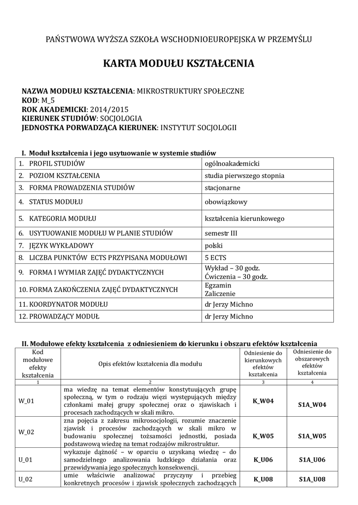PAŃSTWOWA WYŻSZA SZKOŁA WSCHODNIOEUROPEJSKA W PRZEMYŚLU KARTA MODUŁU KSZTAŁCENIA NAZWA MODUŁU KSZTAŁCENIA: MIKROSTRUKTURY SPOŁECZNE KOD: M_5 ROK AKADEMICKI: 2014/2015 KIERUNEK STUDIÓW: SOCJOLOGIA JEDNOSTKA PORWADZĄCA KIERUNEK: INSTYTUT SOCJOLOGII I. Moduł kształcenia i jego usytuowanie w systemie studiów 1. PROFIL STUDIÓW ogólnoakademicki 2. POZIOM KSZTAŁCENIA studia pierwszego stopnia 3. FORMA PROWADZENIA STUDIÓW stacjonarne 4. STATUS MODUŁU obowiązkowy 5. KATEGORIA MODUŁU kształcenia kierunkowego 6. USYTUOWANIE MODUŁU W PLANIE STUDIÓW semestr III 7. JĘZYK WYKŁADOWY polski 8. LICZBA PUNKTÓW ECTS PRZYPISANA MODUŁOWI 11. KOORDYNATOR MODUŁU 5 ECTS Wykład – 30 godz. Ćwiczenia – 30 godz. Egzamin Zaliczenie dr Jerzy Michno 12. PROWADZĄCY MODUŁ dr Jerzy Michno 9. FORMA I WYMIAR ZAJĘĆ DYDAKTYCZNYCH 10. FORMA ZAKOŃCZENIA ZAJĘĆ DYDAKTYCZNYCH II. Modułowe efekty kształcenia z odniesieniem do kierunku i obszaru efektów kształcenia Kod modułowe efekty kształcenia 1 W_01 W_02 U_01 U_02 Opis efektów kształcenia dla modułu Odniesienie do kierunkowych efektów kształcenia Odniesienie do obszarowych efektów kształcenia 2 3 4 ma wiedzę na temat elementów konstytuujących grupę społeczną, w tym o rodzaju więzi występujących między członkami małej grupy społecznej oraz o zjawiskach i procesach zachodzących w skali mikro. zna pojęcia z zakresu mikrosocjologii, rozumie znaczenie zjawisk i procesów zachodzących w skali mikro w budowaniu społecznej tożsamości jednostki, posiada podstawową wiedzę na temat rodzajów mikrostruktur. wykazuje dążność – w oparciu o uzyskaną wiedzę – do samodzielnego analizowania ludzkiego działania oraz przewidywania jego społecznych konsekwencji. umie właściwie analizować przyczyny i przebieg konkretnych procesów i zjawisk społecznych zachodzących K_W04 S1A_W04 K_W05 S1A_W05 K_U06 S1A_U06 K_U08 S1A_U08 w skali mikro. skutecznie komunikuje się z otoczeniem społecznym, współdziała w grupie, przyjmuje różne role społeczne. K_01 K_K02 S1A_K02 III. Treści kształcenia – oddzielnie dla każdej formy zajęć dydaktycznych (W – wykład; C - ćwiczenia; K – konwersatorium; L - laboratorium; PR – projekt, PKZ - praktyka zawodowa; WT – Warsztat) Kod form zajęć dydaktyczny ch 1 W1 W2 W3 W4 W5 W6 W7 W8 W9 W10 W11 Szczegółowy opis treści realizowanych w ramach zajęć wg form zajęć dydaktycznych Liczba godzin 2 3 wykład Wprowadzenie do problematyki MSS. Mikrosocjologia jako dyscyplina socjologiczna. Podstawowe pojęcia i geneza małych struktur. Klasyczne teorie i studia empiryczne w socjologii małych grup społecznych. Założenia teoretyczno-metodologiczne wiedzy o małych strukturach społecznych. Teoretyczne koncepcje mikrostruktur społecznych. Status metodologiczny wyjaśnień mikrosocjologicznych. Struktury bliskiego i dalekiego dystansu (G. Simmel, S. Nowak, J. Szmatka). Człowiek istotą społeczną. Konieczność życia społecznego. Przypadki życia poza społeczeństwem. Osobowość, socjalizacja, postawy. Jednostka i społeczeństwo: Teorie na temat stosunku jednostki do społeczeństwa. Nominalizm a realizm socjologiczny. Przeciwstawne wizje ładu społecznego – indywidualizm versus kolektywizm. Elementy konstytutywne grupy społecznej. Struktura grupy społecznej. Więź społeczna w grupie. Interakcja wewnątrzgrupowa. Podstawowe właściwości małych grup społecznych. Wielkie a małe grupy społeczne. Podstawowe cechy MGS (SA. P. Hare, T. Abel). MGS jako zasadniczy czynnik społecznej ciągłości (P. Rybicki). Rola i znaczenie małych grup społecznych. Typologia małych grup społecznych. Funkcje grupy. Pozycja, status i rola w grupie społecznej. Wewnętrzna struktura roli jednostki. Zespół ról społecznych. Indywidualne i strukturalne mechanizmy przywracania równowagi w zespołach ról społecznych. Struktura statusów. Władza i dominacja w układach statusów. Procesy uogólniania statusu. Koncepcja poziomów oczekiwań. Władza i przywództwo w grupie. Osobowościowe i sytuacyjne determinanty efektywności przywództwa (teoria Freda F. Fiedlera). Struktura przywództwa. Logika działania struktury przywództwa. Komunikacja i łączność w grupie. Typy struktur komunikacyjnych. Wielkość grupy a procesy komunikowania się. 2 2 2 2 2 2 2 2 2 2 2 W12 W13 W14 W15 C1 C2 C3 C4 C5 C6 C7 C8 C9 Razem Determinanty funkcjonowania struktur komunikacyjnych. Procesy i reguły działania struktur socjometrycznych. Czynniki generujące i determinujące funkcjonowanie struktury socjometrycznej. Aspekty praktyczne struktur socjometrycznych. Teoria grup odniesienia. Pojęcie i rodzaje grup odniesienia. Uwarunkowania wyboru grup odniesienia. Eksplanacyjna przydatność teorii grup odniesienia. Teoria integracji i dezintegracji społecznej. Procesy integracji i dezintegracji w grupie społecznej. Przyczyny dezintegracji w grupie i metody zapobiegania procesom dezintegracji społecznej. Działania socjalizacyjne – rola wartości i norm – funkcjonowanie kontroli społecznej. SYMLOG Roberta Balesa jako próba praktycznego podejścia do analizy rzeczywistości społecznej w skali mikro. ćwiczenia Struktura grupy społecznej. Organizacja wewnętrzna grupy. Więź społeczna w grupie. Komunikacja i łączność w grupie. Typologia grup społecznych. Próby systematyzacji grup społecznych. Analiza wybranych przykładów grup. Teoria grup odniesienia. Rodzaje grup odniesienia. Selekcja grup odniesienia - uwarunkowania wyboru. Eksplanacyjna przydatność teorii grup odniesienia. Role społeczne i struktury ról. Pojęcie roli społecznej, wielości ról i zespołu ról, zespołu statusów, sekwencji statusów. Strukturalne źródła braku równowagi w zespole ról. Społeczne mechanizmy stabilizacji zespołu ról. Struktury statusów. Naciski strukturalne kompletu statusów. Komplet statusów a lojalność w stosunku do własnej grupy. Stopień zróżnicowania w kompl