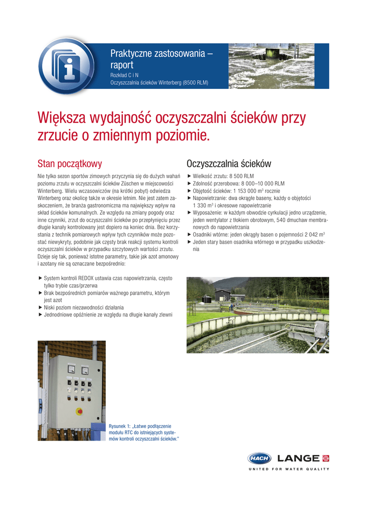 Praktyczne zastosowania – raport Rozkład C i N Oczyszczalnia ścieków Winterberg (8500 RLM) Większa wydajność oczyszczalni ścieków przy zrzucie o zmiennym poziomie. Stan początkowy Oczyszczalnia ścieków Nie tylko sezon sportów zimowych przyczynia się do dużych wahań poziomu zrzutu w oczyszczalni ścieków Züschen w miejscowości Winterberg. Wielu wczasowiczów (na krótki pobyt) odwiedza Winterberg oraz okolicę także w okresie letnim. Nie jest zatem zaskoczeniem, że branża gastronomiczna ma największy wpływ na skład ścieków komunalnych. Ze względu na zmiany pogody oraz inne czynniki, zrzut do oczyszczalni ścieków po przepłynięciu przez długie kanały kontrolowany jest dopiero na koniec dnia. Bez korzystania z technik pomiarowych wpływ tych czynników może pozostać niewykryty, podobnie jak częsty brak reakcji systemu kontroli oczyszczalni ścieków w przypadku szczytowych wartości zrzutu. Dzieje się tak, ponieważ istotne parametry, takie jak azot amonowy i azotany nie są oznaczane bezpośrednio: ¢ Wielkość zrzutu: 8 500 RLM ¢ Zdolność przerobowa: 8 000–10 000 RLM ¢ Objętość ścieków: 1 153 000 m3 rocznie ¢ Napowietrzanie: dwa okrągłe baseny, każdy o objętości 1 330 m3 i okresowe napowietrzanie ¢ Wyposażenie: w każdym obwodzie cyrkulacji jedno urządzenie, jeden wentylator z tłokiem obrotowym, 540 dmuchaw membranowych do napowietrzania ¢ Osadniki wtórne: jeden okrągły basen o pojemności 2 042 m3 ¢ Jeden stary basen osadnika wtórnego w przypadku uszkodzenia ¢ System kontroli REDOX ustawia czas napowietrzania, często tylko trybie czas/przerwa ¢ Brak bezpośrednich pomiarów ważnego parametru, którym jest azot ¢ Niski poziom niezawodności działania ¢ Jednodniowe opóźnienie ze względu na długie kanały zlewni Rysunek 1: „Łatwe podłączenie modułu RTC do istniejących systemów kontroli oczyszczalni ścieków.” Korzyści Moduł N/DN-RTC ma duży wpływ na stabilizację procesu podczas rozkładu związków chemicznych i reguluje stężenie tlenu pomiędzy 1,5 i 2,5 mg/L podczas faz napowietrzania. Inwestycja obliczana jest na podstawie kosztów odzysku przy użyciu parametru ChZT. ¢ Mniejsze stężenie ChZT w zrzucie na wyjściu o > 20 % ¢ Możliwość obniżenia kosztów, a tym samym opłat za ścieki ¢ Wysoki poziom stabilności procesu przy zrzucie o zmiennym poziomie ¢ Pełna przejrzystość dzięki korzystaniu z menu ¢ Łatwe podłączenie do istniejących systemów kontroli w oczyszczalni ścieków Rozwiązanie Dane pomiarowe Dzięki zainstalowaniu dwóch sond procesowych do oznaczania tlenu i azotu amonowego/azotanów, uzyskano wgląd w proces oczyszczania. Proces kontroli napowietrzania w zależności od wielkości zrzutu oparty na module N/DN-RTC wydłuża fazy napowietrzania przy wysokich wartościach związku NH4-N. Ponadto stężenie związków ChZT w zrzucie ścieków zostało ograniczone o ponad 20 %. Czasy napowietrzania dostosowane do wielkości zrzutu ¢ Pomiar azotu amonowego, azotanów i tlenu za pomocą sond procesowych w trybie ciągłym ¢ Proces kontroli napowietrzania w zależności od wielkości zrzutu oparty na module N/DN-RTC i kontroli zawartości tlenu ¢ Mniejsze stężenie związków ChZT w zrzucie o ponad 20 % przyczynia się do obniżenia kosztów, a tym samym opłat za ścieki Rysunek 2: Moduł N/DN kontroluje czasy napowietrzania na podstawie różnicy między zadanymi parametrami i aktualnym stężeniem azotu amonowego i azotanów. System kontroli stężenia tlenu ogranicza przedostawanie się O2 podczas fazy napowietrzania. Ø 82,7 kg/d mg/l Ø 63,1 kg/d 10 paź 10 list 10 gru 11 sty 11 lut 11 mar Ø Q ścieki [m 3 /d] Ø ChZT w zrzucie [kg/d] N/DN RTC Ø Q ścieki [m 3 /d] Ø ChZT w zrzucie [kg/d] 3972 6631 3347 7048 5689 2735 68,32 99,46 52,63 109,95 111,36 54,23 11 paź 11 list 11 gru 12 sty 12 lut 12 mar 4052 2072 7791 7199 4935 4499 51,90 24,99 87,05 79,67 77,63 57,15 Dane informacyjne dotyczące kosztów odzyskiwania przy użyciu parametru ChZT Autor: Sebastian Schneider Technik ds. ścieków Obiekty użyteczności publicznej Winterberg, oczyszczalnia ścieków Züschen DOC043. 60 .30216.Jul14 - 23,7%