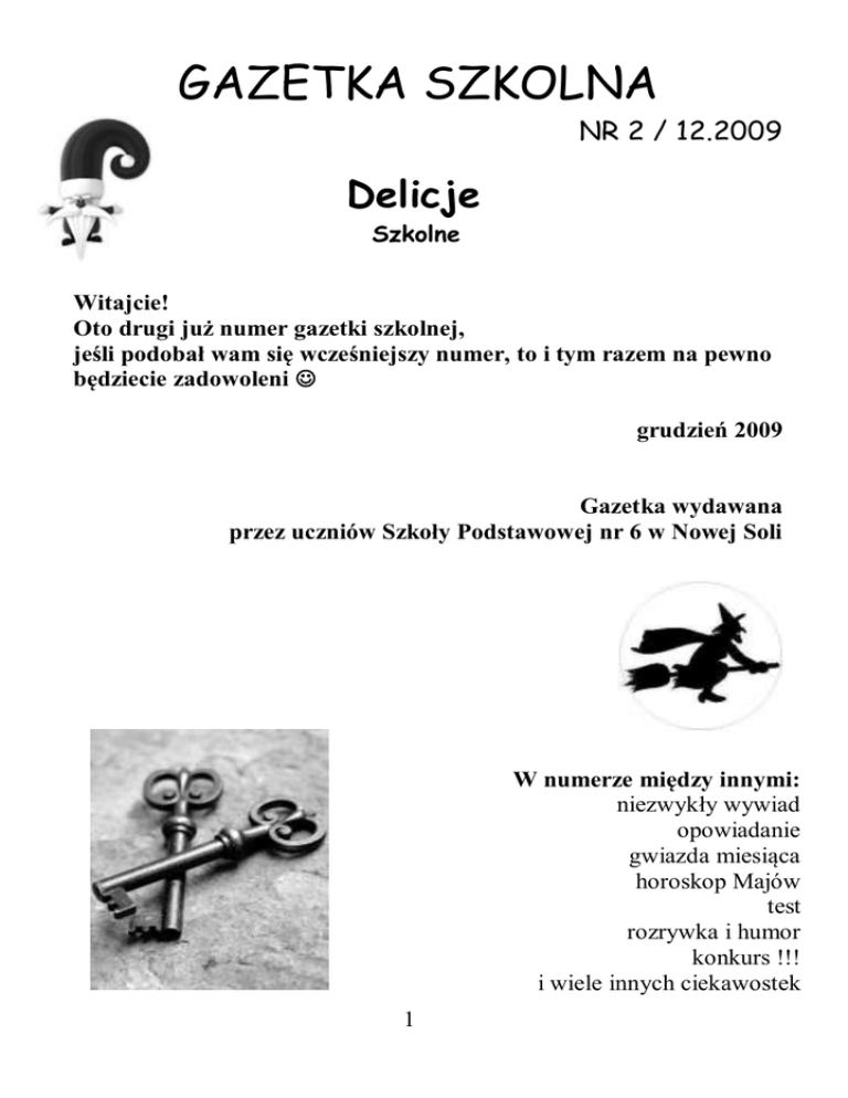 GAZETKA SZKOLNA NR 2 / 12.2009 Delicje Szkolne Witajcie! Oto drugi już numer gazetki szkolnej, jeśli podobał wam się wcześniejszy numer, to i tym razem na pewno będziecie zadowoleni grudzień 2009 Gazetka wydawana przez uczniów Szkoły Podstawowej nr 6 w Nowej Soli W numerze między innymi: niezwykły wywiad opowiadanie gwiazda miesiąca horoskop Majów test rozrywka i humor konkurs !!! i wiele innych ciekawostek 1 Wydarzenia: 25.11. Święto Pluszowego Misia 25 listopada to dzień, kiedy na świecie obchodzi się urodziny pluszowego misia. Miś jest przyjacielem dzieci, więc chyba nie wypada zapomnieć o jego imieninach... Pluszowy miś to jedna z najpopularniejszych zabawek: sympatyczna, miła w dotyku, przyjazna dziecku i oczywiście niezastąpiona jako przytulanka przy zasypianiu...Misie stały się popularne w bajkach, wierszach, piosenkach i dobranockach. Ten ulubieniec wszystkich dzieci obchodzi swoje święto 25 listopada. W 2002 r., dokładnie w setną rocznicę powstania maskotki, ustanowiono Światowy Dzień Pluszowego Misia. Historia pluszaka zaczyna się w 1902 roku, kiedy to ówczesny prezydent Stanów Zjednoczonych, Theodore Roosevelt, będąc na polowaniu, sprzeciwił się zabiciu małego niedźwiadka. Świadek tego zdarzenia, Clifford Berryman, uwiecznił tę historię na rysunku w waszyngtońskiej gazecie, gdzie ujrzał go producent zabawek - Morris Michton. Wykorzystano zdrobniałe imię prezydenta i zaczęto sprzedawać zabawki pod nazwą Teddy Bear, która do dziś w języku angielskim jest określeniem wszystkich pluszowych misiów. Tego dnia Biblioteka Szkolna i Świetlica ZAPRASZAJĄ SERDECZNIE DO WSPÓLNEJ ZABAWY! 30.11. Św. Andrzeja Andrzejki – wieczór wróżb odprawianych w nocy W starożytności i w wiekach średnich wierzono, że przy pomocy magii można ujarzmić demony, złe duchy, czy też diabła i zmusić je do służenia człowiekowi. Wiara ta prowadzi nawet w wiekach średnich do wyróżnienia magii białej, posługującej się duchami dobrymi, oraz czarnej, w której współdziałają duchy złe. Podejrzewani o uprawianie czarnej magii, zwani czarownikami lub czarownicami, podlegali surowym karom i prześladowaniu, kończącym się często spaleniem. W Polsce procesów o czary było mało. Pierwszą czarownicę spalono na początku XVI wieku w Waliszewie k/Poznania. Dopiero pod koniec XVIII wieku skończyła się pogoń za czarownikami i czarownicami. Ostatnim był stos w Szwajcarii, gdzie w płomieniach zginęła biedna służąca - sierota. Oskarżono ją o wrzucenie szpilek do mleka dziewięcioletniej dziewczynki. Prawda była inna - to dziewięciolatka sama powrzucała sobie do kubka szpilki. Stos jednak zapłonął, po raz ostatni. z 29 na 30 listopada, w wigilię świętego Andrzeja, patrona Szkocji, Grecji i Rosji. Dzień ten przypada na końcu lub na początku roku liturgicznego, a więc na czas przełomu szczególnie sprzyjającego magicznym obrzędom. Andrzejki są specjalną okazją do zorganizowania ostatnich hucznych zabaw przed rozpoczynającym się adwentem. Niegdyś wróżby andrzejkowe miały charakter wyłącznie matrymonialny i przeznaczone były dla niezamężnych dziewcząt (męskim odpowiednikiem andrzejek były katarzynki). Początkowo andrzejki traktowano bardzo poważnie, a wróżby odprawiano tylko indywidualnie, w odosobnieniu; w czasach późniejszych przybrały formę zbiorową, organizowaną w grupach rówieśniczych panien na wydaniu, zaś współcześnie przekształciły się w niezobowiązującą zabawę gromadzącą młodzież obojga płci. 2 W ten niezwykły wieczór razem z przyjaciółmi wróżymy i przepowiadamy sobie przyszłość w przedziwny sposób. Proponujemy wam kilka interesujących wróżb: "Na świętego Andrzeja dziewkom z wróżby nadzieja" - woda - panieńskie dziecko; - kwiatuszek - staropanieństwo; - chusteczka - opłakane życie; - liść laurowy - sława; - pieniądze - bogactwo Wróżba z papieru Potnij czystą kartkę na trzynaście równych części. Na sześciu z nich napisz swoje najskrytsze marzenia. Wymieszaj karteczki, nie składaj ich. Wszystkie kartki połóż na dnie dużej szklanej wazy albo miski i powoli wlewaj wodę wąskim strumieniem. Obserwuj kawałki papieru. Który pierwszy wypłynie na powierzchnie, to marzenie pierwsze się spełni. Jeśli najpierw wypłyną czyste karteczki, uzbrój się w cierpliwość, bo będziesz musiał/a trochę poczekać na spełnione marzenia Włos Na wyrwanym z własnej głowy włosie odmierz palcami kolejne litery alfabetu. Jeśli włos jest długi, trzeba powtórzyć liczenie aż do skutku. Litera, która wypadnie na końcu włosa, to inicjał imienia lub nazwiska przyszłego partnera. Owoce Weź jabłko i obierz je ze skórki tak, aby powstała długa ostrużyna ze jabłka. Rzuć ja potem na stół. Z kształtu ostrużyny można odczytać inicjał imienia lub nazwiska ukochanej osoby. Buty Każdy z grona kilku lub najlepiej kilkunastu osób zdejmuje swoje jednego buta i ustawia w rządku. Osoba, której but jako pierwszy wyjdzie za próg (układanie zaczyna się od kątka, który jest przeciwległy do drzwi), pierwsza wyjdzie za mąż lub zdobędzie partnera. Kubki Ukrywamy pod kubkami różne przedmioty. Mieszamy kubki. Potem każdy podnosi jeden kubek. Co pod nim znajdzie? - obrączka - małżeństwo; - różaniec - zakon; - chleb, klucze - dobrobyt; - cukier - dobre, słodkie życie; Lanie wosku Najpierw ostrożnie rozpuść wosk w garnuszku, a potem rozgrzaną ciecz wlewaj powoli przez dziurkę od klucza do sporego naczynia z wodą (np. miski). Przypatrz się dokładnie jak zastyga wylany przez klucz wosk i co przedstawia. Jaki kształt przybierze wosk, taki będzie przyszły mąż lub żona: - figura geometryczna – zrównoważony, spokojny; - drzewo, las - lubi wieś, uczuciowy, sentymentalny; - skała, góra, bryła – gwałtowna, wybuchowa natura, marzy o idealnej dziewczynie; - rycerz, wojsko, koń - zasadniczy charakter; 