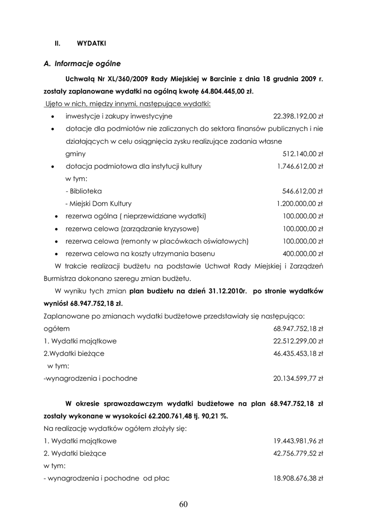 II. WYDATKI A. Informacje ogólne Uchwałą Nr XL/360/2009 Rady Miejskiej w Barcinie z dnia 18 grudnia 2009 r. zostały zaplanowane wydatki na ogólną kwotę 64.804.445,00 zł. Ujęto w nich, między innymi, następujące wydatki: · inwestycje i zakupy inwestycyjne 22.398.192,00 zł · dotacje dla podmiotów nie zaliczanych do sektora finansów publicznych i nie działających w celu osiągnięcia zysku realizujące zadania własne gminy 512.140,00 zł dotacja podmiotowa dla instytucji kultury · 1.746.612,00 zł w tym: - Biblioteka 546.612,00 zł - Miejski Dom Kultury 1.200.000,00 zł · rezerwa ogólna ( nieprzewidziane wydatki) 100.000,00 zł · rezerwa celowa (zarządzanie kryzysowe) 100.000,00 zł · rezerwa celowa (remonty w placówkach oświatowych) 100.000,00 zł · rezerwa celowa na koszty utrzymania basenu 400.000,00 zł W trakcie realizacji budżetu na podstawie Uchwał Rady Miejskiej i Zarządzeń Burmistrza dokonano szeregu zmian budżetu. W wyniku tych zmian plan budżetu na dzień 31.12.2010r. po stronie wydatków wyniósł 68.947.752,18 zł. Zaplanowane po zmianach wydatki budżetowe przedstawiały się następująco: ogółem 68.947.752,18 zł 1. Wydatki majątkowe 22.512.299,00 zł 2.Wydatki bieżące 46.435.453,18 zł w tym: -wynagrodzenia i pochodne 20.134.599,77 zł W okresie sprawozdawczym wydatki budżetowe na plan 68.947.752,18 zł zostały wykonane w wysokości 62.200.761,48 tj. 90,21 %. Na realizację wydatków ogółem złożyły się: 1. Wydatki majątkowe 19.443.981,96 zł 2. Wydatki bieżące 42.756.779,52 zł w tym: - wynagrodzenia i pochodne od płac 18.908.676,38 zł 60 B. Informacje szczegółowe 1. Dział 010 Rolnictwo i łowiectwo Plan dla działu - 702.157,83 zł Wykonanie dla działu - 688.106,95 zł Wykonanie dla działu w % - 98,00% Rozdział: 01022 Zwalczanie chorób zakaźnych zwierząt monitoringowe pozostałości chemicznych i biologicznych w oraz badania tkankach zwierząt o produktach pochodzenia zwierzęcego Plan – 55.300,00 zł · Wykonanie – 45.791,56 zł (82,81%) Paragraf 4300 „Zakup usług pozostałych” Plan – 55.300,00 zł Wykonanie – 45.791,56 zł W ramach tego paragrafu zrealizowano: 1. Wydatki dotyczące wyłapywania bezdomnych zwierząt z terenu Gminy Barcin i ich utrzymywania w schronisku. Rozdział: 01030 Izby rolnicze Plan – 10.000,00 zł · Wykonanie – 9.289,80 zł (92,90%) Paragraf 2850 „Wpłaty gmin na rzecz izb rolniczych w wysokości 2% uzyskanych wpływów z podatku rolnego” Plan – 10.000,00 zł Wykonanie – 9.289,80 zł W ramach tego paragrafu zrealizowano: 1. Wydatki dotyczące zapłaty składek na rzecz Izby Rolniczej, jest to 2% od uzyskanych dochodów z podatku rolnego. Rozdział: 01041 Program rozwoju obszarów wiejskich 2007- 2013 Plan – 202.000,00 zł · Wykonanie – 199.512,83 zł (98,77%) Paragraf 6050 „Wydatki inwestycyjne jednostek budżetowych” Plan – 202.000,00 zł Wykonanie – 199.512,83 zł 61 W ramach tego paragrafu zrealizowano: 1. Zadanie pt. ”Budowa i wyposażenie placu zabaw w Piechcinie” w kwocie 188.012,00 zł. Rozdział: 01095 Pozostała działalność Plan: 434.857,83zł · Wykonanie: 433.512,76 zł (99,69%) Paragraf: 4210 „Zakup materiałów i wyposażenia” Plan: 33.408,30 zł Wykonanie: 32.290,42 zł W ramach tego paragrafu zrealizowano: 1. Wydatki dotyczące zakupów dokonanych w ramach wyodrębnionego funduszu sołeckiego. Zakupiono, między innymi, kuchnię gazowo - elektryczną dla Sołectwa Barcin Wieś, urządzenie GPS (do pomiaru pól) dla Sołectwa Młodocin, sprzęt muzyczny i oświetleniowy oraz dwa namioty ogrodowe dla Sołectwa Pturek, kuchnię gazowo - elektryczną dla Sołectwa Barcin Wieś, szafę do świetlicy wiejskiej w Sołectwie Mamlicz, kuchnię gazowo – elektryczną dla Sołectwa Mamlicz, urządzenie do pomiaru wilgotności zboża dla Sołectwa Młodocin, naczynia dla Sołectwa Młodocin, rolety wewnętrzne do świetlicy wiejskiej w Młodocinie, koszulki piłkarskie tzw. „znaczniki” dla Sołectwa Młodocin, obrusy dla Sołectwa Młodocin, naczynia dla Sołectwa Pturek, wolnostojące ławki dla Sołectwa Sadłogoszcz, urządzenie GPS dla Sołectwa Sadłogoszcz, urządzenie do pomiaru wilgotności zboża dla Sołectwa Sadłogoszcz, zestaw do koszykówki dla Sołectwa Szeroki Kamień. · Paragraf: 4300 „Zakup usług pozostałych” Plan – 21.424,00 zł Wykonanie – 21.196,00 zł W ramach tego paragrafu zrealizowano: 1. Wydatki dotyczące wykonanych działań w zakresie doradztwa i oświaty rolniczej: prenumeraty gazety dla sołtysów pn.: „Wieś Kujawsko – Pomorska” i „Poradnika Radnego i Sołtysa na 2010 r.” oraz wyjazdu szkoleniowego sołtysów w maju 2010 r. 2. Wykonanie ogrodzenia z bramą wokół placu zabaw w Julianowie. · Paragraf: 4430 „Różne opłaty i składki” 62 Plan – 378.225,53 zł Wykonanie – 378.225,53 zł W ramach tego paragrafu zrealizowano: 1. Wydatki dotyczące wypłat akcyzy zawartej w paliwie zużytym do produkcji rolnej. 2. Dział 600 Transport i łączność Plan dla działu – 5.603.527,00 zł Wykonanie dla działu – 3.841.632,82 zł Wykonanie dla działu w % - 68,56% Rozdział: 60016 – Drogi publiczne gminne Plan: 3.740.498,00 zł · Wykonanie: 2.125.322,46 zł (56,82%) Paragraf: 4170 „Wynagrodzenia bezosobowe” Plan – 20.000,00 zł Wykonanie – 20.000,00 zł W ramach tego paragrafu zrealizowano m.in. takie zadania jak: 1. Opracowanie dokumentacji projektowo – kosztorysowej na zadanie: „Remont ul. Lotników w Barcinie wraz z remontem kanalizacji deszczowej”. 18.100,00 zł · Paragraf: 4270 „Zakup usług remontowych” Plan: 1.402.550,00 zł Wykonanie: 1.283.364,39 zł W ramach tego paragrafu zrealizowano m.in. takie zadania jak: 1. Projekt budowlano – wykonawczy na zadanie pn.: „Przebudowa ul. 4-go Stycznia w ciągu drogi gminnej nr 130315C w Barcinie (od skrzyżowania z ul. Polną do przepustu)” 28.610,71 zł 2. Budowa miejsc postojowych dla samochodów o