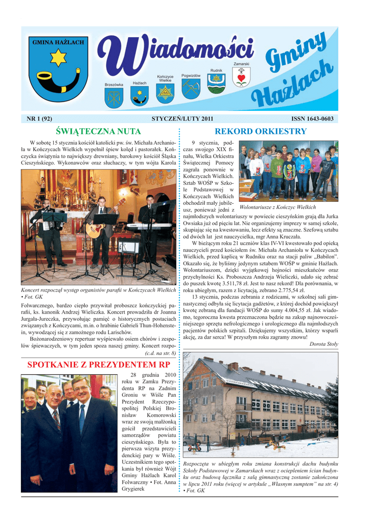 Wiadomości Gminy Hażlach, styczeń/luty 2011 NR 1 (92) 1 STYCZEŃ/LUTY 2011 ISSN 1643-0603 ŚWIĄTECZNA NUTA REKORD ORKIESTRY W sobotę 15 stycznia kościół katolicki pw. św. Michała Archanioła w Kończycach Wielkich wypełnił śpiew kolęd i pastorałek. Kończycka świątynia to największy drewniany, barokowy kościół Śląska Cieszyńskiego. Wykonawców oraz słuchaczy, w tym wójta Karola 9 stycznia, podczas swojego XIX finału, Wielka Orkiestra Świątecznej Pomocy zagrała ponownie w Kończycach Wielkich. Sztab WOŚP w Szkole Podstawowej w Kończycach Wielkich obchodził mały jubileusz, ponieważ jedni z Wolontariusze z Kończyc Wielkich najmłodszych wolontariuszy w powiecie cieszyńskim grają dla Jurka Owsiaka już od pięciu lat. Nie organizujemy imprezy w samej szkole, skupiając się na kwestowaniu, lecz efekty są znaczne. Szefową sztabu od dwóch lat jest nauczycielka, mgr Anna Kruczała. W bieżącym roku 21 uczniów klas IV-VI kwestowało pod opieką nauczycieli przed kościołem św. Michała Archanioła w Kończycach Wielkich, przed kaplicą w Rudniku oraz na stacji paliw „Babilon”. Okazało się, że byliśmy jedynym sztabem WOŚP w gminie Hażlach. Wolontariuszom, dzięki wyjątkowej hojności mieszkańców oraz przychylności Ks. Proboszcza Andrzeja Wieliczki, udało się zebrać do puszek kwotę 3.511,78 zł. Jest to nasz rekord! Dla porównania, w roku ubiegłym, razem z licytacją, zebrano 2.775,54 zł. 13 stycznia, podczas zebrania z rodzicami, w szkolnej sali gimnastycznej odbyła się licytacja gadżetów, z której dochód powiększył kwotę zebraną dla fundacji WOŚP do sumy 4.004,55 zł. Jak wiadomo, tegoroczna kwesta przeznaczona będzie na zakup najnowocześniejszego sprzętu nefrologicznego i urologicznego dla najmłodszych pacjentów polskich szpitali. Dziękujemy wszystkim, którzy wsparli akcję, za dar serca! W przyszłym roku zagramy znowu! Dorota Stoły Koncert rozpoczął występ organistów parafii w Kończycach Wielkich • Fot. GK Folwarcznego, bardzo ciepło przywitał proboszcz kończyckiej parafii, ks. kanonik Andrzej Wieliczka. Koncert prowadziła dr Joanna Jurgała-Jureczka, przywołując pamięć o historycznych postaciach związanych z Kończycami, m.in. o hrabinie Gabrieli Thun-Hohenstein, wywodzącej się z zamożnego rodu Larischów. Bożonarodzeniowy repertuar wyśpiewało osiem chórów i zespołów śpiewaczych, w tym jeden spoza naszej gminy. Koncert rozpo(c.d. na str. 8) SPOTKANIE Z PREZYDENTEM RP 28 grudnia 2010 roku w Zamku Prezydenta RP na Zadnim Groniu w Wiśle Pan Prezydent Rzeczypospolitej Polskiej Bronisław Komorowski wraz ze swoją małżonką gościł przedstawicieli samorządów powiatu cieszyńskiego. Była to pierwsza wizyta prezydenckiej pary w Wiśle. Uczestnikiem tego spotkania był również Wójt Gminy Hażlach Karol Folwarczny • Fot. Anna Grygierek Rozpoczęta w ubiegłym roku zmiana konstrukcji dachu budynku Szkoły Podstawowej w Zamarskach wraz z ociepleniem ścian budynku oraz budową łącznika z salą gimnastyczną zostanie zakończona w lipcu 2011 roku (więcej w artykule „Własnym sumptem” na str. 4) • Fot. GK 2 Wiadomości Gminy Hażlach, styczeń/luty 2011 Projekt współfinansowany przez Unię Europejską w ramach Europejskiego Funduszu Społecznego „ANGIELSKI – NASZA PRZYSZŁOŚĆ” Od 7 kwietnia 2010 roku Gmina Hażlach realizuje projekt pn. „Angielski - nasza przyszłość”, współfinansowany ze środków Unii Europejskiej w ramach Działania 7.3 „Inicjatywy lokalne na rzecz aktywnej integracji” Priorytetu VII „Promocja integracji społecznej” Programu Operacyjnego Kapitał Ludzki Europejskiego Funduszu Społecznego. Projekt jest adresowany do mieszkańców gminy powyżej 30 roku życia, na których czekają darmowe kursy z podstaw języka angielskiego. Projekt współfinansowany przez Unię Europejską w ramach Europejskiego Funduszu Społecznego „Z KOMPUTEREM NA TY” Gmina Hażlach realizuje projekt pn. „Z komputerem na Ty”, współfinansowany ze środków Unii Europejskiej w ramach Działania 9.5 „Oddolne inicjatywy edukacyjne na obszarach wiejskich” Priorytetu IX „Rozwój wykształcenia i kompetencji w regionach” Programu Operacyjnego Kapitał Ludzki Europejskiego Funduszu Społecznego. Projekt, rozpoczęty 25 marca 2010 r., był adresowany do mieszkańców gminy powyżej 30 roku życia, na których czekały darmowe kursy z podstaw obsługi komputera, internetu i poczty elektronicznej. Początek kolejnych zajęć w lokalu GCI w Hażlachu • Fot. GK Ostatnia grupa z Hażlacha z certyfikatami ukończenia kursu • Fot. GK Zajęcia odbywają się w grupach 6-osobowych w lokalu Gminnego Centrum Informacji w Hażlachu. W 2010 roku naukę ukończyły trzy grupy i certyfikaty ukończenia kursu odebrało 18 uczestników. Obecnie trwają zajęcia czwartej i piątej grupy. 14 marca do nauki przystąpi ostatnia, szósta grupa. Jej zajęcia zakończą się 25 maja 2011 roku. GK Zajęcia odbywały się w grupach 10-osobowych w Szkole Podstawowej w Pogwizdowie (dwie grupy) oraz w lokalu Gminnego Centrum Informacji w Hażlachu (trzy grupy). Ostatnie zajęcia zakończyły się 15 lutego 2011 roku. Certyfikaty ukończenia kursu odebrało łącznie 50 osób. GK NARADA W KYJOVIE SPOTKANIE W URZĘDZIE W dniach 12-13 stycznia w Kyjovie na południowych Morawach odbyło się 19 wyjazdowe posiedzenie przedstawicieli samorządów lokalnych Euroregionu Śląsk Cieszyński – Těšinske Slezsko. Uczestniczyli w nim także członkowie władz Gminy Hażlach: wójt Karol Folwarczny Na zdjęciu (od lewej): przewodnicząca Rady oraz przewodnicząca Gminy Grażyna Krehut oraz wójt Karol Fol- Rady Gminy Grażyna warczny • Fot. Edward Kutyła Krehut. Przypomnijmy, że Euroregion to obszar współpracy przygranicznej, który działa na rzecz realizacji interesów miast i gmin, stowarzyszeń oraz osób fizycznych. GK 28 stycznia w sali sesyjnej Urzędu Gminy Hażlach