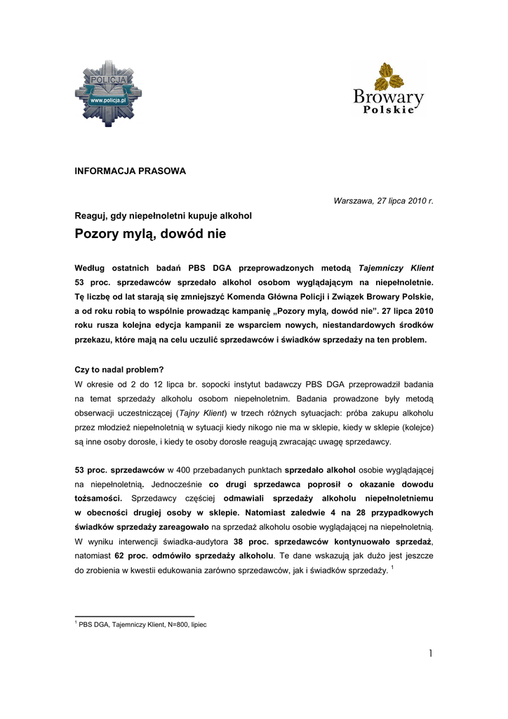 INFORMACJA PRASOWA Warszawa, 27 lipca 2010 r. Reaguj, gdy niepełnoletni kupuje alkohol Pozory mylą, dowód nie Według ostatnich badań PBS DGA przeprowadzonych metodą Tajemniczy Klient 53 proc. sprzedawców sprzedało alkohol osobom wyglądającym na niepełnoletnie. Tę liczbę od lat starają się zmniejszyć Komenda Główna Policji i Związek Browary Polskie, a od roku robią to wspólnie prowadząc kampanię „Pozory mylą, dowód nie”. 27 lipca 2010 roku rusza kolejna edycja kampanii ze wsparciem nowych, niestandardowych środków przekazu, które mają na celu uczulić sprzedawców i świadków sprzedaŜy na ten problem. Czy to nadal problem? W okresie od 2 do 12 lipca br. sopocki instytut badawczy PBS DGA przeprowadził badania na temat sprzedaŜy alkoholu osobom niepełnoletnim. Badania prowadzone były metodą obserwacji uczestniczącej (Tajny Klient) w trzech róŜnych sytuacjach: próba zakupu alkoholu przez młodzieŜ niepełnoletnią w sytuacji kiedy nikogo nie ma w sklepie, kiedy w sklepie (kolejce) są inne osoby dorosłe, i kiedy te osoby dorosłe reagują zwracając uwagę sprzedawcy. 53 proc. sprzedawców w 400 przebadanych punktach sprzedało alkohol osobie wyglądającej na niepełnoletnią. Jednocześnie co drugi sprzedawca poprosił o okazanie dowodu toŜsamości. Sprzedawcy częściej odmawiali sprzedaŜy alkoholu niepełnoletniemu w obecności drugiej osoby w sklepie. Natomiast zaledwie 4 na 28 przypadkowych świadków sprzedaŜy zareagowało na sprzedaŜ alkoholu osobie wyglądającej na niepełnoletnią. W wyniku interwencji świadka-audytora 38 proc. sprzedawców kontynuowało sprzedaŜ, natomiast 62 proc. odmówiło sprzedaŜy alkoholu. Te dane wskazują jak duŜo jest jeszcze do zrobienia w kwestii edukowania zarówno sprzedawców, jak i świadków sprzedaŜy. 1 1 PBS DGA, Tajemniczy Klient, N=800, lipiec 1 Jak łatwo wywnioskować z przeprowadzonych badań, sprzedaŜ alkoholu niepełnoletnim to wciąŜ powszechne zjawisko. Niestety małoletni najczęściej sięgają po alkohol dzięki przyzwoleniu dorosłych, którzy zdają się nie widzieć problemu. Osoby poniŜej 18. roku Ŝycia w wielu sklepach mogą bez przeszkód kupić alkohol. Nie wszyscy sprzedawcy pytają ich o dowody. Dlatego tak waŜne są działania mające na celu uświadomienie sprzedawcom oraz świadkom sprzedaŜy, Ŝe sprzedaŜ alkoholu nieletnim moŜe prowadzić do powaŜnych konsekwencji – mówi Danuta Gut, Dyrektor Biura Zarządu ZPPP Browary Polskie. Dlaczego to takie waŜne Istotą tego problemu jest jego złoŜoność. Według badań zrealizowanych w lipcu br. przez PBS DGA, ponad 67 % Polaków uwaŜa, Ŝe problem sprzedaŜy alkoholu niepełnoletnim jest bardzo waŜny. SprzedaŜ alkoholu niepełnoletnim jest uznawana za przestępstwo przez 78% Polaków. A postępowanie osoby sprzedającej sprzedaŜ osobom nieletnim potępia 79% Polaków. 57% Polaków popiera równieŜ kampanie informacyjne dotyczące problemu sprzedaŜy alkoholu niepełnoletnim. 2 Mimo tego duŜa liczba sprzedawców sprzedaje alkohol niepełnoletnim. Sytuacja taka moŜe wynikać z nieświadomości, jakie konsekwencje niesie za sobą spoŜywanie alkoholu przez niepełnoletnich. Według statystyk Komendy Głównej Policji w 2009 roku w ramach działań profilaktycznych policjanci w całej Polsce ujawnili 19 252 małoletnich pod wpływem alkoholu. Policja doprowadziła do izb wytrzeźwień 1 734 osób, które nie ukończyły 18 roku Ŝycia. Wśród nich było 207 dziewcząt. Zgodnie z obowiązującymi w Polsce przepisami istnieje zakaz sprzedaŜy napojów alkoholowych osobom, które nie ukończyły 18 roku Ŝycia. Łamanie tego zakazu jest przestępstwem. Chcemy przypominać sprzedawcom, Ŝe prawo daje im moŜliwość sprawdzenia wieku kupującego. W przypadku wątpliwości co do pełnoletniości nabywcy, sprzedający lub podający napoje alkoholowe ma prawo Ŝądać okazania dokumentu toŜsamości. Niestety, jak pokazuje praktyka, często zakaz ten nie jest przestrzegany. Z jednej strony wynika to z niedostatecznej świadomości prawnej sprzedawców, chęci finansowego zysku, braku wyobraźni, co do potencjalnych skutków nawet jednorazowego spoŜycia alkoholu przez młodego człowieka. Brakuje takŜe w Polsce wyraźnej i stanowczej dezaprobaty ze strony dorosłych 2 PBS DGA, Omnibus, N=1000, 18+, lipiec 2 oraz środowisk opiniotwórczych dla takich praktyk. Stąd z punktu widzenia Policji istotnym celem kampanii „Pozory mylą, dowód nie” będzie zwrócenie społecznej uwagi na problem spoŜywania alkoholu przez dzieci i młodzieŜ oraz wzmocnienie dezaprobaty dla tego procederu – mówi nadinsp. Waldemar Jarczewski, Zastępca Komendanta Głównego Policji. Statystyki Komendy Głównej Policji z 2009 roku pokazują równieŜ, Ŝe ponad 2 763 nieletnich sprawców popełniło czyny karalne pod wpływem alkoholu. W tym między innymi zabójstwa, rozboje, bójki, pobicia, kradzieŜe. Stanowi to ponad 16,3 proc. przebadanych na obecność alkoholu w organizmie sprawców. W 2009 r. wśród sprawców zabójstw znalazło się 23 nieletnich. Stan trzeźwości ustalono u 11 z nich – 3 okazało się nietrzeźwych. Wśród sprawców bójek i pobić znalazło się 6 324 nieletnich. Stan trzeźwości ustalono u 2 224 z nich – 267 okazało się nietrzeźwych. Wśród sprawców uszkodzeń ciała znalazło się 2 966 nieletnich. Stan trzeźwości ustalono u 1 282 z nich – 96 okazało się nietrzeźwych. Wśród sprawców rozbojów, kradzieŜy rozbójniczych i wymuszeń rozbójniczych znalazło się 4 286 nieletnich. Stan trzeźwości ustalono u 1 569 z nich – 259 okazało się nietrzeźwych. Konsekwentna edukacja Kolejna odsłona ogólnopolskiej kampanii edukacyjnej „Pozory mylą, dowód nie” organizowanej przez Komendę Główną Policji oraz Związek Browary Polskie będzie prowadzona przy wsparciu Europejskiej Fundacji Kultury Miejskiej. Efekty pracy Fundacji będzie moŜna zobaczyć na terenie całej Polsk