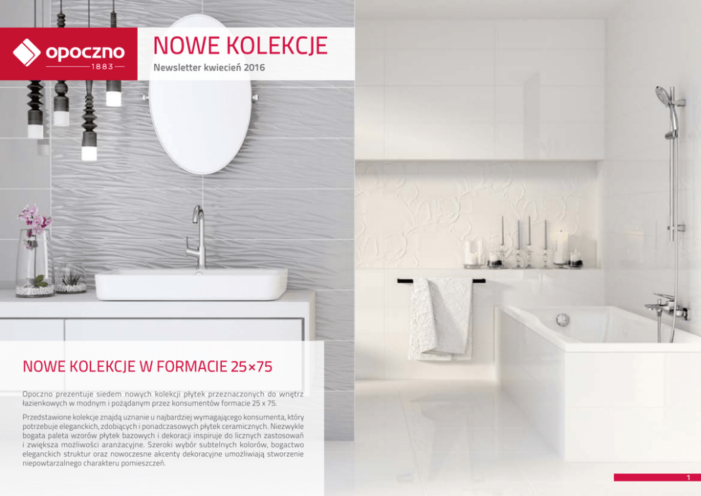 NOWE KOLEKCJE Newsletter kwiecień 2016 NOWE KOLEKCJE W FORMACIE 25 × 75 Opoczno prezentuje siedem nowych kolekcji płytek przeznaczonych do wnętrz łazienkowych w modnym i pożądanym przez konsumentów formacie 25 x 75. Przedstawione kolekcje znajdą uznanie u najbardziej wymagającego konsumenta, który potrzebuje eleganckich, zdobiących i ponadczasowych płytek ceramicznych. Niezwykle bogata paleta wzorów płytek bazowych i dekoracji inspiruje do licznych zastosowań i zwiększa możliwości aranżacyjne. Szeroki wybór subtelnych kolorów, bogactwo eleganckich struktur oraz nowoczesne akcenty dekoracyjne umożliwiają stworzenie niepowtarzalnego charakteru pomieszczeń. 1 NOWE KOLEKCJE Spis treści Structure Pattern modern Parisen s. 3 Artistico modern s. 19 Stone Island s. 7 modern s. 24 Ravina Magic Look modern modern s. 11 classic s. 28 Geometrica modern s. 15 22 NOWE KOLEKCJE Aranżacje Structure Pattern modern 3 NOWE KOLEKCJE Aranżacje Structure Pattern modern 4 Structure Pattern NOWE KOLEKCJE Podstawowe informacje modern Structure Pattern to monochromatyczna biało-szara kolekcja uzupełniona płytkami strukturalnymi. Płytki te zdobione są dwoma rodzajami motywów. Pierwszy to delikatny zarys kwiatów wyłaniający się z gładkiego, błyszczącego tła. Drugi falisty, przypominający w swej formie korę drzewa. Kolekcja uzupełniona została listwą szklaną, która dodaje całości nutki urozmaicenia. Całość zadowoli zarówno tych, którzy preferują minimalistyczne wnętrza jak i miłośników ceniących gustowne akcenty dyskretnie dekorujące wnętrze. Rozmiar: 25 × 75; 42 × 42 Ilość elementów: 7 Kolor płytek podstawowych: Rodzaj powierzchni: Wzór: monokolor Technologia: płytki ścienne: monoporoza płytki podłogowe: gres szkliwiony Zastosowanie: do użytku wewnętrznego (łazienki) biały, szary płytki ścienne: błyszczące płytki podłogowe: matowe 5 Structure Pattern NOWE KOLEKCJE Oferta / portfolio modern WHITE glossy 25 × 75 OP675-001-1 GREY glossy 25 × 75 OP685-003-1 STRUCTURE PATTERN white wave structure 25 × 75 OP365-006-1 STRUCTURE PATTERN grey wave structure 25 × 75 OP365-008-1 STRUCTURE PATTERN white flower structure 25 × 75 OP365-004-1 5 GLASS heather border 3 × 75 OD685-011 WHITE satin 42 × 42 OP365-016-1 płytka mrozoodporna 5 klasa ścieralności 6 NOWE KOLEKCJE Aranżacje Artistico modern 7 NOWE KOLEKCJE Aranżacje Artistico modern 8 Artistico NOWE KOLEKCJE Podstawowe informacje modern Artistico to kolekcja, w której możemy rozsmakować się w kojących kolorach ciepłej bieli złamanej beżem oraz niebanalnych odcieniach błękitu. Całość oparta na motywie poziomych pasów, podkreślających wydłużony format płytek oraz jako poziomy relief na płytkach strukturalnych. Urozmaiceniem kolekcji jest dekor przywodzących na myśl artystyczny obraz burzowego nieba. Kolekcję uzupełniają szklane listwy w kolorze kobaltowym i wrzosowym. Rozmiar: 25 × 75; 42 × 42 Ilość elementów: 8 Kolor płytki podstawowej: biały, błękitny Rodzaj powierzchni: płytki ścienne: błyszczące płytki podłogowe: matowe Wzór: geometryczny Technologia: płytki ścienne: monoporoza płytki podłogowe: gres szkliwiony Zastosowanie: do użytku wewnętrznego (łazienki) 9 Artistico NOWE KOLEKCJE Oferta / portfolio modern STRIPES white 25 × 75 OP681-005-1 STRIPES blue 25 × 75 OP681-001-1 STRIPES white structure 25 × 75 OP681-006-1 STRIPES blue structure 25 × 75 OP681-002-1 ARTISTICO blue inserto geo 25 × 75 OD446-001 5 STRIPES white 42 × 42 OP681-009-1 GLASS cobalt border 3 × 75 OD685-012 GLASS heather border 3 × 75 OD685-011 płytka mrozoodporna 5 klasa ścieralności 10 NOWE KOLEKCJE Aranżacje Magic Look modern 11 NOWE KOLEKCJE Aranżacje Magic Look modern 12 Magic Look NOWE KOLEKCJE Podstawowe informacje modern Kolekcja Magic Look to nowocześnie skrojona geometryczna kompozycja. Inspirowana wyglądem naturalnego kamienia o szlachetnym rysunku, jednorodnej strukturze i czystej barwie. Płytki bazowe oferowane są w jasnym szarym kolorze w wersji gładkiej, błyszczącej i strukturalnej. Struktura „squares” wyglądem przypominająca przestrzenne kompozycje origami. Całość uzupełniona finezyjnym, geometrycznym dekorem połyskującym magicznymi, świetlistymi kolorami. Rozmiar: 25 × 75; 42 × 42; 59,4 × 59,4 Ilość elementów: 7 Kolor płytek podstawowych: szary Rodzaj powierzchni: płytki ścienne: błyszczące płytki podłogowe: matowe Wzór: kamień Technologia: płytki ścienne: monoporoza płytki podłogowe: gres szkliwiony, gres zdobiony w masie Zastosowanie: do użytku wewnętrznego (łazienki) 13 Magic Look NOWE KOLEKCJE Oferta / portfolio modern MAGIC LOOK grey inserto geo 25 × 75 OD447-001 CLOUD grey glossy squares structure 25 × 75 OP680-003-1 GLASS cobalt border 3 × 75 OD685-012 GLASS heather border 3 × 75 OD685-011 CLOUD grey glossy 25 × 75 OP680-002-1 5 CLOUD grey satin 42 × 42 OP697-003-1 R10 DRY RIVER light grey 59,4 × 59,4 OP622-004-1 płytka mrozoodporna R10 5 klasa antypoślizgowości klasa ścieralności 14 NOWE KOLEKCJE Aranżacje Geometrica modern 15 NOWE KOLEKCJE Aranżacje Geometrica modern 16 Geometrica NOWE KOLEKCJE Podstawowe informacje modern Kolekcja Geometrica to naturalny obraz kamienia w odcieniach ciepłego beżu. Natura wabi i zachwyca stanowiąc źródło inspiracji. Błyszczące płytki podstawowe oferowane są w wersji gładkiej oraz nowoczesnej, strukturalnej. Najbardziej charakterystycznym elementem kolekcji jest nietypowe inserto geometryczne. Układ trójkątów imitujących naturalne drewno przeplatanych z wzorem delikatnego kamienia stwarza wrażenie trójwymiarowości dekoru. Uzupełnieniem kolekcji są kolorystycznie dopasowane uniwersalne inserta szklane. Rozmiar: 25 × 75; 42 × 42; 59,8 × 59,8 Ilość elementów: 7 Kolor płytki podstawowej: beżowy Rodzaj powierzchni: płytki ścienne: błyszczące płytki podłogowe: matowe Wzór: geometryczny Technologia: płytki 