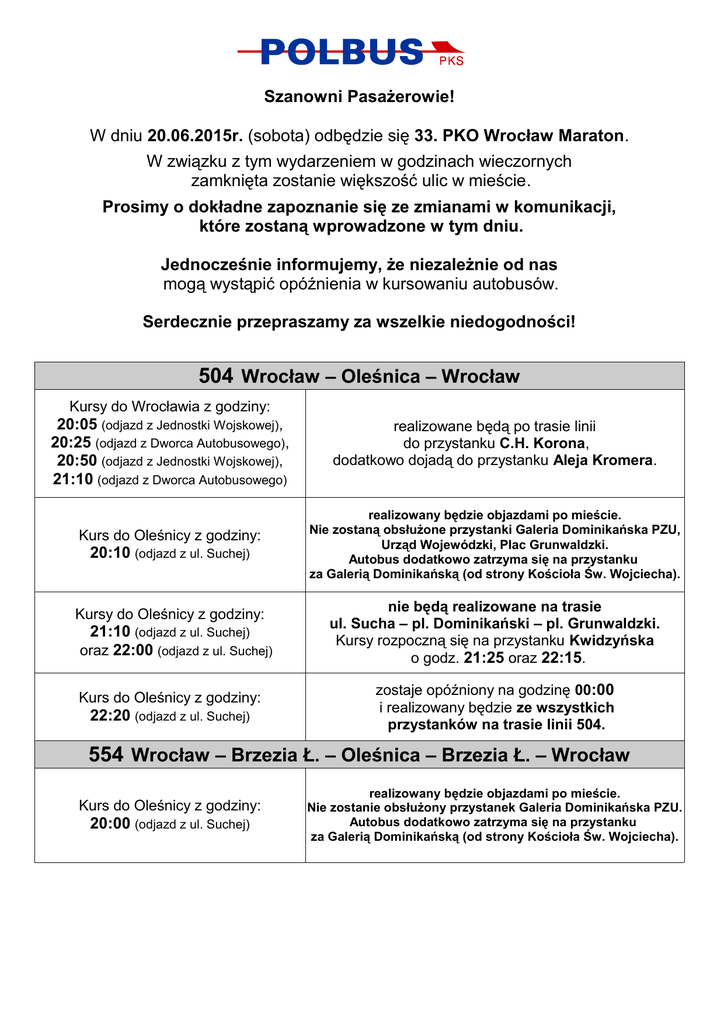 Szanowni Pasażerowie! W dniu 20.06.2015r. (sobota) odbędzie się 33. PKO Wrocław Maraton. W związku z tym wydarzeniem w godzinach wieczornych 'zamknięta zostanie większość ulic w mieście. Prosimy o dokładne zapoznanie się ze zmianami w komunikacji, 'które zostaną wprowadzone w tym dniu. Jednocześnie informujemy, że niezależnie od nas 'mogą wystąpić opóźnienia w kursowaniu autobusów. Serdecznie przepraszamy za wszelkie niedogodności! 504 Wrocław – Oleśnica – Wrocław Kursy do Wrocławia z godziny: 20:05 (odjazd z Jednostki Wojskowej), 20:25 (odjazd z Dworca Autobusowego), 20:50 (odjazd z Jednostki Wojskowej), 21:10 (odjazd z Dworca Autobusowego) Kurs do Oleśnicy z godziny: 20:10 (odjazd z ul. Suchej) Kursy do Oleśnicy z godziny: 21:10 (odjazd z ul. Suchej) 'ooraz 22:00 (odjazd z ul. Suchej) Kurs do Oleśnicy z godziny: 22:20 (odjazd z ul. Suchej) realizowane będą po trasie linii 'do przystanku C.H. Korona, dodatkowo dojadą do przystanku Aleja Kromera. realizowany będzie objazdami po mieście. Nie zostaną obsłużone przystanki Galeria Dominikańska PZU, Urząd Wojewódzki, Plac Grunwaldzki. Autobus dodatkowo zatrzyma się na przystanku za Galerią Dominikańską (od strony Kościoła Św. Wojciecha). nie będą realizowane na trasie ul. Sucha – pl. Dominikański – pl. Grunwaldzki. Kursy rozpoczną się na przystanku Kwidzyńska 'o godz. 21:25 oraz 22:15. zostaje opóźniony na godzinę 00:00 i realizowany będzie ze wszystkich 'przystanków na trasie linii 504. 554 Wrocław – Brzezia Ł. – Oleśnica – Brzezia Ł. – Wrocław Kurs do Oleśnicy z godziny: 20:00 (odjazd z ul. Suchej) realizowany będzie objazdami po mieście. Nie zostanie obsłużony przystanek Galeria Dominikańska PZU. Autobus dodatkowo zatrzyma się na przystanku za Galerią Dominikańską (od strony Kościoła Św. Wojciecha). 522 Wrocław – Sobótka Zachodnia – Wrocław Kursy do Sobótki Zachodniej z godziny: 21:00 (odjazd z Dworca Autobusowego) 22:00 (odjazd z Dworca Autobusowego) Kurs do Wrocławia z godziny: 20:40 (odjazd z Sobótki Zachodniej) realizowane będą objazdami po mieście. Nie zostanie obsłużony przystanek Powstańców Śląskich „Hallera”. może być realizowany objazdami po mieście, 'zależnie od sytuacji w czasie przejazdu. 565 Wrocław – Jelcz-Laskowice – Wrocław Kurs do Jelcza-Laskowic z godziny: 22:20 (odjazd z Dworca Autobusowego) Kurs do Wrocławia z godziny: 20:00 (odjazd z pętli przy komisariacie) zostaje opóźniony na godzinę 00:00 i realizowany będzie ze wszystkich 'przystanków na trasie linii 565. może być realizowany objazdami po mieście, 'zależnie od sytuacji w czasie przejazdu. 519 Wrocław – Środa Śląska – Wrocław Kurs do Środy Śląskiej z godziny: 22:10 (odjazd z Dworca Autobusowego) Kurs do Wrocławia z godziny: 21:05 (odjazd ze Środy Śląskiej) realizowany będzie objazdami po mieście. Nie zostanie obsłużony przystanek Plac Legionów. realizowany będzie objazdami po mieście. Nie zostanie obsłużony przystanek Plac Legionów. 527 Wrocław – Kostomłoty – Wrocław Kurs do Wrocławia z godziny: 20:30 (odjazd z Kostomłotów) może być realizowany objazdami po mieście, 'zależnie od sytuacji w czasie przejazdu.