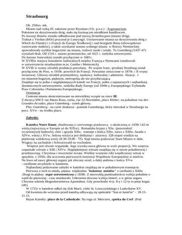 Strasbourg Ok. 250tys. mk. Miasto nad rzeką Ill, założone przez Rzymian (15r. p.n.e.) - Argenatorium. Położone na skrzyżowaniu dróg, stało się kwitnącym ośrodkiem handlowym. Po inwazji Hunów zostało odbudowane pod nazwą Strateburgum (miasto dróg). Traktat z Verdun (843r) przyznał je Lotaryngii. Usytuowanie miasta na skrzyżowaniu dróg z Włoch do Flandrii i z Francji do Europy Środkowej i nad brzegiem Renu (obowiązkowe cumowanie statków), a także uzyskanie statusu wolnego miasta w Rzeszy Niemieckiej spowodowały szybkie bogacenie się miasta, rozkwit nauki i sztuki. Tu Gutenberg (1437-47) wynalazł druk. Od 1516 r. miasto protestanckie, od 1621 r. siedziba uniwersytetu. Do korony francuskiej zostało przyłączone w 1681r. W XVIIIw miejsce kontaktów kulturalnych między Francją a Niemcami (studiowali w uniwersytecie strasburskim m.in. Goethe i Metternich). W XVIII w ważny ośrodek produkcji porcelany. Po wojnie franc.-pruskiej Strasburg został przyłączony do Prus, w 1918r. powrócił do Francji. Poważnie zniszczone w 1870r. i II wojny światowej. Główny ośrodek przemysłowy, naukowy, kulturalny i administr. Alzacji. J est miastem bogatym, pięknym, metropolią ale nie przytłaczającą. Znajduje się tu jedna z najpiękniejszych katedr we Francji, jeden z najstarszych i najbardziej dynamicznych uniwersytetów, siedziba Rady Europy (od 1949r.), Europejskiego Trybunału Praw Człowieka i Parlamentu Europejskiego. Orientacja Centrum miasta skoncentrowane na niewielkiej wyspie na rzece Ill. Z dworca SNCF rue Maire-Kuss, rzeka, rue 22-Novembre, place Kleber, na połudnue rue des Grandes-Arcades, place Gutenberg - rynek główny. Plac Gutenberg - na cześć drukarza - pomnik Gutenberga, który mieszkał w Strasburgu na pocz. XVw - na środku placu. Zabytki: Katedra Notre Dame, zbudowana z czerwonego piaskowca, z ukończoną w 1439r 142-m wieżą (najwyzszą w Europie aż do XIXw).. Romańska krypta z XIw. (pozostałość wcześniejszej budowli), chór i apsyda XIIw, transept z końca XIIw, nawa z XIIIw, fasada z XIVw, wieża z XVw. Jedyna wieżyca jest delikatna i ażurowa. 328 stopni wiedzie na platformę widokową wieży (8.30-19.00 - 7F). Stąd można podziwiać Stare Miasto w dole, Wogezy na zachodzie i Schwarzwald na wschodzie. Wnętrze jest równie wspaniałe. Jego wysoka nawa główna to wzór proporcji, We wnętrzu wspaniałe witraże z XIII i XIVw. Najpiękniejsze witraże znajdują się w nawie południowej i przedstawiają Chrystusa i stworzenie świata. Wielkie wrażenie robi współczesny witraż w apsydzie, z 1956r, dla uczczenia pierwszych instytucji Wspólnoty Europejskiej w mieście. Na lewo od nawy głównej organy jak złocony orzeł, a dalej ambona z końca XVw - rzeźbione arcydzieło w kamieniu. Najbardziej podziwaine zabytki w katedrze znajdują sie w południowym transepcie. Pierwszy z nich to smuła, piękna trójdzielna "kolumna aniołów" z rzeźbami z XIIIw .Drugi to piękny zegar astronomiczny.z 1838r. Z niezwykłą punktualnościa wybija południe o wpół do pierwszej - czas strasburski. Uderzenia dzwonu wybija śmierć, a w górze zegara Chrystus udziela błogosławieństwa Apostołom. Gdy przechodzi 4-ty, 8-y i 12-ty to pieje kogut. (4F). W 1725r w katedrze odbył się ślub Marii, córki St. Leszczyńskiego z Ludwikiem XV. Od kwietnia do września przed katedrą odbywają się spektakle "Son et lumičre" - 20.1521.15. Rejon Katedry: place de la Cathedrale: Na rogu ul. Merciere, apteka du Cerf (Pod 2 Jeleniem) z 1268r, najstarsza we Francji. Na rogu północnym la maison Kommerzell z 1589 r. (freski i rzeżba z drewna) Muzea Strasburga Na południe od katedry skupiona jest większość muzeów. Godz. otwarcia: 10-12 i1 4-18; wstęp 15 F do Palais Rohan, 10F do pozostałych Musée (Maison) de l'Oeuvre Notre-Dame - obok katedry (z XIV i XVIw), w którym ma siedzibę muzeum rzeźb sakralnych.- Muzeum Katedralne. Muzeum zajmuje zespół domów oraz pałacyk du Cerf z gotyckim ogrodem. Zbiory ilustrują rozwój sztuki alzackiej średniowiecza i renesansu. Mieszczą sie rzeżby, które kiedyś zdobiły świątynie od zewnątrz ale zostały uszkodzone podczas Rewolucji i zastąpione później kopiami. Są tu też inne skarby sztuki - witraże z pierwotnej katedry romańskiej, m.in. najstarszy znany we Francji i Niemczech witraż "Głowa Chrystusa z Wissemburga z XI-wieku.; oryginalne rzeźby, które kiedyś zdobiły świątynę Notre Dame od zewnątrz, później uszkodzone podczas Rewolucji i zastąpione kopiami. Zbiory rzeźby: romańskiej (XI-XIIw., sarkofagi, krużganki, kolumny) oraz gotyckie - m.in. orygimnały rzeżb z katedry Notre-Dame, w tym "Panny mądre" i "Panny głupie", figury proroków, portal St-Laurent.. Są oryginalne projekty posągów na papirusie. Rekonstrukcja XV w. wnętrz domu strasburskiego z rzeźbami, obrazami, meblami. Muzeum Château de Rohan -z 1732r. - dawna rezydencja kardynałów, książąt i biskupów z rodziny de Roham. Z rodziny Rohan wywodziło sie wielu kardynałów. W Palais Rohan mają w nim siedzibe 3 muzea: Archeologiczne, Sztuk Pięknych - P. Gaugin, A. Renoir, Pissarro, E. Delacroix, F. Goya, Tintoretto, B.E. Murillo, El Greco, Veronese, Botticelli, Muzeum Sztuki Dekoracyjnej - fajanse i porcelana alzacka. Muzeum Sztuki Współczesnej - Musée d'Art Moderne, w budynku dawnej komory celnej. Jego bogate zbiory zawierają m.in. kolekcję imalarstwa mpresjonistów (Manet, Degas, Monet, Renoir, Gaugin - "Martwa natura"), malarstwo pierwszych lat XXw (Dufy, Vlaminck, Vuillard, Klimt, Utrillo); znakomity zbiór sztuki lat 60-ych i 70-ych, m.in. kolekcja dzieł Arpa,. Zbiory witraży z okresu Art-Nouveau, i póżniejszych. Muzeum Historyczne. - 3, place de la Grande Boucherie Na place du Marché-aux-Cochons-de-Lait (targ prosiaków) w zabytkowym budynku starej rzeźni (Grande Boucherie) mieści się Muzeum Historyczne. Poświęcone głównie dziejom miasta, a na górze kolekcja zabawek mechanicznych. 
