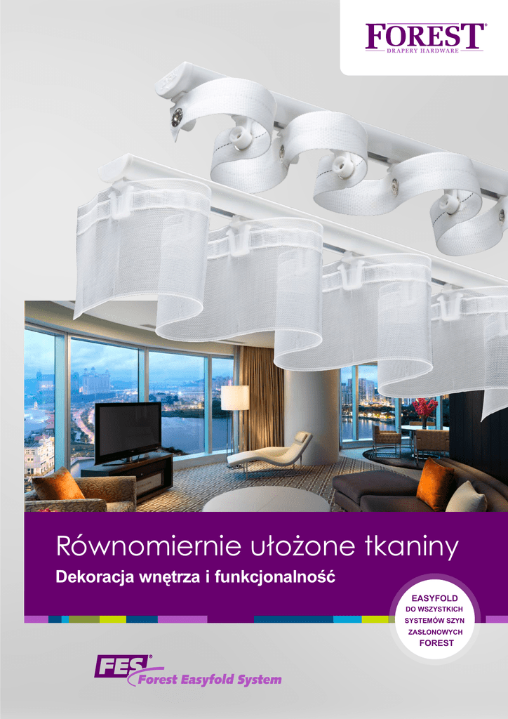 Równomiernie ułożone tkaniny Dekoracja wnętrza i funkcjonalność EASYFOLD DO WSZYSTKICH SYSTEMÓW SZYN ZASŁONOWYCH FOREST FOREST EASYFOLD SYSTEM EasySNAP taśma z napami na szynie DS EasyFLEX taśma z haczykami na szynie DS EASYFOLD SYSTEM FOREST EASYFOLD ZOSTAŁ PRZYGOTOWANY JAKO DODATEK DO SZYN FOREST. GŁÓWNYM ZAŁOŻENIEM BYŁO UZYSKANIE MOŻLIWOŚCI ŁATWEGO ZAWIESZANIA RÓWNOMIERNIE UŁOŻONYCH ZASŁON SYSTEM EASYFOLD JEST IDEALNYM ROZWIĄZANIEM NIE TYLKO DLA TRADYCYJNYCH OKIEN W DOMACH I REZYDENCJACH ALE TAKŻE DLA HOTELOWYCH POKOI, RECEPCJI I RESTAURACJI EASYFOLD - MOŻE BYĆ STOSOWANY W SZYNACH ZASŁONOWYCH OBSŁUGIWANYCH MANUALNIE, STEROWANYCH SZNURKOWO I Z NAPĘDEM ELEKTRYCZNYM GÓRNE WYKOŃCZENIE FIRAN LUB ZASŁON W POŁĄCZENIU Z ODPOWIEDNIĄ TKANINĄ BĘDZIE PRZYCIĄGAŁO UWAGĘ I POPRAWIAŁO WYGLĄD KAŻDEGO POMIESZCZENIA. Stwórz nowoczesny i wyjątkowy wzór upięcia dla twoich zasłon zaprojektowana dla systemu FES szyna DS-XL System Easyfold zaprojektowano w taki sposób by ułożenie fałd tkaniny powstało natychmiast po upięciu CO POWODUJE ŻE NASZ SYSTEM EASYFOLD JEST TAKI WYJĄTKOWY? JAK DZIAŁA SYSTEM EASYFOLD W PRAKTYCE? » Efekt głębokich fal na tkaninach jest widoczny, niezależnie od tego czy tkaniny są odsłonięte czy zasłonięte. » System zaprojektowano w taki sposób by ułożenie w formie fali powstało natychmiast po upięciu tkaniny. » Prosty sposób zawieszania wpływa na łatwość i szybkość obsługi. » Górne wykończenie taśmą Easyfold powoduje, że tkanina zajmuje mniej miejsca niż wykończona taśmą marszczącą. » Sznurek łączący suwaki jest zupełnie niewidoczny gdy tkaniny są zasłonięte. » Suwaki mogą być łatwo wysunięte z podstawy dzięki temu skraca się czas pracy na drabinie. » W zależności od wybranego marszczenia użycie Easyfold może być nawet bardziej ekonomiczne niż tradycyjnej taśmy (do 33% w porównaniu do taśmy ołówkowej). » System może być stosowany także z szynami giętymi w poziomie. » System jest dostępny w dwóch wariantach: EasySNAP z metalowymi napami o ustalonym rozstawie, które są zapinane na suwakach dwustronnych EasySNAP EasyFLEX z kieszonkami do umieszczenia obrotowych haczyków, pozwala na dowolne rozmieszczanie haczyków w taśmie upinanej na suwakach EasyFOLD. » Specjalnie zaprojektowane suwaki do mocowania haczyków obrotowych są połączone ze sobą. » Dzięki połączeniu suwaków sznurkiem firany lub zasłony zawsze będą układać się w formie fali. Nawet gdy tkaniny są odsłonięte ich wygląd sprawi wrażenie starannie przygotowanego. » W zależności od typu tkaniny wprasowywane taśmy do podklejania tkanin mogą być stosowane razem z taśmą EasyFLEX dla uzyskania efektownego wyglądu dekoracji. » Taśma transparentna z kieszonkami EasyFLEX pozwala na tworzenie bardzo zróżnicowanego raportu marszczenia od 150% do 350%! » Taśma EasySNAP jest dostępna w kolorach: białym i czarnym oraz w wersji transparentnej o rozstawie nap 10 cm i 15 cm tworzącym marszczenie 180%,200%, 270% i 300%. » Obydwie taśmy można stosować na wszystkich szynach zasłonowych Forest. ILOŚCI SUWAKÓW I TAŚM EASYFOLD 60% 80% 100% 1 metr 2 metry 3 metry 4 metry 5 metry 6 metry 7 metry Ilość Ilość Ilość Ilość Ilość Ilość Ilość EASYSNAP / EASYFLEX SUWAKI 60%, ROZSTAW SUWAKÓW 8 cm 16 suwaków 28 suwaków 40 suwaków 52 suwaki 66 suwaków 78 suwaków 90 suwaków Taśma EasyFLEX głębokość fali 10 cm Taśma EasySNAP zwykła 160 cm 280 cm 400 cm 520 cm 660 cm 780 cm 900 cm Taśma EasyFLEX głębokość fali 15 cm Taśma EasySNAP XL 240 cm 420 cm 600 cm 780 cm 990 cm 1170 cm 1350 cm Taśma EasyFLEX głębokość fali 20 cm 320 cm 560 cm 800 cm 1040 cm 1320 cm 1560 cm 1800 cm Tkanina w pozycji odsłoniętej zajmuje: 23 cm 40 cm 56 cm 74 cm 93 cm 110 cm 127 cm EASYSNAP / EASYFLEX SUWAKI 80%, ROZSTAW SUWAKÓW 6 cm 20 suwaków 36 suwaków 52 suwaki 70 suwaków 86 suwaków 102 suwaki120 suwaków Taśma EasyFLEX głębokość fali 10 cm Taśma EasySNAP zwykła 200 cm 360 cm 520 cm 700 cm 860 cm 1020 cm 1200 cm Taśma EasyFLEX głębokość fali 15 cm Taśma EasySNAP XL 300 cm 540 cm 780 cm 1050 cm 1290 cm 1530 cm 1800 cm Taśma EasyFLEX głębokość fali 20 cm 400 cm 720 cm 1040 cm 1400 cm 1720 cm 2040 cm 2400 cm Tkanina w pozycji odsłoniętej zajmuje: 26 cm 51 cm 75 cm 100 cm 122 cm 144 cm 168 cm EASYSNAP / EASYFLEX SUWAKI 100%, ROZSTAW SUWAKÓW 5,4 cm 22 suwaki 40 suwaków 58 suwaków 78 suwaków 96 suwaków 114 suwaków132 suwaki Taśma EasyFLEX głębokość fali 10 cm Taśma EasySNAP zwykła 220 cm 400 cm 580 cm 780 cm 960 cm 1140 cm 1320 cm Taśma EasyFLEX głębokość fali 15 cm Taśma EasySNAP XL 330 cm 600 cm 870 cm 1170 cm 1440 cm 1710 cm 1980 cm Taśma EasyFLEX głębokość fali 20 cm 440 cm 800 cm 1160 cm 1560 cm 1920 cm 2280 cm 2640 cm Tkanina w pozycji odsłoniętej zajmuje: 30 cm 57 cm 82 cm 110 cm 136 cm 162 cm 186 cm Głębokość fali 10,75 cm lub 15,75 cm przy zastosowani taśmy i suwaków EasySNAP. Sufitowa wnęka nie powinna być mniejsza niż 11 i 16 cm. 60% = 8,0 cm pomiędzy suwakami 80% = 6,0 cm pomiędzy suwakami 100% = 5,4 cm pomiędzy suwakami W taśmach EasyFLEX głębokość fali jest zależna od ilości użytych suwaków i taśmy. Minimalna wnęka sufitowa powinna być przygotowana z uwzględnieniem długości taśmy znajdującej się pomiędzy suwakami INSTRUKCJA DLA PRACOWNI FOREST EASYFLEX SYSTEM Niemal każda pracownia szyjąca firany i zasłony posiada własne sposoby na przygotowanie najefektowniejszej dekoracji. Niniejszy przewodnik ma wyłącznie na celu przedstawienie kilku propozycji z zastosowaniem Systemu EASYFOLD. Każdorazowo nową tkaninę zalecamy sprawdzić wykonując niewielką próbkę System EasyFLEX składa się z taśmy transparentnej z kieszonkami. Rolka zawiera 100 metrów. Na 1 metr przypada 100 kieszonek. W nich mocuje się haczyki podwójne, a następnie całość wsuwa do postawy suwaków znajdujących
