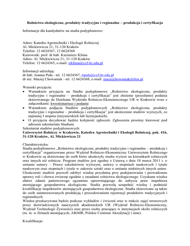 Rolnictwo ekologiczne, produkty tradycyjne i regionalne – produkcja i certyfikacja Informacje dla kandydatów na studia podyplomowe: Adres: Katedra Agrotechniki i Ekologii Rolniczej Al. Mickiewicza 21, 31-120 Kraków Telefon: 12 6624367, 12 6624368 Kierownik: prof. dr hab. Kazimierz Klima Adres: Al. Mickiewicza 21; 31-120 Kraków Telefon: 12 6624365, e-mail: [email protected] Informacji udzielają: dr hab. Joanna Puła - tel. 12 6624367, [email protected] dr inż. Maciej Chowaniak - tel. 12 6624368, e-mail: [email protected] Warunki przyjęcia: Warunkiem przyjęcia na Studia podyplomowe „Rolnictwo ekologiczne, produkty tradycyjne i regionalne – produkcja i certyfikacja” jest złożenie (przesłanie) podania skierowanego do Dziekana Wydziału Rolniczo-Ekonomicznego UR w Krakowie wraz z załącznikami: kwestionariusz i podanie Warunkiem podjęcia Studiów podyplomowych „Rolnictwo ekologiczne, produkty tradycyjne i regionalne – produkcja i certyfikacja” jest ukończenie studiów wyższych, co najmniej I stopnia (inżynierskich lub licencjackich). O przyjęciu decydować będzie kolejność zgłoszeń. Zgłoszenia prosimy kierować pod adresem sekretariatu Studium. Sekretariat studiów podyplomowych: Uniwersytet Rolniczy w Krakowie, Katedra Agrotechniki i Ekologii Rolniczej, pok. 416, 31-120 Kraków, Al. Mickiewicza 21 Charakterystyka: Studia podyplomowe „Rolnictwo ekologiczne, produkty tradycyjne i regionalne – produkcja i certyfikacja” organizowane przez Wydział Rolniczo-Ekonomiczny Uniwersytetu Rolniczego w Krakowie są skierowane do osób które ukończyły studia wyższe na kierunkach rolniczych oraz innych niż rolnicze. Program studiów jest zgodny z Ustawą z dnia 18 marca 2011 r. o zmianie ustawy – Prawo szkolnictwie wyższym, ustawy o stopniach naukowych i tytule naukowym oraz stopniach i tytule w zakresie sztuki oraz o zmianie niektórych innych ustaw. Ukończenie studiów pozwoli zdobyć wiedzę przydatną przy podejmowaniu i prowadzeniu uprawy roli i chowu zwierząt zgodnie z zasadami rolnictwa ekologicznego. Uzyskana wiedza ułatwi zdanie państwowego egzaminu uprawniającego do nabycia praw inspektora atestującego gospodarstwa ekologiczne. Studia pozwolą uzupełnić wiedzę i podnieść kwalifikacje inspektorów atestujących gospodarstwa ekologiczne. Studia skierowane są także do osób zainteresowanych produkcją i procedowaniem rejestracji produktów tradycyjnych i regionalnych. Wiedza przekazywana będzie podczas wykładów i ćwiczeń oraz w trakcie zajęć terenowych przez doświadczonych nauczycieli akademickich UR (Wydział Rolniczo-Ekonomiczny, Wydział Technologii Żywności) oraz przez osoby pracujące w instytucjach około rolniczych (m. in. w firmach atestujących, ARiMR, Polskie Centrum Akredytacji i inne). Kwalifikacje: Uczestnicy studiów podyplomowych „Rolnictwo ekologiczne, produkty tradycyjne i regionalne – produkcja i certyfikacja” zdobędą wiedzę, umiejętności i kompetencje społeczne niezbędne dla skutecznego prowadzenia gospodarstwa rolniczego, szczególnie według zasad systemu ekologicznego. Program studiów obejmuje 245 godzin, na które składa się 5 modułów. Moduły: 1) Ekologiczna uprawa roślin; 2 Ekologiczne utrzymanie zwierząt oraz produkcja pasz; 3) Przetwórstwo produktów ekologicznych, produkty tradycyjne i regionalne; 4) Mechanizmy sybwencjonowania i ekonomiczne aspekty; 5) Kontrola i certyfikacja. Uczestnicy wykonują pracę dyplomowa pod opieką pracownika naukowego. Studia kończą się egzaminem dyplomowym oraz wydaniem świadectwa ukończenia studiów podyplomowych zgodnie z Rozporządzeniem Ministra Nauki i Szkolnictwa Wyższego z dnia 11.09.2011 (Dz. U. 196, poz. 1167). Czas trwania: dwa semestry, 7 zjazdów w semestrze w dniach sobota-niedziela. Pierwsze zajęcia są planowane w dniach 5-6 marca 2016 roku. Opłata za jeden semestr wynosi 1700 złotych. Warunki ukończenia studiów: uczestnictwo w zajęciach i zaliczenie zajęć przewidzianych w programie studiów złożenie pracy dyplomowej w formie projektu opracowanego z wykorzystaniem technik komputerowych pozytywny wynik egzaminu dyplomowego Zestawienie ogólne liczby godzin programu studiów Lp. Przedmiot 1. 2. 3. 4. 5. 6. 7. 8. 9. 10. 11. 12. 13. 14. Ekologiczna uprawa roślin Zbiór ze stanu naturalnego Ekologiczne utrzymanie zwierząt oraz produkcja paszy Pszczelarstwo ekologiczne Produkty akwakultury i wodorosty morskie Przetwórstwo produktów ekologicznych oraz produkcja drożdży Produkty Tradycyjne i Regionalne Analiza ryzyka w produkcji żywności Pobór próbek i metody oznaczania Mechanizmy subwencjonowania produkcji ekologicznej, żywności tradycyjnej i regionalnej Ekonomiczne aspekty rynku produktów ekologicznych, tradycyjnych i regionalnych Kontrola i certyfikacja produkcji ekologicznej, produktów tradycyjnych i regionalnych Znakowanie, importowanie oraz wprowadzanie na rynek żywności ekologicznej, tradycyjnej i regionalnej Seminarium Liczba godzin Wyk Ćw 39 17 6 6 10 13 15 7 5 11 12 10 7 4 2 11 4 2 ECTS 5 1 2 2 1 1 3 1 2 1 4 4 1 24 20 6 4 2 2 6 - 2 Dla uczestników studiów podyplomowych, którzy planują zdobyć kwalifikacje Inspektora Rolnictwa Ekologicznego przewidziano dodatkowe nieodpłatne przygotowanie do egzaminu. Kwestionariusz osobowy dla kandydatów na Studia Podyplomowe 1. Nazwisko .............................................................. Imię (imiona) ............................................................. 2. Data urodzenia: dzień .......... miesiąc ........... rok ............... 3. Miejsce urodzenia ........................................ 4. Imiona rodziców ......................................................................................................................................... 5. Nazwisko panieńskie (u mężatek) .............................................................................................................. 6. Adres stałego zameldowania: kod ............