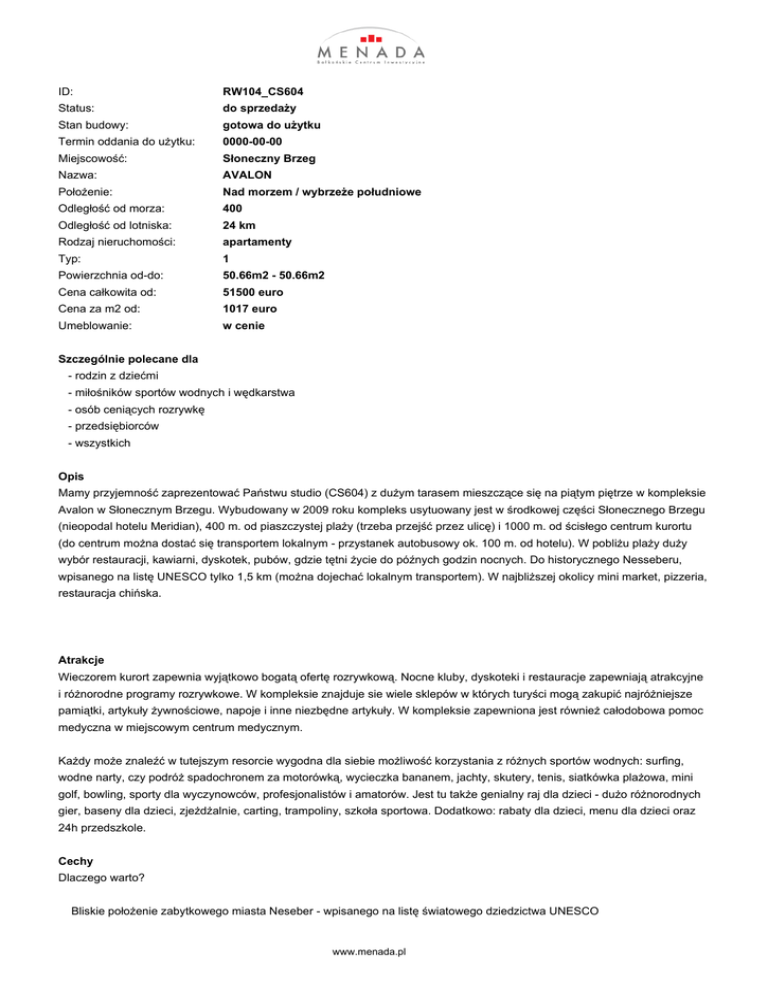 ID: RW104_CS604 Status: do sprzedaży Stan budowy: gotowa do użytku Termin oddania do użytku: 0000-00-00 Miejscowość: Słoneczny Brzeg Nazwa: AVALON Położenie: Nad morzem / wybrzeże południowe Odległość od morza: 400 Odległość od lotniska: 24 km Rodzaj nieruchomości: apartamenty Typ: 1 Powierzchnia od-do: 50.66m2 - 50.66m2 Cena całkowita od: 51500 euro Cena za m2 od: 1017 euro Umeblowanie: w cenie Szczególnie polecane dla - rodzin z dziećmi - miłośników sportów wodnych i wędkarstwa - osób ceniących rozrywkę - przedsiębiorców - wszystkich Opis Mamy przyjemność zaprezentować Państwu studio (CS604) z dużym tarasem mieszczące się na piątym piętrze w kompleksie Avalon w Słonecznym Brzegu. Wybudowany w 2009 roku kompleks usytuowany jest w środkowej części Słonecznego Brzegu (nieopodal hotelu Meridian), 400 m. od piaszczystej plaży (trzeba przejść przez ulicę) i 1000 m. od ścisłego centrum kurortu (do centrum można dostać się transportem lokalnym - przystanek autobusowy ok. 100 m. od hotelu). W pobliżu plaży duży wybór restauracji, kawiarni, dyskotek, pubów, gdzie tętni życie do późnych godzin nocnych. Do historycznego Nesseberu, wpisanego na listę UNESCO tylko 1,5 km (można dojechać lokalnym transportem). W najbliższej okolicy mini market, pizzeria, restauracja chińska. Atrakcje Wieczorem kurort zapewnia wyjątkowo bogatą ofertę rozrywkową. Nocne kluby, dyskoteki i restauracje zapewniają atrakcyjne i różnorodne programy rozrywkowe. W kompleksie znajduje sie wiele sklepów w których turyści mogą zakupić najróżniejsze pamiątki, artykuły żywnościowe, napoje i inne niezbędne artykuły. W kompleksie zapewniona jest również całodobowa pomoc medyczna w miejscowym centrum medycznym. Każdy może znaleźć w tutejszym resorcie wygodna dla siebie możliwość korzystania z różnych sportów wodnych: surfing, wodne narty, czy podróż spadochronem za motorówką, wycieczka bananem, jachty, skutery, tenis, siatkówka plażowa, mini golf, bowling, sporty dla wyczynowców, profesjonalistów i amatorów. Jest tu także genialny raj dla dzieci - dużo różnorodnych gier, baseny dla dzieci, zjeżdżalnie, carting, trampoliny, szkoła sportowa. Dodatkowo: rabaty dla dzieci, menu dla dzieci oraz 24h przedszkole. Cechy Dlaczego warto? Bliskie położenie zabytkowego miasta Neseber - wpisanego na listę światowego dziedzictwa UNESCO www.menada.pl 400 m od plaży i 15 min drogi od ścisłego centrum Słonecznego Brzegu Ciekawe usytuowanie - bliska obecność sklepów, barów, restauracji a zarazem cisza i spokój Umeblowanie w cenie Duzy taras Cechy: sklep w kompleksie basen z barem zewnętrznym restauracja całodobowa ochrona winda całodobowa ochrona  Usługi Roczna opłata za zarządzanie: 10 Euro/m2 Nasza firma dba o utrzymanie apartamentu w ciągu roku - Dla naszych Klientów zapewniamy utrzymanie nieruchomości, ochronę 24 h przez cały rok, oświetlenie, bezpieczeństwo elektryczne i wodne, naprawy, sprzątanie i czyszczenie części wspólnych, zieleni, czyszczenie apartamentu czy też płatności rachunków. Uzyskiwanie dodatkowych dochodów z ewentualnego wynajmu apartamentu - Zapewniamy bowiem również organizację wynajmu apartamentu. Zasady płatności www.menada.pl