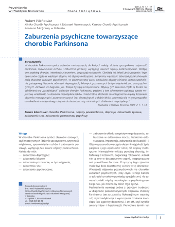 Psychiatria w Praktyce Klinicznej PRACA P O G L Ą D O W A tom 2, nr 1, 1–14 © Copyright 2009 Via Medica ISSN 1899–5071 Hubert Wichowicz Klinika Chorób Psychicznych i Zaburzeń Nerwicowych, Katedra Chorób Psychicznych Akademii Medycznej w Gdańsku Zaburzenia psychiczne towarzyszące chorobie Parkinsona Streszczenie W chorobie Parkinsona oprócz objawów motorycznych, do których należą: drżenie spoczynkowe, sztywność mięśniowa, spowolnienie ruchów i zaburzenia postawy, występują również objawy pozamotoryczne. Wikłają one przebieg choroby, interferują z leczeniem, pogarszają rokowanie. Obniżają też jakość życia pacjenta i jego opiekunów często w większym stopniu niż objawy motoryczne. Symptomy większości zaburzeń pozaruchowych mają charakter zaburzeń psychicznych. W prezentowanej pracy omówiono objawy kliniczne, rozpowszechnienie, patogenezę i leczenie zaburzeń: depresyjnych, lękowych, poznawczych (w tym otępienia), snu oraz psychotycznych. Zarówno ich diagnoza, jak i terapia bywają skomplikowane. Objawy tych zaburzeń często są trudne do odróżnienia od „zasadniczych” objawów choroby Parkinsona; pacjenci z tym schorzeniem wykazują często wyjątkową wrażliwość na działania niepożądane leków. Wielokrotnie dochodzi do antagonizmu między leczeniem objawów motorycznych i pozamotorycznych (np. depresyjnych), a dobór leków sprowadza się w tym przypadku do określenia maksymalnego stopnia skuteczności przy minimalnych działaniach niepożądanych. Psychiatria w Praktyce Klinicznej 2009; 2, 1: 1–14 Słowa kluczowe: choroba Parkinsona, objawy pozaruchowe, depresja, zaburzenia lękowe, zaburzenia snu, zaburzenia poznawcze, psychozy Wstęp W chorobie Parkinsona oprócz objawów osiowych, czyli motorycznych (drżenie spoczynkowe, sztywność mięśniowa, spowolnienie ruchów i zaburzenia postawy), występują tak zwane objawy pozaruchowe. Należą do nich: — zaburzenia depresyjne; — zaburzenia lękowe; — zaburzenia poznawcze, w tym otępienie; — zaburzenia snu; — zaburzenia psychotyczne; Adres do korespondencji: dr n. med. Hubert Wichowicz Klinika Chorób Psychicznych i Zaburzeń Nerwicowych Katedra Chorób Psychicznych Akademii Medycznej w Gdańsku ul. Dębinki 7, 80–952 Gdańsk tel.: (058) 349 26 50 e-mail: [email protected] — zaburzenia układu wegetatywnego (zaparcia, zaburzenia w oddawaniu moczu, hipotonia ortostatyczna, impotencja, zaburzenia potliwości) [1]. Objawy pozaruchowe często determinują jakość życia pacjenta i jego opiekunów silniej niż objawy motoryczne. Niewątpliwie wikłają przebieg choroby, interferują z leczeniem, pogarszają rokowanie. Jednak nie są one w dostatecznym stopniu rozpoznawane ani prawidłowo leczone. Przyczyną tego zjawiska może być brak dostatecznej wiedzy w tej dziedzinie. Większość objawów pozaruchowych ma charakter zaburzeń psychicznych, przy czym istnieje bariera w zakresie kontaktów pomiędzy specjalistami; nie zawsze kontakt między neurologiem a psychiatrą przebiega tak, jak można by sobie tego życzyć. Podkreślenia wymaga jedna z przyczyn trudności w diagnozie pozamotorycznych objawów choroby Parkinsona. Jest to zjawisko fluktuacji (tzw. wearing off, czyli bradykinezja z wyczerpania działania lewodopy (lub agonisty dopaminy), i on-off, czyli szybkie zmiany hiper- i hipokinezji). Pierwotnie termin ten www.psychiatria.med.pl 1 Psychiatria w Praktyce Klinicznej 2009, tom 2, nr 1 dotyczył stanu ruchowego; jednak z czasem coraz bardziej zaczęto podkreślać towarzyszące zmianom ruchowym również zmiany niektórych innych objawów pozaruchowych — przy fluktuacjach pojawiają się niejednokrotnie objawy lękowe lub depresyjne. Ustępują one całkowicie po przyjęciu kolejnej dawki leku. Może też się zdarzyć, że bezpośrednio po przyjęciu lewodopy (względnie agonistów dopaminy) nastrój chorego ulegnie znacznemu podwyższeniu. Już po 3 latach trwania choroby Parkinsona fluktuacje mogą wystąpić u 50% pacjentów [2]. Każdemu psychiatrze praktykowi znane są przypadki osób z zaburzeniami afektywnymi dwubiegunowymi, które w okresach podwyższonego nastroju negują obecność depresji w anamnezie i vice versa. Z podobną sytuacją, kiedy opis swojego stanu psychicznego zależy od aktualnego nastroju projektowanego na przeszłość, można mieć do czynienia również w przypadku zjawiska fluktuacji w chorobie Parkinsona. Jednak w tej sytuacji częstotliwość zmian nastroju chorego jest znacznie większa. Lekarz psychiatra może poprzez pominięcie tego zjawiska w czasie badania osoby z chorobą Parkinsona postawić mylną diagnozę, względnie zignorować objawy. Zawsze w czasie badania psychiatrycznego pacjenta z chorobą Parkinsona należy wypytać go o występowanie fluktuacji i ewentualnie — przy ich obecności — ustalić aktualną fazę sprawności motorycznej, a przynajmniej czas od zażycia ostatniej dawki leku przeciwparkinsonowskiego. Należy się wystrzegać porównywania stanu psychicznego pacjenta na przykład w fazie off z poprzednią wizytą w fazie on, aby nie dojść do fałszywych wniosków. Może się również okazać, że rzekoma depresja jest w gruncie rzeczy stanem pacjenta w fazie off, mijającym po leczeniu fluktuacji. Nie tylko diagnoza, ale również leczenie objawów psychiatrycznych w chorobie Parkinsona bywa niejednokrotnie trudne. Po pierwsze, pacjenci ci wykazują często wyjątkową wrażliwość na działania niepożądane leków (np. na działanie antycholinergiczne prowadzące w bardziej zaawansowanych stadiach do majaczenia). Po drugie, wielokrotnie dochodzi do pewnego antagonizmu pomiędzy leczeniem objawów motorycznych a pozamotorycznych (np. depresyjnych) i dobór leków sprowadza się do określenia maksymalnego stopnia skuteczności przy minimalnych działaniach niepożądanych. Po trzecie, osoby z chorobą Parkinsona to często pacjenci w podeszłym wieku, z wieloma schorzeniami towarzyszą