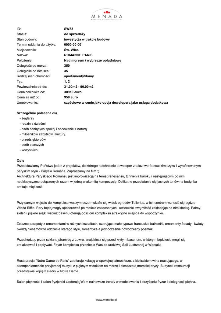 ID: SW33 Status: do sprzedaży Stan budowy: inwestycja w trakcie budowy Termin oddania do użytku: 0000-00-00 Miejscowość: Św. Włas Nazwa: ROMANCE PARIS Położenie: Nad morzem / wybrzeże południowe Odległość od morza: 350 Odległość od lotniska: 35 Rodzaj nieruchomości: apartamenty/domy Typ: 1, 2 Powierzchnia od-do: 31.00m2 - 90.00m2 Cena całkowita od: 30910 euro Cena za m2 od: 950 euro Umeblowanie: częściowo w cenie,jako opcja dewelopera,jako usługa dodatkowa Szczególnie polecane dla - żeglarzy - rodzin z dziećmi - osób ceniących spokój i obcowanie z naturą - miłośników zabytków i kultury - przedsiębiorców - osób starszych - wszystkich Opis Przedstawiamy Państwu jeden z projektów, do którego natchnienie deweloper znalazł we francuskim szyku i wyrafinowanym paryskim stylu - Paryski Romans. Zapraszamy na film :) Architektura Paryskiego Romansu jest improwizacją na temat renesansu, tchnienia baroku i następującym po nim neoklasycyzmu połączonych razem w jedną znakomitą kompozycję. Delikatne przeplatanie się jasnych tonów na budynku emituje miękkość. Przy samym wejściu do kompleksu waszym oczom ukaże się widok ogrodów Tuileries, w ich centrum wznosić się będzie Wieża Eiffla. Pary będą mogły spacerować po moście zakochanych i uwiecznić swą miłość zakładając na nim kłódkę. Palmy, zieleń i piękne alejki wzdłuż basenu oferują gościom kompleksu atrakcyjne miejsca do wypoczynku. Żelazne parapety z ornamentami w różnych kształtach, czarujące małe typowo francuskie balkoniki, ornamenty fasady i kwiaty tworzą niesamowite odczucie starego stylu, romantyka a jednocześnie nowoczesny posmak. Przechodząc przez szklaną piramidę z Luwru, znajdziesz się przed krytym basenem, w którym będziecie mogli się zrelaksować i popływać. Foyer kompleksu przeniesie Was do urokliwej Sali Lustrzanej w Wersalu. Restauracja "Notre Dame de Paris" zaoferuje kolację w spokojnej atmosferze, z kieliszkiem wina musującego, w akompaniamencie przyjemnej muzyki z pięknym widokiem na morze i pieszczotą morskiej bryzy. Budynek restauracji przedstawia kopię Katedry w Notre Dame. Salon piękności i salon fryzjerski zaoferują Wam najnowsze trendy w modelowaniu i strzyżeniu fryzur i pielęgnacji piękna. www.menada.pl Odpręż się przy zabiegach SPA po treningu w fitness, podaruj sobie masaż lub wypij orzeźwiający koktajl w strefie relaksu Przejdź pod Łukiem Triumfalnym, spaceruj wzdłuż Pól Elizejskich i wkrótce znajdziesz się na plaży. Atrakcje Święty Włas. Miejsce to jest wyjątkowe dzięki naturalnie łączącym się tu górskim powietrzem a morską bryzą, przy czym otrzymuje się specyficzną wysoką jonizację powietrza - która wyjątkowo dobrze wpływa na stan zdrowia i zapobiega wielu chorobom układu oddechowego i płuc. Jest tu idealny klimat morski - bliski śródziemnomorskiemu. Kilka kroków od kompleksu jest plażą. Jeden krótki spacer dzieli was od największego i nowoczesnego portu jachtów w Bułgarii, który może pomieścić 300 jachtów. Ekscytujące życie tzw. "Marina" co roku przyciąga wielu miłośników żeglarstwa. Restauracje rybne, sklepy, modne kluby na każdy gust. Linia brzegowa wychodzi na południe i jest swego rodzaju riwierą z licznymi naturalnymi zatokami odpowiednimi do kąpieli morskiej. Brzeg rozdzielony jest na trzy oddzielne plaże, pokrytych drobnym złotym piaskiem. Od południowej strony możemy również podziwiać wspaniałe widoki na Stare Miasto w Nesebyrze. Święty Włas jest unikalnym połączeniem gór i morza na jednym miejscu - wiele słonecznych dni / średnio po 280 w roku / i czyste powietrze, co czyni go idealnym miejscem do wypoczynku i do odpoczynku leczniczego. Cechy Dlaczego warto? panoramiczny widok na morze stylowe wykończenie obiektu i apartamentów spokojna okolica atrakcyjna cena m2 Cechy: Kryty ocieplany basen. Basen odkryty i strefa relaksu. Dziecięcy kącik 24h. Niesamowite lobby w stylu Sali Lustrzanej w Wersalu. Szklana piramida - wejście do basenu, replika wejścia do Luwru. Basen odkryty i strefa relaksu. Restauracja "Notre Dame de Paris". Model Łuku Triumfalnego. Francuska piekarnia. Salon fryzjerski. Salon piękności. Sala fitness. SPA.Łaźnia turecka. Łaźnia rosyjska. Sauna. Masaż. Recepcja 24h. Ochrona. www.menada.pl Usługi Roczna opłata za zarządzanie: 12 Euro/m2 brutto Nasza firma dba o utrzymanie apartamentu w ciągu roku - Dla naszych Klientów zapewniamy utrzymanie nieruchomości, ochronę 24 h przez cały rok, oświetlenie, bezpieczeństwo elektryczne i wodne, naprawy, sprzątanie i czyszczenie części wspólnych, zieleni, czyszczenie apartamentu czy też płatności rachunków. Uzyskiwanie dodatkowych dochodów z ewentualnego wynajmu apartamentu - Zapewniamy bowiem również organizację wynajmu apartamentu. obsługa posprzedażowa Dla maksymalnej wygody właścicieli deweloper oferuje następujące usługi przez cały rok: Czyszczenie i opieka nad basenem odkrytym Całoroczna obsługa techniczna części wspólnych i terenów zielonych Całoroczne sprzątanie części wspólnych i terenów zielonych Całoroczne zarządzanie Recepcja Konserwacja elewacji Obsługa fitness Konserwacja wszystkich urządzeń zewnętrznych Koszty za prąd, wodę w basenie i części wspólne Serwis windy Internet Wi-Fi w całym kompleksie Zasady płatności Uwaga: cena podana w cenniku to cena przy uwzględnieniu planu płatności STANDARD. Plany płatności: plan STANDARD rezerwacja 2000 euro, 100% - depozyt - podpisanie umowy przedwstępnej plan RATALNY do 3 lat rezerwacja 2000 euro, 40% - podpisanie umowy przedwstępnej 25% - pierwszy rok 25% - drugi rok 10% trzeci rok Należy pamiętać, iż prócz ceny za nieruchomość dochodzi koszt związany z opłatą notarialną u Notariusza ( jest to www.menada.pl maksymalnie 3,5 - 4,5 % wartości zakupu.. www.menada.pl