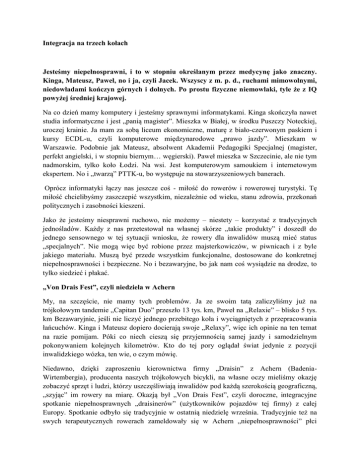 Integracja na trzech kołach Jesteśmy niepełnosprawni, i to w stopniu określanym przez medycynę jako znaczny. Kinga, Mateusz, Paweł, no i ja, czyli Jacek. Wszyscy z m. p. d., ruchami mimowolnymi, niedowładami kończyn górnych i dolnych. Po prostu fizyczne niemowlaki, tyle że z IQ powyżej średniej krajowej. Na co dzień mamy komputery i jesteśmy sprawnymi informatykami. Kinga skończyła nawet studia informatyczne i jest „panią magister”. Mieszka w Białej, w środku Puszczy Noteckiej, uroczej krainie. Ja mam za sobą liceum ekonomiczne, maturę z biało-czerwonym paskiem i kursy ECDL-u, czyli komputerowe międzynarodowe „prawo jazdy”. Mieszkam w Warszawie. Podobnie jak Mateusz, absolwent Akademii Pedagogiki Specjalnej (magister, perfekt angielski, i w stopniu biernym… węgierski). Paweł mieszka w Szczecinie, ale nie tym nadmorskim, tylko koło Łodzi. Na wsi. Jest komputerowym samoukiem i internetowym ekspertem. No i „twarzą” PTTK-u, bo występuje na stowarzyszeniowych banerach. Oprócz informatyki łączy nas jeszcze coś - miłość do rowerów i rowerowej turystyki. Tę miłość chcielibyśmy zaszczepić wszystkim, niezależnie od wieku, stanu zdrowia, przekonań politycznych i zasobności kieszeni. Jako że jesteśmy niesprawni ruchowo, nie możemy – niestety – korzystać z tradycyjnych jednośladów. Każdy z nas przetestował na własnej skórze „takie produkty” i doszedł do jednego sensownego w tej sytuacji wniosku, że rowery dla inwalidów muszą mieć status „specjalnych”. Nie mogą więc być robione przez majsterkowiczów, w piwnicach i z byle jakiego materiału. Muszą być przede wszystkim funkcjonalne, dostosowane do konkretnej niepełnosprawności i bezpieczne. No i bezawaryjne, bo jak nam coś wysiądzie na drodze, to tylko siedzieć i płakać. „Von Drais Fest”, czyli niedziela w Achern My, na szczęście, nie mamy tych problemów. Ja ze swoim tatą zaliczyliśmy już na trójkołowym tandemie „Capitan Duo” przeszło 13 tys. km, Paweł na „Relaxie” – blisko 5 tys. km Bezawaryjnie, jeśli nie liczyć jednego przebitego koła i wyciągniętych z przepracowania łańcuchów. Kinga i Mateusz dopiero docierają swoje „Relaxy”, więc ich opinie na ten temat na razie pomijam. Póki co niech cieszą się przyjemnością samej jazdy i samodzielnym pokonywaniem kolejnych kilometrów. Kto do tej pory oglądał świat jedynie z pozycji inwalidzkiego wózka, ten wie, o czym mówię. Niedawno, dzięki zaproszeniu kierownictwa firmy „Draisin” z Achern (BadeniaWirtembergia), producenta naszych trójkołowych bicykli, na własne oczy mieliśmy okazję zobaczyć sprzęt i ludzi, którzy uszczęśliwiają inwalidów pod każdą szerokością geograficzną, „szyjąc” im rowery na miarę. Okazją był „Von Drais Fest”, czyli doroczne, integracyjne spotkanie niepełnosprawnych „draisinerów” (użytkowników pojazdów tej firmy) z całej Europy. Spotkanie odbyło się tradycyjnie w ostatnią niedzielę września. Tradycyjnie też na swych terapeutycznych rowerach zameldowały się w Achern „niepełnosprawności” płci obojga, w przedziale wiekowym od lat kilku do kilkudziesięciu, prezentując bogaty „zestaw” przypadków neurologicznych i ortopedycznych. Wbrew pozorom nie był to wcale zjazd stowarzyszenia inwalidów, pomstujących na swój los, ale pełne radości, uśmiechu i optymizmu rendez-voux rowerzystów. Że trochę innych, że z widocznymi uszkodzeniami narządów ruchu, po wylewach i urazach - to było bez znaczenia. Nikt nie zwracał na to uwagi, potwierdzając tym samym fakt, że niepełnosprawność tu, w Achern i na ulicach innych niemieckich miastach, jest czymś zupełnie normalnym. Niezdrowej sensacji nie zauważyliśmy również w sąsiednim Strasbourgu. Z Polski była, niestety, tylko nasza czwórka (plus rodzice, w charakterze opiekunów), ale jak na początek to i tak nieźle, wziąwszy pod uwagę fakt, że trójkołowców firmy „Draisin” jest u nas jeszcze niewiele, a ich użytkownicy są anonimowi i rozproszeni po całym kraju. A szkoda, bo naszym zdaniem, warto byłoby pokusić się o utworzenie jakiegoś koła czy klubu polskich „draisinerów”(Może przy pomocy „Integracji” lub pomorskiej Fundacji Osób Niepełnosprawnych „Keja”?). Nie tylko dla wymiany doświadczeń, ale również nawiązania bezpośrednich koleżeńskich kontaktów, organizacji wspólnych rowerowych eskapad, integracyjnych mitingów itp. Skoro naszym sąsiadom zza Odry pomysł ten wypalił, to dlaczego u nas miałoby być inaczej? „Steig doch um!”, czyli przesiądź się! Przy okazji pobytu w Achern, mieliśmy też okazję obejrzeć wszystkie firmowe trójkołowce (a niektóre modele nawet przetestować), które zdrowemu człowiekowi trudno nawet sobie wyobrazić. - Projektujemy i wykonujemy rowery pod każdy rodzaj niepełnosprawności – poinformował nas dyr. Martin Bombik, współwłaściciel firmy i główny jej konstruktor. - Począwszy od rowerów terapeutycznych dla najmłodszych i nieco starszych dzieci, aż po rowery specjalne dla ludzi z chorobami narządów ruchu, mięśni, osób po wylewach, epileptyków, amputantów, niewidomych, małego wzrostu i z wielu innymi upośledzeniami. Są to nasze autorskie rozwiązania, posiadające certyfikaty instytutów medycznych, sprawdzone pod względem bezpieczeństwa. Ponieważ bierzemy za nie pełną odpowiedzialność, każdy rower przygotowywany jest indywidualnie, często z zastosowaniem bardzo zaawansowanej techniki i elektroniki. (Więcej o rowerach „Draisin” przeczytasz na stronie www.draisin.com). Warto podkreślić, iż Herr Bombik to nasz rodak, który 25 lat temu wyjechał na studia politechniczne do Hamburga i osiadł w Niemczech na stałe. Rowerami dla inwalidów zajmuje się już 15 lat. Uszczęśliwił nimi tysiące niepełnosprawnych i czyni to nadal, zgodnie z dewizą firmy: „Steig doch um!”, czyli „Przesiądź się!