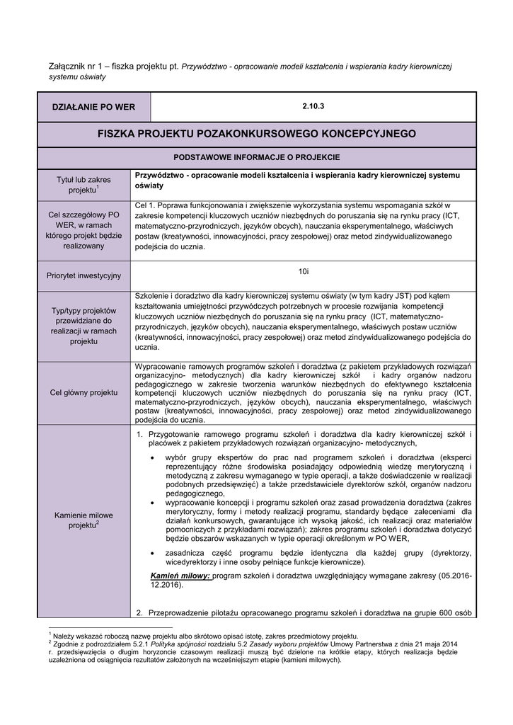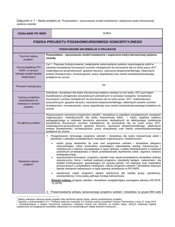 Załącznik nr 1 – fiszka projektu pt. Przywództwo - opracowanie modeli kształcenia i wspierania kadry kierowniczej systemu oświaty DZIAŁANIE PO WER 2.10.3 FISZKA PROJEKTU POZAKONKURSOWEGO KONCEPCYJNEGO PODSTAWOWE INFORMACJE O PROJEKCIE Tytuł lub zakres 1 projektu Cel szczegółowy PO WER, w ramach którego projekt będzie realizowany Przywództwo - opracowanie modeli kształcenia i wspierania kadry kierowniczej systemu oświaty Cel 1. Poprawa funkcjonowania i zwiększenie wykorzystania systemu wspomagania szkół w zakresie kompetencji kluczowych uczniów niezbędnych do poruszania się na rynku pracy (ICT, matematyczno-przyrodniczych, języków obcych), nauczania eksperymentalnego, właściwych postaw (kreatywności, innowacyjności, pracy zespołowej) oraz metod zindywidualizowanego podejścia do ucznia. 10i Priorytet inwestycyjny Typ/typy projektów przewidziane do realizacji w ramach projektu Cel główny projektu Szkolenie i doradztwo dla kadry kierowniczej systemu oświaty (w tym kadry JST) pod kątem kształtowania umiejętności przywódczych potrzebnych w procesie rozwijania kompetencji kluczowych uczniów niezbędnych do poruszania się na rynku pracy (ICT, matematycznoprzyrodniczych, języków obcych), nauczania eksperymentalnego, właściwych postaw uczniów (kreatywności, innowacyjności, pracy zespołowej) oraz metod zindywidualizowanego podejścia do ucznia. Wypracowanie ramowych programów szkoleń i doradztwa (z pakietem przykładowych rozwiązań organizacyjno- metodycznych) dla kadry kierowniczej szkół i kadry organów nadzoru pedagogicznego w zakresie tworzenia warunków niezbędnych do efektywnego kształcenia kompetencji kluczowych uczniów niezbędnych do poruszania się na rynku pracy (ICT, matematyczno-przyrodniczych, języków obcych), nauczania eksperymentalnego, właściwych postaw (kreatywności, innowacyjności, pracy zespołowej) oraz metod zindywidualizowanego podejścia do ucznia. 1. Przygotowanie ramowego programu szkoleń i doradztwa dla kadry kierowniczej szkół i placówek z pakietem przykładowych rozwiązań organizacyjno- metodycznych, Kamienie milowe 2 projektu wybór grupy ekspertów do prac nad programem szkoleń i doradztwa (eksperci reprezentujący różne środowiska posiadający odpowiednią wiedzę merytoryczną i metodyczną z zakresu wymaganego w typie operacji, a także doświadczenie w realizacji podobnych przedsięwzięć) a także przedstawiciele dyrektorów szkół, organów nadzoru pedagogicznego, wypracowanie koncepcji i programu szkoleń oraz zasad prowadzenia doradztwa (zakres merytoryczny, formy i metody realizacji programu, standardy będące zaleceniami dla działań konkursowych, gwarantujące ich wysoką jakość, ich realizacji oraz materiałów pomocniczych z przykładami rozwiązań); zakres programu szkoleń i doradztwa dotyczyć będzie obszarów wskazanych w typie operacji określonym w PO WER, zasadnicza część programu będzie identyczna dla każdej wicedyrektorzy i inne osoby pełniące funkcje kierownicze). grupy (dyrektorzy, Kamień milowy: program szkoleń i doradztwa uwzględniający wymagane zakresy (05.201612.2016). 2. Przeprowadzenie pilotażu opracowanego programu szkoleń i doradztwa na grupie 600 osób 1 Należy wskazać roboczą nazwę projektu albo skrótowo opisać istotę, zakres przedmiotowy projektu. Zgodnie z podrozdziałem 5.2.1 Polityka spójności rozdziału 5.2 Zasady wyboru projektów Umowy Partnerstwa z dnia 21 maja 2014 r. przedsięwzięcia o długim horyzoncie czasowym realizacji muszą być dzielone na krótkie etapy, których realizacja będzie uzależniona od osiągnięcia rezultatów założonych na wcześniejszym etapie (kamieni milowych). 2 pełniących funkcje kierownicze w szkole i placówce, pilotaż ma na celu sprawdzenie jakości programu opracowanego w projekcie, jego uczestnikami będą dyrektorzy, wicedyrektorzy i inne osoby pełniące funkcje kierownicze, przeprowadzenie szkoleń na postawie przygotowanego programu, rekomendacje do zmian programu i obudowy metodycznej, przygotowanie standardów jakości realizowanych szkoleń, recenzje przygotowanego programu. Kamień milowy: Objęcie pilotażem wybranej grupy 600 dyrektorów, wicedyrektorów i innych osób pełniących funkcje kierownicze z 600 przedszkoli/szkól/placówek, (01.2017 - 02.2018) Program szkoleń wraz z obudową metodyczną zostanie wdrożony w ramach projektu konkursowego (w wyniku, czego wsparcie uzyska 9.002 dyrektorów, wicedyrektorów i innych osób pełniących funkcje kierownicze, którzy z kolei zapewnią w swoich szkołach wspomaganie w zdiagnozowanym przez szkołę zakresie, jednym ze wskazanych w typie operacji określonych w PO WER. Przy diagnozowaniu potrzeb szkoły dyrektorzy, wicedyrektorzy i inne osoby pełniące funkcje kierownicze będą korzystać z doradztwa prowadzonego przez organizatorów szkoleń na zasadach określonych w ramach projektu pozakonkursowego. 3. Weryfikacja – na podstawie wniosków z pilotażu - przygotowanego programu szkoleń i doradztwa, uwzględnienie rekomendowanych zmian i przygotowanie ostatecznej wersji programu. Kamień milowy: Przygotowanie ostatecznej wersji programu (03. 2018- 04.2018) 4. Przygotowanie ramowego programu szkoleń dla kadry organów nadzoru pedagogicznego z pakietem materiałów szkoleniowych, wybór grupy ekspertów do prac nad programem szkoleń i doradztwa (eksperci reprezentujący różne środowiska posiadający odpowiednią wiedzę merytoryczną i metodyczną z zakresu wymaganego w typie operacji, a także doświadczenie w realizacji podobnych przedsięwzięć) a także przedstawiciele dyrektorów szkół, organów nadzoru pedagogicznego, wypracowanie koncepcji i programu szkoleń (zakres merytoryczny, formy i metody realizacji programu, standardy będące zaleceniami dla działań konkursowych, gwarantujące ich wysoką jakość ich realizacji oraz materiałów szkoleniowych); zakres programu szkoleń dotyczyć będzie obszar