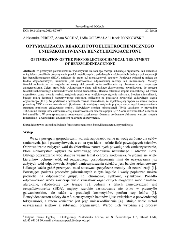 optymalizacja reakcji fotoelektrochemicznego unieszkodliwiania