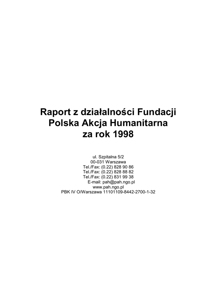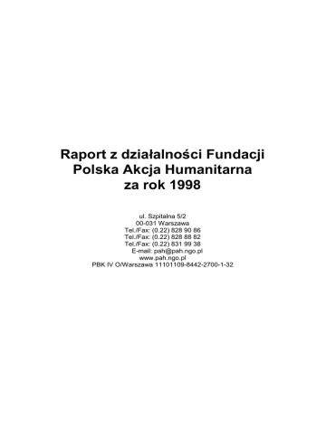 Raport z działalności Fundacji Polska Akcja Humanitarna za rok 1998 ul. Szpitalna 5/2 00-031 Warszawa Tel./Fax: (0.22) 828 90 86 Tel./Fax: (0.22) 828 88 82 Tel./Fax: (0.22) 831 99 38 E-mail: [email protected] www.pah.ngo.pl PBK IV O/Warszawa 11101109-8442-2700-1-32 Spis treści I informacje ogólne o Fundacji II. działalność statutowa A. konwoje z pomocą humanitarną B. Odbudowa szkoły w Sarajewie C. Dożywianie dzieci na Litwie D. Akcja “Pajacyk” E. Pomoc powodzianom F. IV Pielgrzymka Polaków z Kazachstanu i Paczka świąteczna dla Polaków w Kazachstanie 98 G. Akcja “Mikołaj” H. Program Edukacji Humanitarnej I. Centrum Pomocy Uchodźcom J. Biura Regionalne III Sprawozdanie finansowe za rok 1998 I. INFORMACJE OGÓLNE O FUNDACJI Sprawozdanie z działalności Polskiej Akcji Humanitarnej za rok 1998. 2 1. Nazwa organizacji: Polska Akcja Humanitarna 2. Adres: ul. Szpitalna 5/2, 00-031 Warszawa 3. Telefon / Fax: (0.22) 828 90 86, 831.99.38, 828.88.82 e-mail: [email protected] www.pah.ngo.pl 4. Bank, który obsługuje organizację i numer konta: PBK IV O/Warszawa 11101109-8442-2700-1-32 5. Władze organizacji: Rada Fundatorów Zarząd Komisja Rewizyjna 6. Data rejestracji i numer księgi rejestrowej fundacji: 20 grudnia 1994, Sąd Rejonowy dla Miasta Stołecznego Warszawy, Sąd Gospodarczy XXI Wydział Gospodarczy Rejestrowy; odpis z rejestru fundacji nr 4443 7. Nr regonu: 010849302 8. Zarząd Fundacji: Prezes zarządu: Janina Ochojska, zam. w Toruniu, ul. Teligi 3A/81 Członkowie zarządu: 1. Włodzimierz Sarna, zam. w Warszawie, ul. Bruzdowa 93A 2. Grzegorz Gruca, zam. w Warszawie, ul. Czereśniowa 49 3. Agnieszka Marcinkowska, zam. w Warszawie, ul. Krucza 51/81 4. Aleksandra Rezunow, zam. w Warszawie, ul. Sokołowska 24/26 m. 47 9. Cele Organizacji: Misją Polskiej Akcji Humanitarnej jest dostarczanie pomocy ofiarom wojen i kataklizmów za granicą i w Polsce, a także trafiającym do naszego kraju uchodźcom. PAH chce przyczynić się do budowy społeczeństwa odpowiedzialnego, zdolnego zarówno do samopomocy, jak i pomagania innym. Fundacja Polska Akcja Humanitarna: • udziela pomocy humanitarnej w krajach b. Jugosławii, Czeczenii, Kazachstanie i na Litwie • propaguje w szkołach idee humanitaryzmu i tolerancji w ramach programu Edukacja Humanitarna • prowadzi Centrum Pomocy Uchodźcom • organizuje akcje pomocy w Polsce • organizowanie konwojów z pomocą humanitarną - niesienie pomocy ludziom najbardziej potrzebującym bez względu na ich religię, narodowość i poglądy polityczne; • program Edukacja Humanitarna - propagowanie idei pomocy humanitarnej, rozwijanie wrażliwości dzieci i młodzieży na potrzeby innych; • pomoc prawna i socjalna dla uchodźców znajdujących się w Polsce (program finansowany Sprawozdanie z działalności Polskiej Akcji Humanitarnej za rok 1998. 3 przez UNHCR); • organizowanie pomocy dla dzieci z biednych rodzin i dzieci upośledzonych w Polsce. 10. Struktura organizacyjna Fundacji - biura regionalne: 90-423 Łódź, ul. Piotrkowska 85, tel. 630.34.28; tel./fax 630.34.27 87-100 Toruń, ul. Wielkie Garbary 2, tel./fax 652.13.74 31-010 Kraków, Rynek Główny 29, II p.; tel./fax 42.21.771, fax. 42.20.819 11. Zatrudnienie A. Biuro warszawskie: 1. Janina Ochojska – prezes zarządu i prowadzący programy 2. Zuzanna Szatkowska - odpowiedzialna za zbiórkę darów 3. Beata Ristowska - dyrektor Centrum Pomocy Uchodźcom 4. Ania Sarmiento - pracownik socjalny Centrum Pomocy Uchodźcom 5. Andrzej Czajkowski - pracownik socjalny Centrum Pomocy Uchodźcom 6. Małgorzata Gebert - pracownik socjalny Centrum Pomocy Uchodźcom 7. Ania Kołodziejska - pracownik socjalny Centrum Pomocy Uchodźcom (pół etatu) 8. Iza Majewska - asystent administracyjny Centrum Pomocy Uchodźcom (pół etatu) 9. Grzegorz Gruca - dyrektor biura 10. Zofia Winawer - specjalista PR 11. Marcin Wojtalik - program Edukacji Humanitarnej 12. Małgorzata Świderska - sekretariat 13. Jolanta Kolasa - magazynier 14. Księgowość jest prowadzona przez firmę księgową B. Biuro łódzkie 1. Anna Stawiana - dyrektor biura 2. Elżbieta Sajewicz - pracownik programowy 3. Katarzyna Sekieta - prowadzenie świetlicy środowiskowej C. Biuro toruńskie 1. Dorota Wiśniewska - dyrektor biura 2. Katarzyna Wiśniewska - pracownik programowy 3. Katarzyna Marcinkowska - pracownik administracyjny 4. Arkadiusz Lewandowski - poborowy odbywający w PAH zastępczą służbę wojskową D. Biuro krakowskie 1. Beata Gospodarek - dyrektor biura 2. Agnieszka Szpala – pracownik administracyjny Sprawozdanie z działalności Polskiej Akcji Humanitarnej za rok 1998. 4 II. DZIAŁALNOŚĆ STATUTOWA A. Konwoje z pomocą humanitarną 1. Data wyjazdu: 20 maja 1998 Litwa Ilość ciężarówek: 1 Ilość ton: 0,75 Wartość: 21.077 zł Wyposażenie dla pracowni komputerowych dla szkoły średniej nr 1 w Solecznikach (12 komputerów i 2 drukarki) i w szkoły średniej Ejszyszkach (12 komputerów i 2 drukarki) 2. Data wyjazdu: 20 czerwca 1998 Afganistan Ilość ciężarówek: 3 Ilość ton: 39 Wartość: 285.900 zł Pomoc humanitarna w postaci leków i środków opatrunkowych, namiotów, koców i żywności została dostarczona ofiarom trzęsienia ziemi w Afganistanie (luty maj 1998r.) Większość darów została zakupiona dzięki firmie INTER COMMERCE z Warszawy, samochodów ciężarowych użyczyły firmy: MAZOWIA Warszawa, OVER Płock, MARI-CAR Poznań, BREWITER Warszawa. Konwój ubezpieczało TUiR Warta S.A. W realizacji konwoju pomogło wiele innych firm i osób prywatnych z całego kraju. 13 lipca konwój dotarł do Duszanbe (Tadżykistan), skąd dary przewieziono helikopterami Międzynarodowego Czerwonego Krzyża do położonego w rejonie trzęsienia ziemi miasteczka Rostaq (afgańska prowincja Takhar). Uczestnicy konwoju PAH mogli przekonać się o potrzebach i stratach osobiście, odwiedzając m.in. wioskę Dashtak. Podczas kataklizmu zginęła tam połowa trzytysięcznej ludności, a pozos