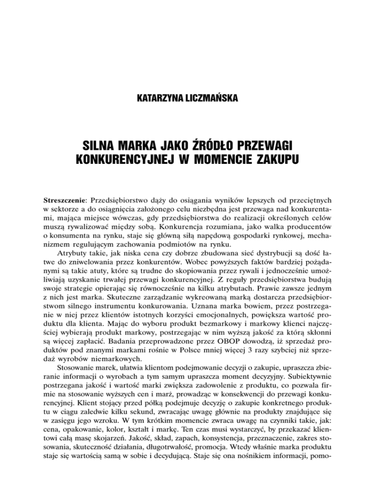 KATARZYNA LICZMAŃSKA SILNA MARKA JAKO ŹRÓDŁO PRZEWAGI KONKURENCYJNEJ W MOMENCIE ZAKUPU Streszczenie: Przedsiębiorstwo dąży do osiągania wyników lepszych od przeciętnych w sektorze a do osiągnięcia założonego celu niezbędna jest przewaga nad konkurentami, mająca miejsce wówczas, gdy przedsiębiorstwa do realizacji określonych celów muszą rywalizować między sobą. Konkurencja rozumiana, jako walka producentów o konsumenta na rynku, staje się główną siłą napędową gospodarki rynkowej, mechanizmem regulującym zachowania podmiotów na rynku. Atrybuty takie, jak niska cena czy dobrze zbudowana sieć dystrybucji są dość łatwe do zniwelowania przez konkurentów. Wobec powyższych faktów bardziej pożądanymi są takie atuty, które są trudne do skopiowania przez rywali i jednocześnie umożliwiają uzyskanie trwałej przewagi konkurencyjnej. Z reguły przedsiębiorstwa budują swoje strategie opierając się równocześnie na kilku atrybutach. Prawie zawsze jednym z nich jest marka. Skuteczne zarządzanie wykreowaną marką dostarcza przedsiębiorstwom silnego instrumentu konkurowania. Uznana marka bowiem, przez postrzeganie w niej przez klientów istotnych korzyści emocjonalnych, powiększa wartość produktu dla klienta. Mając do wyboru produkt bezmarkowy i markowy klienci najczęściej wybierają produkt markowy, postrzegając w nim wyższą jakość za którą skłonni są więcej zapłacić. Badania przeprowadzone przez OBOP dowodzą, iż sprzedaż produktów pod znanymi markami rośnie w Polsce mniej więcej 3 razy szybciej niż sprzedaż wyrobów niemarkowych. Stosowanie marek, ułatwia klientom podejmowanie decyzji o zakupie, upraszcza zbieranie informacji o wyrobach a tym samym upraszcza moment decyzyjny. Subiektywnie postrzegana jakość i wartość marki zwiększa zadowolenie z produktu, co pozwala firmie na stosowanie wyższych cen i marż, prowadząc w konsekwencji do przewagi konkurencyjnej. Klient stojący przed półką podejmuje decyzję o zakupie konkretnego produktu w ciągu zaledwie kilku sekund, zwracając uwagę głównie na produkty znajdujące się w zasięgu jego wzroku. W tym krótkim momencie zwraca uwagę na czynniki takie, jak: cena, opakowanie, kolor, kształt i markę. Ten czas musi wystarczyć, by przekazać klientowi całą masę skojarzeń. Jakość, skład, zapach, konsystencja, przeznaczenie, zakres stosowania, skuteczność działania, długotrwałość, promocja. Wtedy właśnie marka produktu staje się wartością samą w sobie i decydującą. Staje się ona nośnikiem informacji, pomo- 88 Katarzyna Liczmańska stem łączącym firmę z produktem a produkt z klientem. Wszystkie te informacje w tak krótkim czasie można przekazać jedynie za pośrednictwem marki. Słowa kluczowe: przewaga konkurencyjna, marka, silna marka, konkurencja, konkurencyjność, strategia konkurencji, instrumenty konkurowania, decyzje zakupowe, 1. WSTĘP Wzrastająca konkurencja a w konsekwencji mnogość i różnorodność oferty produktowej powodują nowe wyzwania dla przedsiębiorców liczących na sukces rynkowy swojej firmy. Dodatkowo drastycznie wzrastają koszty wprowadzenia na rynek nowego produktu, przy czym wydatkowana kwota wcale nie gwarantuje sukcesu. Uzyskanie przewagi konkurencyjnej jest dla przedsiębiorstwa jednym z podstawowych warunków odniesienia sukcesu na rynku. W tej sytuacji najkorzystniejszym rozwiązaniem staje się konsekwentne budowanie silnych marek. Marka – jak twierdzi Philip Kotler – to nie znaczek, to pewnego rodzaju przyrzeczenie, obietnica, to ona powinna kształtować całe zachowanie i strategię działania firmy. Jest całą marketingową komunikacją w pigułce.1 Coraz więcej przedsiębiorstw uświadamia sobie, że bez własnej marki ich dalsze funkcjonowanie może być zagrożone. 2. POJĘCIA KONKURENCJI I PRZEWAGI KONKURENCYJNEJ Coraz większe problemy z utrzymaniem się na rynku, gwałtownie rosnąca ilość konkurentów sprawiają, iż przedsiębiorstwa formułują strategie, które pozwalają uzyskać przewagę konkurencyjną. Przedsiębiorstwo, które chce ją uzyskać, musi oferować produkt, który będzie postrzegany przez kupującego jako dostarczający najwyższej wartości, atrakcyjniejszy i najlepiej jeszcze tańszy od oferty konkurentów. Kluczowym pojęciem w zarządzaniu strategicznym jest przewaga konkurencyjna, polegająca na tym, by w ramach wybranej domeny być bardziej atrakcyjnym partnerem niż inne firmy. Przedsiębiorstwo dąży do osiągania wyników lepszych od przeciętnych w sektorze, a do realizacji założeń niezbędna jest przewaga nad konkurentami decydująca o zdolności do konkurowania firmy. Konkurencja rozumiana jako walka producentów o konsumenta na rynku, staje się główną siłą napędową gospodarki rynkowej, mechanizmem regulującym zachowania podmiotów na rynku. Ma miejsce wówczas, gdy przedsiębiorstwa do realizacji określonych celów muszą rywalizować między sobą. Dążąc do realizacji swoich założeń powinny uwzględniać uwarunkowania wewnątrzorga1 Ph. Kotler, the New marketing and sales-strategies and tactics,XIX Seminar of the Series Autorities, 17.05.2006. Silna marka jako źródło przewagi konkurencyjnej w momencie zakupu 89 nizacyjne oraz zewnętrzne, w tym zwłaszcza te, które zmieniają warunki konkurowania.2 Za podstawową definicję konkurencji, autorka przyjęła zaprezentowaną przez M.J. Stankiewicza: „Konkurencją nazywa się zjawisko, którego uczestnicy rywalizują między sobą w dążeniach do analogicznych celów, co oznacza, że działania podejmowane przez jednych dla osiągania określonych celów, utrudniają (a nawet niekiedy uniemożliwiają) osiąganie takich samych celów przez innych.”3 Tak złożone pojęcie ekonomiczne, jakim jest konkurencyjność, może być rozpatrywane na różnych poziomach, pomiędzy którymi istnieje ścisła zależność wewnętrzna i zewnętrzna, np.: konkurencyjności produktu