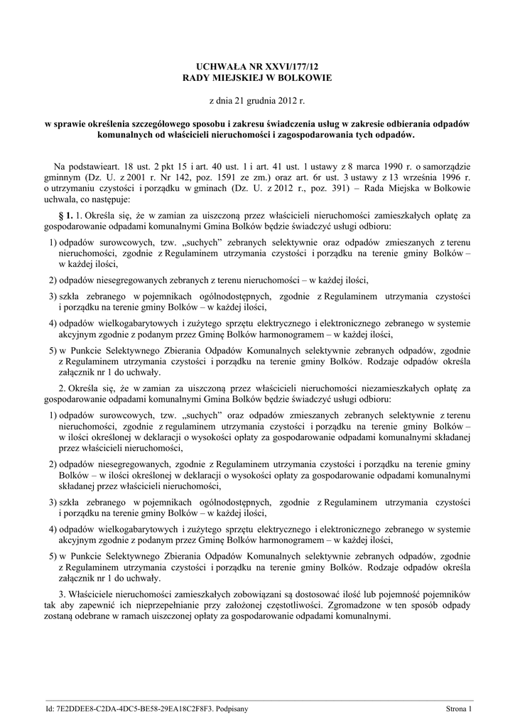 UCHWAŁA NR XXVI/177/12 RADY MIEJSKIEJ W BOLKOWIE z dnia 21 grudnia 2012 r. w sprawie określenia szczegółowego sposobu i zakresu świadczenia usług w zakresie odbierania odpadów komunalnych od właścicieli nieruchomości i zagospodarowania tych odpadów. Na podstawieart. 18 ust. 2 pkt 15 i art. 40 ust. 1 i art. 41 ust. 1 ustawy z 8 marca 1990 r. o samorządzie gminnym (Dz. U. z 2001 r. Nr 142, poz. 1591 ze zm.) oraz art. 6r ust. 3 ustawy z 13 września 1996 r. o utrzymaniu czystości i porządku w gminach (Dz. U. z 2012 r., poz. 391) – Rada Miejska w Bolkowie uchwala, co następuje: § 1. 1. Określa się, że w zamian za uiszczoną przez właścicieli nieruchomości zamieszkałych opłatę za gospodarowanie odpadami komunalnymi Gmina Bolków będzie świadczyć usługi odbioru: 1) odpadów surowcowych, tzw. „suchych” zebranych selektywnie oraz odpadów zmieszanych z terenu nieruchomości, zgodnie z Regulaminem utrzymania czystości i porządku na terenie gminy Bolków – w każdej ilości, 2) odpadów niesegregowanych zebranych z terenu nieruchomości – w każdej ilości, 3) szkła zebranego w pojemnikach ogólnodostępnych, zgodnie z Regulaminem utrzymania czystości i porządku na terenie gminy Bolków – w każdej ilości, 4) odpadów wielkogabarytowych i zużytego sprzętu elektrycznego i elektronicznego zebranego w systemie akcyjnym zgodnie z podanym przez Gminę Bolków harmonogramem – w każdej ilości, 5) w Punkcie Selektywnego Zbierania Odpadów Komunalnych selektywnie zebranych odpadów, zgodnie z Regulaminem utrzymania czystości i porządku na terenie gminy Bolków. Rodzaje odpadów określa załącznik nr 1 do uchwały. 2. Określa się, że w zamian za uiszczoną przez właścicieli nieruchomości niezamieszkałych opłatę za gospodarowanie odpadami komunalnymi Gmina Bolków będzie świadczyć usługi odbioru: 1) odpadów surowcowych, tzw. „suchych” oraz odpadów zmieszanych zebranych selektywnie z terenu nieruchomości, zgodnie z regulaminem utrzymania czystości i porządku na terenie gminy Bolków – w ilości określonej w deklaracji o wysokości opłaty za gospodarowanie odpadami komunalnymi składanej przez właścicieli nieruchomości, 2) odpadów niesegregowanych, zgodnie z Regulaminem utrzymania czystości i porządku na terenie gminy Bolków – w ilości określonej w deklaracji o wysokości opłaty za gospodarowanie odpadami komunalnymi składanej przez właścicieli nieruchomości, 3) szkła zebranego w pojemnikach ogólnodostępnych, zgodnie z Regulaminem utrzymania czystości i porządku na terenie gminy Bolków – w każdej ilości, 4) odpadów wielkogabarytowych i zużytego sprzętu elektrycznego i elektronicznego zebranego w systemie akcyjnym zgodnie z podanym przez Gminę Bolków harmonogramem – w każdej ilości, 5) w Punkcie Selektywnego Zbierania Odpadów Komunalnych selektywnie zebranych odpadów, zgodnie z Regulaminem utrzymania czystości i porządku na terenie gminy Bolków. Rodzaje odpadów określa załącznik nr 1 do uchwały. 3. Właściciele nieruchomości zamieszkałych zobowiązani są dostosować ilość lub pojemność pojemników tak aby zapewnić ich nieprzepełnianie przy założonej częstotliwości. Zgromadzone w ten sposób odpady zostaną odebrane w ramach uiszczonej opłaty za gospodarowanie odpadami komunalnymi. ——————————————————————————————————————————————————————— Id: 7E2DDEE8-C2DA-4DC5-BE58-29EA18C2F8F3. Podpisany Strona 1 4. W przypadku przekroczenia ilości zebranych odpadów komunalnych określonych w ust. 2 właściciele nieruchomości niezamieszkałych na których powstały odpady, winni są wyposażyć nieruchomość w dodatkowy pojemnik oraz dokonać korekty złożonej deklaracji o wysokości opłaty za gospodarowanie odpadami komunalnymi. 5. Odpady powstałe na terenie nieruchomości, posegregowane niezgodnie z Regulaminem utrzymania czystości i porządku na terenie gminy Bolków, traktowane będą jako niesegregowane odpady komunalne. § 2. Odbieranie odpadów komunalnych od właściciela nieruchomości będzie prowadzonez częstotliwością: 1) niesegregowane lub zmieszane odpady komunalne – nie rzadziej niż raz na dwa tygodnie, 2) selektywnie zebrane odpady surowcowe (tzw. „suche”) – nie rzadziej niż raz na miesiąc, 3) opakowania szklane – nie rzadziej niż raz na kwartał. § 3. 1. Punkt Selektywnego Zbierania Odpadów Komunalnych (PSZOK) mieści się na terenie byłego wysypiska śmieci w Wierzchosławicach. 2. Informacja o godzinach otwarcia PSZOK znajduje się na stronie internetowej gminy Bolków (www.bolkow.pl) oraz na tablicy informacyjnej przy wjeździe na teren PSZOK. 3. W PSZOK przyjmowane są odpady dostarczone przez właścicieli nieruchomości z terenu gminy Bolków określone w załączniku nr 1 do uchwały. 4. Funkcjonowanie PSZOK określa regulamin, który stanowi załącznik nr 2 do uchwały. § 4. Wykonanie uchwały powierza się Burmistrzowi Bolkowa. § 5. Uchwała podlega ogłoszeniu w Dzienniku Urzędowym Województwa Dolnośląskiego i wchodzi w życiez dniem 1 lipca 2013 r. Przewodniczący Rady mgr inż. Marek Janas ——————————————————————————————————————————————————————— Id: 7E2DDEE8-C2DA-4DC5-BE58-29EA18C2F8F3. Podpisany Strona 2 Załącznik Nr 1 do Uchwały Nr XXVI/177/12 Rady Miejskiej w Bolkowie z dnia 21 grudnia 2012 r. Kod odpadu Rodzaj odpadu 1 Charakterystyka 20 01 01 Papier i tektura Opakowania z papieru i tektury, gazety, katalogi, reklamówki papierowe 20 01 10 Odzież 20 01 11 Tekstylia 20 01 21* Lampy fluorescencyjne i inne odpady zawierające rtęć Świetlówki liniowe do długości 1,5 m, kompaktowe, niskoprężne lampy sodowe, termometry rtęciowe 20 01 23* Urządzenia zawierające freony chłodziarki, zamrażarki, kli