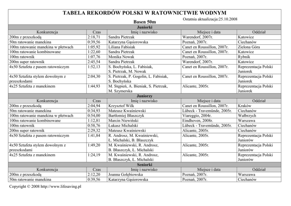 TABELA REKORDÓW POLSKI W RATOWNICTWIE WODNYM Basen 50m Konkurencja 200m z przeszkodą 50m ratowanie manekina 100m ratowanie manekina w płetwach 100m ratowanie kombinowane 100m ratownik 200m super ratownik 4x50 Sztafeta z pasem ratowniczym Czas 2:18,71 0:39,56 1:05,92 1:22,60 1:07,76 2:45,54 1:52,13 4x50 Sztafeta stylem dowolnym z przeszkodami 4x25 Sztafeta z manekinem 2:04,30 Konkurencja 200m z przeszkodą 50m ratowanie manekina 100m ratowanie manekina w płetwach 100m ratowanie kombinowane 100m ratownik 200m super ratownik 4x50 Sztafeta z pasem ratowniczym Czas 2:04,94 0:34,93 0:54,00 1:12,81 0:58,76 2:29,32 1:41,84 4x50 Sztafeta stylem dowolnym z przeszkodami 4x25 Sztafeta z manekinem 1:49,20 Konkurencja 200m z przeszkodą 50m ratowanie manekina Czas 2:12,20 0:39,56 Copyright © 2008 http://www.lifesaving.pl 1:44,93 1:24,19 Juniorki Imię i nazwisko Sandra Pietrzak Katarzyna Gąsiorowska Liliana Fabisiak Sandra Pietrzak Monika Nowak Sandra Pietrzak S. Bochyńska, L. Fabisiak, S. Pietrzak, M. Nowak S. Pietrzak, P. Gogolin, L. Fabisiak, S. Bochyńska M. Stępień, A. Bieniak, S. Pietrzak, M. Szymerska Juniorzy Imię i nazwisko Krzysztof Wilk Mateusz Kwaśniewski Bartłomiej Błaszczyk Marcin Niewiński Łukasz Michalski Mateusz Kwaśniewski R. Androsz, M. Kwaśniewski, Ł. Michalski, B. Błaszczyk M. Kwaśniewski, R. Androsz, B. Błaszczyk, Ł. Michalski M. Kwaśniewski, R. Androsz, B. Błaszczyk, Ł. Michalski Seniorki Imię i nazwisko Joanna Gołębiowska Katarzyna Gąsiorowska Ostatnia aktualizacja:25.10.2008 Miejsce i data Warendorf, 2007r. Poznań, 2007r. Canet en Roussillon, 2007r. Canet en Roussillon, 2007r. Poznań, 2007r. Warendorf, 2007r. Canet en Roussillon, 2007r. Canet en Roussillon, 2007r. Alicante, 2005r. Miejsce i data Canet en Roussillon, 2007r. Lübeck - Travemünde, 2005r. Viareggio, 2004r. Eindhoven, 2008r. Lübeck - Travemünde, 2005r. Alicante, 2005r. Alicante, 2005r. Alicante, 2005r. Alicante, 2005r. Miejsce i data Poznań, 2007r. Poznań, 2007r. Oddział Katowice Ciechanów Zielona Góra Katowice Rybnik Katowice Reprezentacja Polski Juniorek Reprezentacja Polski Juniorek Reprezentacja Polski Juniorek Oddział Kraków Ciechanów Wałbrzych Warszawa Ciechanów Ciechanów Reprezentacja Polski Juniorów Reprezentacja Polski Juniorów Reprezentacja Polski Juniorów Oddział Warszawa Ciechanów 100m ratowanie manekina w płetwach 100m ratowanie kombinowane 100m ratownik 200m super ratownik 4x50 Sztafeta z pasem ratowniczym 1:01,98 1:19,75 1:03,38 2:38,23 1:52,92 4x50 Sztafeta stylem dowolnym z przeszkodami 1:59,04 4x25 Sztafeta z manekinem 1:41,78 4x50 Sztafeta ratownicza zmienna 2:26,31 Konkurencja 200m z przeszkodą 50m ratowanie manekina 100m ratowanie manekina w płetwach 100m ratowanie kombinowane 100m ratownik 200m super ratownik 4x50 Sztafeta z pasem ratowniczym Czas 2:02,27 0:32,01 0:51,85 1:06,19 0:57,04 2:24,40 1:34,99 4x50 Sztafeta stylem dowolnym z przeszkodami 4x25 Sztafeta z manekinem 1:46,70 4x50 Sztafeta ratownicza zmienna 1:56,37 Konkurencja 200m z przeszkodą Czas 2:12,20 Copyright © 2008 http://www.lifesaving.pl 1:21,42 Agnieszka Marianek Joanna Gołębiowska Agnieszka Marianek Agnieszka Marianek Joanna Gołębiowska, Anna Draczyńska, Katarzyna Gąsiorowska, Agnieszka Marianek Joanna Gołębiowska, Anna Draczyńska, Katarzyna Gąsiorowska, Agnieszka Marianek Joanna Gołębiowska, Agnieszka Marianek, Katarzyna Gąsiorowska, Katarzyna Szymańska Krzeminska, Foltynska, Pasikowska, Sulewska Seniorzy Imię i nazwisko Paweł Dziechcierewicz Jarosław Mazurek Jarosław Mazurek Jarosław Mazurek Marcin Pyrzyński Marcin Pyrzyński Marcin Pyrzyński, Wojciech Sadowski, Jarosław Mazurek, Daniel Bugdol Mateusz Kwaśniewski, Bartłomiej Bober, Marcin Pyrzyński, Jarosław Mazurek Wojciech Sadowski, Paweł Dziechcierewicz, Jarosław Mazurek, Robert Androsz Artur Przywara, Krzysztof Wabicz, Marek Grelewicz, Wojciech Blechar Masters 25 – 29 kobiety Imię i nazwisko Joanna Gołębiowska Poznań, 2007r. Poznań, 2007r. Santa Cruz, 2007r. Poznań, 2007r. Santa Cruz, 2007r. Piaseczno Warszawa Piaseczno Piaseczno Reprezentacja Polski Santa Cruz, 2007r. Reprezentacja Polski Poznań, 2007r. Mazowsze Eindhoven, 1998r. Reprezentacja Polski Oddział Miejsce i data Poznań, 2007r. Warendorf, 2007r. Poznań, 2007r. Berlin, 2008r. Poznań, 2007r. Santa Cruz, 2007r. Berlin, 2008r. Lublin Lublin Lublin Lublin Dolny Śląsk Wałbrzych Reprezentacja Polski Santa Cruz, 2007r. Reprezentacja Polski Warendorf, 2007r. Reprezentacja Polski Eindhoven, 1998r. Reprezentacja Polski Miejsce i data Poznań, 2007r. Oddział Warszawa 50m ratowanie manekina 100m ratowanie manekina w płetwach 100m ratowanie kombinowane 100m ratownik 200m super ratownik 0:40,82 1:07,58 1:19,75 1:09,91 2:43,07 Konkurencja 200m z przeszkodą 50m ratowanie manekina 100m ratowanie manekina w płetwach 100m ratowanie kombinowane 100m ratownik 200m super ratownik Czas 2:06,56 0:32,01 0:51,85 1:06,19 1:00,01 2:26,29 Konkurencja 200m z przeszkodą 50m ratowanie manekina 100m ratowanie manekina w płetwach 100m ratowanie kombinowane 100m ratownik 200m super ratownik Czas 3:05,11 1:02,06 1:33,57 Konkurencja 200m z przeszkodą 50m ratowanie manekina 100m ratowanie manekina w płetwach 100m ratowanie kombinowane 100m ratownik 200m super ratownik Czas 2:05,61 0:33,20 0:55,73 1:20,07 1:10,78 2:47,27 Konkurencja 200m z przeszkodą 50m ratowanie manekina 100m ratowanie manekina w płetwach 100m ratowanie kombinowane Czas 2:51,17 0:52,36 1:26,34 Copyright © 2008 http://www.lifesaving.pl Joanna Gołębiowska Joanna Gołębiowska Joanna Gołębiowska Joanna Gołębiowska Joanna Gołębiowska Masters 25 – 29 mężczyźni Imię i nazwisko Jarosław Mazurek Jarosław Mazurek Jarosław Mazurek Jarosław Mazurek Krzysztof Piotrowski Krzysztof Piotrowski Masters 30 – 34 kobiety Imię i nazwisko Małgorzata Bigos Małgorzata Bigos Małgorzata Bigos Masters 30 – 34 mężczyźni Imię i nazwisko Wojciech Blechar Wojciech Blechar