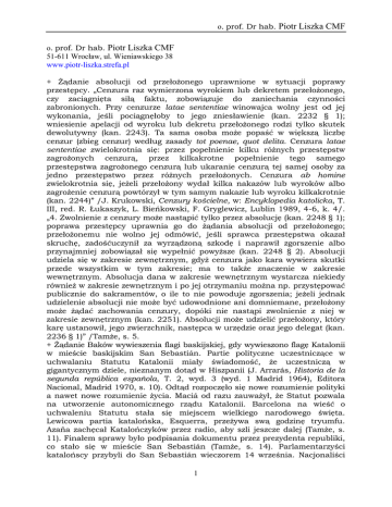 o. prof. Dr hab. Piotr Liszka CMF o. prof. Dr hab. Piotr Liszka CMF 51-611 Wrocław, ul. Wieniawskiego 38 www.piotr-liszka.strefa.pl + Żądanie absolucji od przełożonego uprawnione w sytuacji poprawy przestępcy. „Cenzura raz wymierzona wyrokiem lub dekretem przełożonego, czy zaciągnięta siłą faktu, zobowiązuje do zaniechania czynności zabronionych. Przy cenzurze latae sententiae winowajca wolny jest od jej wykonania, jeśli pociągnęłoby to jego zniesławienie (kan. 2232 § 1); wniesienie apelacji od wyroku lub dekretu przełożonego rodzi tylko skutek dewolutywny (kan. 2243). Ta sama osoba może popaść w większą liczbę cenzur (zbieg cenzur) według zasady tot poenae, quot delita. Cenzura latae sententiae zwielokrotnia się: przez popełnienie kilku różnych przestępstw zagrożonych cenzurą, przez kilkakrotne popełnienie tego samego przestępstwa zagrożonego cenzurą lub ukaranie cenzurą tej samej osoby za jedno przestępstwo przez różnych przełożonych. Cenzura ab homine zwielokrotnia się, jeżeli przełożony wydał kilka nakazów lub wyroków albo zagrożenie cenzurą powtórzył w tym samym nakazie lub wyroku kilkakrotnie (kan. 2244)” /J. Krukowski, Cenzury kościelne, w: Encyklopedia katolicka, T. III, red. R. Łukaszyk, L. Bieńkowski, F. Gryglewicz, Lublin 1989, 4-6, k. 4/. „4. Zwolnienie z cenzury może nastąpić tylko przez absolucję (kan. 2248 § 1); poprawa przestępcy uprawnia go do żądania absolucji od przełożonego; przełożonemu nie wolno jej odmówić, jeśli sprawca przestępstwa okazał skruchę, zadośćuczynił za wyrządzoną szkodę i naprawił zgorszenie albo przynajmniej zobowiązał się wypełnić powyższe (kan. 2248 § 2). Absolucji udziela się w zakresie zewnętrznym, gdyż cenzura jako kara wywiera skutki przede wszystkim w tym zakresie; ma to także znaczenie w zakresie wewnętrznym. Absolucja dana w zakresie wewnętrznym wystarcza niekiedy również w zakresie zewnętrznym i po jej otrzymaniu można np. przystępować publicznie do sakramentów, o ile to nie powoduje zgorszenia; jeżeli jednak udzielenie absolucji nie może być udowodnione ani domniemane, przełożony może żądać zachowania cenzury, dopóki nie nastąpi zwolnienie z niej w zakresie zewnętrznym (kan. 2251). Absolucji może udzielić przełożony, który karę ustanowił, jego zwierzchnik, następca w urzędzie oraz jego delegat (kan. 2236 § 1)” /Tamże, s. 5. + Żądanie Baków wywieszenia flagi baskijskiej, gdy wywieszono flagę Katalonii w mieście baskijskim San Sebastián. Partie polityczne uczestniczące w uchwalaniu Statutu Katalonii miały świadomość, że uczestniczą w gigantycznym dziele, nieznanym dotąd w Hiszpanii (J. Arrarás, Historia de la segunda república española, T. 2, wyd. 3 (wyd. 1 Madrid 1964), Editora Nacional, Madrid 1970, s. 10). Odtąd rozpoczęło się nowe rozumienie polityki a nawet nowe rozumienie życia. Maciá od razu zauważył, że Statut pozwala na utworzenie autonomicznego rządu Katalonii. Barcelona na wieść o uchwaleniu Statutu stała się miejscem wielkiego narodowego święta. Lewicowa partia katalońska, Esquerra, przeżywa swą godzinę tryumfu. Azaña zachęcał Katalończyków przez radio, aby szli jeszcze dalej (Tamże, s. 11). Finałem sprawy było podpisania dokumentu przez prezydenta republiki, co stało się w mieście San Sebastián (Tamże, s. 14). Parlamentarzyści katalońscy przybyli do San Sebastián wieczorem 14 września. Nacjonaliści 1 o. prof. Dr hab. Piotr Liszka CMF baskijscy wykorzystali ich obecność do zamanifestowania swej potęgi (José Antonio Aguirre, Entre la libertad y la revolución (1930-1935), Verdes y Achirica, Bilbao 1935 s. 319). Prezydent Zamora w przemowie z okazji podpisania dokumentu powiedział: „Uczyniliśmy coś bardzo wielkiego, coś niezmierzonego, czego jeszcze rewolucja polityczna nie zna. Uczyniliśmy historyczną konstrukcję i zaprezentowaliśmy nowy gmach dziewiczy, czysty, przestronny i jasny” (J. Arrarás, Historia…, s. 16). Gdy wywieszono flagę Katalonii tłum zażądał wywieszenia flagi baskijskiej. Wtedy Indalecio Prieto wywiesił również tę flagę. Lider socjalistów był przekonany, że Statut Kraju Basków zostanie uchwalony w krótkim czasie. Chciał ze względów politycznych pojednać się ze swoimi dawnymi adwersarzami. Starał się być wobec nich tolerancyjny, prawie wielkoduszny, a nawet w pewnych momentach patriarchalny (J. Arrarás, Historia…, s. 17). Socjaliści bali się nacjonalizmu baskijskiego z powodu jego nastawienia religijnego. Spodziewali się jednak ewolucji mas w sensie liberalnym i antyreligijnym. Prieto był wrogiem nacjonalizmów, autonomii. Obecnie jednak manifestował swoje zaangażowanie i oferował się jako przewodnik na drodze do uzyskania autonomii Kraju Basków. Dnia 19 października specjalna komisja reprezentantów baskijskich zebrała się w San Sebastián, aby wybrać nową komisję dla zaadaptowania tekstu Statutu do aktualnych wymagań (Tamże, s. 18). Do wyborów katalońskiego parlamentu stanęły w szranki następujące partie: Concentración Catalanista Rapublicana, Acción Catalan, Esquerra, Partido Radical, Lliga Regionalista, Estat Catalá, Federal, Partido Comunista, Bloque Obrero y Campesino, Alianza de Extremas Izquierdas, Derecha de Cataluńa (katolicy i monarchiści), Concentración Española, kandydaci koalicji oraz Partido Nacionalista Catalán. Anarchiści nie wystawili swoich kandydatów. „Nie pozwólcie, aby was oszukano” pisał anarchistyczny dziennik „Solidaridad Obrera” 19 listopada. „Jesteście zawsze ofiarami. Nie głosujcie”. Wygrała wybory Esquerra. System większościowy faworyzował zwycięzców. Esquerra otrzymała 192.000 głosów i miała 69 posłów, natomiast Lliga otrzymała 104.000 głosów a miała tylko 18 posłów. Prawica otrzymała 15.300, a komuniści otrzymali 10.900 głosów (Tamże, s. 22). Otwarcie parlamentu katalońskiego i pier
