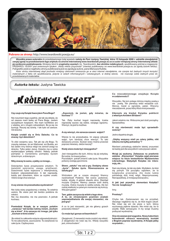 Pobrano ze strony: http://www.twardowski.poezja.eu/ Wszelkie prawa autorskie do przedstawionego tutaj wywiadu należą do Pani Justyny Tawickiej, która 15 listopada 2006 r. udzieliła nieodpłatnie swojej zgody na przedstawianie tego artykułu na stronie internetowej www.twardowski.poezja.eu za co autor niniejszej strony internetowej składa jej serdeczne podziękowania. Niniejszy tekst to oryginalny wywiad z ks. Twardowskim, bez skrótów redakcyjnych, opublikowany później w magazynie PRZEKRÓJ 15/2001 pod zmienionym tytułem: „Kiedy miłośc przychodzi” (również publikowany na www.twardowski.poezja.eu za zgodą autorki tekstu). Fotografia użyta w nagłówku strony publikowana jest za zgodą jej autora, pana Mariusza Kubika. Autor strony internetowej skąd pochodzi niniejszy dokument umieszcza go w sieci internet nieodpłatnie, nie czerpie też żadnych innych korzyści materialnych z faktu ich opublikowania, jedynie w celach informacyjnych i edukacyjnych, w dobrej wierze, nie roszcząc sobie żadnych praw do przedstawianych materiałów. Autorka tekstu: Justyna Tawicka „Królewski Sekret” Rozmowa z księdzem Janem Twardowskim Czy czuje się Ksiądz faworytem Pana Boga? Nie rozumiem tego zupełnie, ale tak się składa, że od zawsze mam łaskę od Pana Boga. Jestem szczęśliwym księdzem. Nie mam konfliktów ani z władzą, ani z drugim człowiekiem. Bo ja się nie buntuję. Raczej się dziwię. I tak było od zawsze. Od dziecka. Co niecodziennego znajduje Ksiądz w codzienności? Wszystko. Na tym polega różnica między poetą a nie poetą. Ten pierwszy widzi wszędzie cud. Słonce, kwiat w ogrodzie, patyk. Wieczny niecodziennik, przez który Ktoś mnie prowadzi. „Zapomnij, że jesteś, gdy mówisz, że kochasz”? Zdarzyło się kiedyś Księdzu pokłócić z własnym Aniołem Stróżem? Tak. Żeby kochać kogoś naprawdę, trzeba naprawdę wyrzec się siebie, swojego egoizmu. Wierzyć, że jest to możliwe. Jakoś ostatnio nie. Widocznie jest dość porządny. Sprawiedliwy. A czy nierówność może być sprawiedliwością? A czy wierzyć, nie oznacza czasem wątpić? Ksiądz urodził się w Dniu Dziecka. Co to znaczy: być dzieckiem? To ufać swojemu ojcu. Tak jak się ufa Bogu. To zresztą ciekawe, że ani Mahomet, ani Budda, ani też żaden inny twórca religii nie zwrócił uwagi na dziecko. Tylko jeden Jezus. Dziecko ma w sobie wystarczające pokłady ufności. Należy jednak pamiętać o rozróżnieniu pomiędzy byciem dziecinnym, a dziecięcym. Niby znaczy to samo, a jakby co innego... Dziecięctwo bywa przypisywane artystom. To świeżość spojrzenia, uwaga, wrażliwość. Dziecinność bywa kojarzona z infantylnością, brakiem odpowiedzialności. A tak naprawdę, każdy jest dzieckiem, które za szybko urosło. I które wciąż chce wierzyć. A czy wierze nie przeszkadza wyobraźnia? Nie lubię wiary pogodzonej z wiedzą. Ta ostatnia uwiera. Bo wiara jest tak bardzo podobna do miłości. Nie ma dowodów, nie ma pewności. A jednak kochasz. Jedno dopełnia drugie. Wierze to nie przeszkadza. Im więcej człowiek wątpi, tym bardziej chce wierzyć. To taki dziwaczny proces. Szukać wiary można przecież poprzez niewiarę. Jakże inaczej? Kiedy wiara może być niewygodna? Jest niewygodna dla tych, którzy się jej wstydzą. Bo ludzie, bo towarzystwo... Pozostałym potrafi zmienić całe życie. Wszystkie potwory zostają ujarzmione. Słowo „sztuka” ma coś z gry. Dodajmy słowo „życie”. Sztuka życia. Równoznaczna ze sztuką gry? Widziałem jak w czasie okupacji Niemcy rozstrzeliwali Polaków. Tak scena: podwórze, ludzie, strzały. A gdzieś otwarte okno. Stamtąd muzyka Chopina. Niemcy zawsze lubili dobrą muzykę. Dobra muzyka to wielka sztuka. Ale ten rodzaj wielkości w pewnym momencie się kończy. Wie pani gdzie? Tam, gdzie zaczyna się widok z tego okna. A to, że chrześcijanin powinien znaleźć usprawiedliwienie dla swojej nienawiści, nie jest grą? Powiedział Ksiądz, że w naszym polskim „narzeczu” tak bardzo lubimy mówić „kocham się w kimś”. A to oznacza nic innego, jak tylko „kocham w kimś siebie”. Co może być gorsze od bezmiłości? Bo miłość to całkowite wzięcie odpowiedzialności. To nie zakochanie, zauroczenie. To cierpliwość na całe życie. Ciężka praca. Obojętność. Z nienawiści może zrodzić się miłość. Z obojętności nie rodzi się nic. Wtedy wszystko jest „mimochodem”. A co to jest nienawiść, jak nie główny grzech przeciwko miłości? Str. 1 z 2 „Gdyby wszyscy mieli po cztery jabłka, nikt nikomu nie byłby potrzebny”? Nierówni potrzebują siebie/im łatwiej zrozumieć że każdy jest dla wszystkich i odczytywać całość. Wciąż jej szukamy. Zwłaszcza na przełomie wieków. „Elementarz” Księdza zajął pierwsze miejsce na liście bestsellerów Wydawnictwa Literackiego. Statystyki Księdza nie interesują, ale... Sam się dziwię, że tak się stało. Myślałem, że ktoś się pomylił. Od początku sądziłem, że to książeczka przeciętna. Ale może ludzie potrzebują dziś innej religii. Nieprzymusowej. Nienapastliwej. Z mniejszą ilością lukru. A jaki jest prywatny elementarz Księdza? Ten nie książkowy? Inny. Prostszy? Chyba tak. Zastanawiam się na przykład, dlaczego nagłaśnia się to, że ktoś kogoś udusił. Nie mówi się ani nie pisze o tych, którzy wychowują pięknie dziecko. Nie mówi się, bo to zwykłe. Mało sensacyjne. A my wciąż musimy podsycać wyobraźnię. Ona nie zawsze jest wygodna. Nowy katechizm holenderski odrzuca wewnętrzny kontakt z Bogiem poprzez wyobraźnię. A Ksiądz jakby na przekór... Pobrano ze strony: h ttp://www.twardowski.poezja.eu Racjonalizm jest w wierze niepotrzebny. Wiara jak miłość. Intuicyjnie wie, co dla niej dobre. Jest cały czas. Miłość bez wzajemności jest wielkim szczęściem. A które z pytań są „tak wielkie, że aż nieruchome”? Czy można obrazić Boga nie wierząc w Niego? U Dante