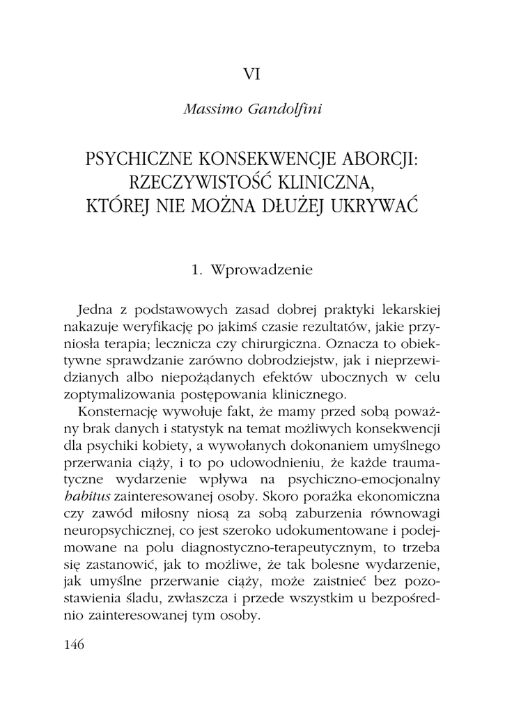VI Massimo Gandolfini PSYCHICZNE KONSEKWENCJE ABORCJI: RZECZYWISTOŚĆ KLINICZNA, KTÓREJ NIE MOŻNA DŁUŻEJ UKRYWAĆ 1. Wprowadzenie Jedna z podstawowych zasad dobrej praktyki lekarskiej nakazuje weryfikację po jakimś czasie rezultatów, jakie przyniosła terapia; lecznicza czy chirurgiczna. Oznacza to obiektywne sprawdzanie zarówno dobrodziejstw, jak i nieprzewidzianych albo niepożądanych efektów ubocznych w celu zoptymalizowania postępowania klinicznego. Konsternację wywołuje fakt, że mamy przed sobą poważny brak danych i statystyk na temat możliwych konsekwencji dla psychiki kobiety, a wywołanych dokonaniem umyślnego przerwania ciąży, i to po udowodnieniu, że każde traumatyczne wydarzenie wpływa na psychiczno-emocjonalny habitus zainteresowanej osoby. Skoro porażka ekonomiczna czy zawód miłosny niosą za sobą zaburzenia równowagi neuropsychicznej, co jest szeroko udokumentowane i podejmowane na polu diagnostyczno-terapeutycznym, to trzeba się zastanowić, jak to możliwe, że tak bolesne wydarzenie, jak umyślne przerwanie ciąży, może zaistnieć bez pozostawienia śladu, zwłaszcza i przede wszystkim u bezpośrednio zainteresowanej tym osoby. 146 Badanie w tym kierunku jest konieczne przynajmniej z dwóch powodów. Z szacunku do kobiety, która prosi o przerwanie ciąży i która ma prawo poznać wszystkie implikacje medyczne i psychiczne, jakie niesie ten zabieg (bowiem nieobiektywna „zgoda poinformowanej” jest niedozwolona i naganna). A także z uwagi na wiedzę medyczną, która wymaga rozważenia dokonywanych wyborów klinicznych – także na podstawie konsekwencji, jakie one przynoszą. Jeżeli chodzi o rezultaty przerywania ciąży, to we Włoszech panuje prawie całkowita niewiedza. Polityczne tabu cechujące minioną i aktualną historię ustawy 194 zdołało zmusić do milczenia nawet naukę. Wydawać by się mogło, że we Włoszech można rozmawiać, dyskutować, krytykować, nawet obrażać wszystko i wszystkich, nie można jednak ruszać ustawy o legalizacji aborcji pod karą wykluczenia ze świata kultury i demokracji. W innych krajach już od lat coś się dzieje: debata naukowa, uwolniona od ciężaru radykalnego przeciwstawiania zwolenników laickości katolikom (które tyle zła wyrządza nauce), zdecydowanie podejmuje temat psychicznych konsekwencji aborcji: dla kobiety, która jej dokonała, dla partnera, dla relacji pomiędzy nimi, dla już urodzonych dzieci, czy też dla tych, które urodzą się później, a także i dla zaangażowanego w nią personelu medycznego. 2. Badanie konsekwencji psychicznych przerwania ciąży W Stanach Zjednoczonych problem ten zaczęto podejmować w 1985 roku. Od tamtej pory opublikowano około 400 prac naukowych, przy czym jest rzeczą drugorzędną, 147 że zawierają one często sprzeczne dane i statystyki. Alarm społeczny wybuchł po serii artykułów opublikowanych przez New York Times, w których twierdzono, że w USA dochodzi do około 6 milionów ciąż rocznie, z czego 3 miliony nieplanowanych. Spośród tych ostatnich 1,3 miliona zostaje przerwanych. Na początku lat 90-tych American Psychological Association (APA, 1993) dokonało skrupulatnego przeglądu literatury na ten temat i wyciągnęło wnioski, że pojedyncze przerwanie ciąży nie powoduje chorób psychicznych długoterminowych. Natomiast w 2006 w Journal of Youth and Adolescence (Coleman, 2006) została opublikowana praca, w której stwierdzano, że aborcji sprowokowanej towarzyszy jedno z najwyższych niebezpieczeństw choroby psychicznej w stosunku do niepożądanych urodzin. Badanie narobiło tyle szumu, że Trybunał Południowej Dakoty zaproponował prawne zablokowanie aborcji. Inicjatywa upadła, ale rozpoczęła się zaciekła debata nad możliwymi konsekwencjami psychicznymi przerywania ciąży. Czasopismo Lancet 1, cytując APA jako źródło, mimo wszystko apelowało: „To, że niektóre kobiety doświadczają problemów psychicznych po aborcji, nie powinno być banalizowane (...). Kobietom, które postanawiają dokonać aborcji, należy dostarczyć stosowny pakiet późniejszej kuracji, która obejmowałaby opiekę psychologiczną, kiedy jest im potrzebna”. Jest to pośrednie potwierdzenie, że, pomijając już statystyczne dane liczbowe, problem psychologicznych rezultatów praktyki aborcyjnej istnieje i nie można go ignorować. Alarmujące jest też badanie fińskie (Gissler, Hemminki, Lonnqvist, 1996), które uwzględniło wszystkie kobiety w wieku rozrodczym, które w latach 1987-1994 popełniły 1 148 www.thelancet.com, t. 372, August 23, 2008. samobójstwo. Uwypuklono w nim, że spośród wszystkich samobójstw 5,4 proc. łączyło się z ciążą: – 5,9 proc. łączyło się z narodzeniem niechcianego dziecka; – 18,1 proc. łączyło się z poronieniem; – 34,7 proc. łączyło się z przerwaniem ciąży. Inne badanie (Reardon, 1987) przeprowadzone na kobietach, które zdradzały zaburzenia psychiczne powstałe po przerwaniu ciąży, dokumentuje, że 60 proc. z nich miało myśli samobójcze, 28 proc. próbowało dokonać samobójstwa, a 18 proc. ponawiało próbę nawet po wielu latach od aborcji. Te dane pokazują, że przerwanie ciąży zwiększa niebezpieczeństwo samobójstw u kobiet, które się go dopuściły. Jednak nie pokazują, jaki rodzaj relacji może istnieć pomiędzy tymi dwoma wydarzeniami. Innymi słowy, wskazują epidemiologicznie znaczący związek między przerwaniem ciąży i samobójstwem, ale z tego faktu nie można jeszcze stwierdzić istnienia bezpośredniego związku przyczynowo-skutkowego między ryzykiem samobójstwa i aborcją. Również w kontekście skandynawskim przeanalizowano występowanie objawów depresyjnych – po przerwaniu ciąży – u młodych kobiet w wieku od 15 do 25 lat. Oto jak można streścić rezultaty badania (Fergusson, Horwood, Ridder, 2006): – u kobiet w wieku 15-18 lat depresja jest obecna u 31,2 proc. normalnej populacji, u 35,7 proc. w okres