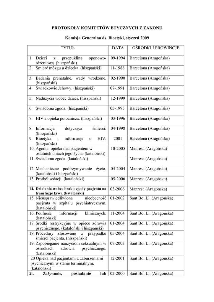 PROTOKOŁY KOMITETÓW ETYCZNYCH Z ZAKONU Komisja Generalna ds. Bioetyki, styczeń 2009 TYTUŁ DATA OŚRODKI I PROWINCJE 1. Dzieci z przepukliną oponowo- 09-1994 rdzeniową. (hiszpański) 2. Śmierć mózgu u dziecka. (hiszpański) 11-1988 Barcelona (Aragońska) 3. Badania prenatalne, wady wrodzone. 02-1990 (hiszpański) 4. Świadkowie Jehowy. (hiszpański) 07-1991 Barcelona (Aragońska) Barcelona (Aragońska) 5. Nadużycia wobec dzieci. (hiszpański) 12-1999 Barcelona (Aragońska) 6. Świadoma zgoda. (hiszpański) 05-1995 Barcelona (Aragońska) 7. HIV a opieka położnicza. (hiszpański) 03-1996 Barcelona (Aragońska) 8. Informacja dotycząca śmierci. (hiszpański) 9. Bioetyka i informacje o HIV. (hiszpański) 10. Agonia: opieka nad pacjentem w ostatnich dniach jego życia. (kataloński) 11. Świadoma zgoda. (kataloński) 04-1998 Barcelona (Aragońska) 2001 Barcelona (Aragońska) 12. Mechaniczne podtrzymywanie życia. (kataloński i hiszpański) 13. Protkół sedacji. (kataloński) 04-2004 Manresa (Aragońska) 05-2006 Manresa (Aragońska) 14. Działania wobec braku zgody pacjenta na 03-2006 transfuzję krwi. (kataloński) Manresa (Aragońska) 15. Nieusprawiedliwiona nieobecność pacjenta w szpitalu psychiatrycznym. (kataloński) 16. Poufność informacji klinicznych. (kataloński) 17. Środki restrykcyjne w opiece zdrowia psychicznego. (kataloński i hiszpański) 18. Procedury stosowane w przypadku śmierci pacjenta. (hiszpański) 19. Zapobieganie naużyciom seksualnym w ośrodkach zdrowia psychicznego. (kataloński) 20 Opieka nad pacjentami z zaburzeniami psychicznymi w stanie terminalnym. (kataloński) 21. Zażywanie, posiadanie lub 01-2002 Sant Boi Ll. (Aragońska) 11-2004 Sant Boi Ll. (Aragońska) 01-2004 Sant Boi Ll. (Aragońska) 05-2004 Sant Boi Ll. (Aragońska) 07-2003 Sant Boi Ll. (Aragońska) 12-2001 Sant Boi Ll. (Aragońska) 02-2000 Sant Boi Ll. (Aragońska) 10-2005 Barcelona (Aragońska) Manresa (Aragońska) Manresa (Aragońska) rozprowadzanie substancji psychotropowych na terenie szpitala. (kataloński) 22. Nadużycia w stosunku do osób starszych. (hiszpański) Palma de (Aragońska) 23. Wskazówki w podejmowaniu decyzji w 03-2005 nagłych przypadkach dotyczących antykoncepcji. (hiszpański) 24. Przygotowanie zwłok osoby zmarłej. 04-2008 (niemiecki) 25. Szpital – Plan działania w razie alarmu i ewakuacji. (niemiecki) 26. Karta wizyty lekarskiej. (niemiecki) 04-2008 27. Ryzyko upadku – upadek – dokumentacja. (niemiecki) 28. Wskazówki dotyczące reanimacji noworodków przedwcześnie urodzonych. 29. Wskazówki dotyczące wdrażania sponsoringu w szpitalach. 30. Wniosek o zaopiniowanie projektu badawczego. 31. Postępowanie dotyczące protokołów badawczych. 32. Sprawozdanie z przebiegu eksperymentów i ich zakończenia w odniesieniu do protokołów badawczych. 10-2007 2003 2006 2000 2007 2007 Prowincjalny Etyczny (Kastylia) Mallorca Komitet Komitet Etyczny z Eggenberg (Austria) Komitet Etyczny z Eggenberg (Austria) Komitet Etyczny z Eggenberg (Austria) Komitet Etyczny z Eggenberg (Austria) Komitet Bioetyki z Tybrzańskiej Komitet Bioetyki z Tybrzańskiej Komitet Bioetyki z Tybrzańskiej Komitet Bioetyki z Tybrzańskiej Komitet Bioetyki z Tybrzańskiej GrazGrazGrazGrazWyspy Wyspy Wyspy Wyspy Wyspy Uwaga: Aby otrzymać kopię któregokolwiek z tych dokumentów, należy zwrócić się do Sekretariatu Komisji Generalnej ds. Bioetyki, adres email [email protected], lub bezpośrednio do odpowiednich prowincji/ośrodków.