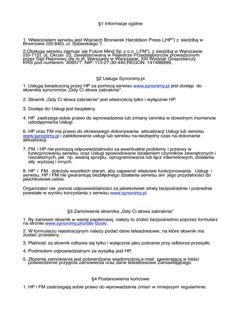 §1 Informacje ogólne 1. Właścicielem serwisu jest Wojciech Broniarek Haroldson Press („HP”) z# siedzibą w Brwinowie (05-840),#ul. Sobieskiego 7. 2.Obsługą serwisu zajmuje# się Future Mind Sp.#z o.o. („FM”),#z siedzibą w Warszawie (03-715), ul. Okrzei# 23, zarejestrowaną w Rejestrze Przedsiębiorców prowadzonym# przez Sąd Rejonowy dla m.st. Warszawy w Warszawie, XIII Wydział# Gospodarczy# KRS pod numerem# 309577, NIP:#113-27-30-440,REGON: 141498999, §2 Usługa Synonimy.pl 1. Usługą świadczoną przez HP za pomocą serwisu www.synonimy.pl jest dostęp # do# słownika synonimów „Gdy Ci słowa zabraknie”. 2. Słownik „Gdy Ci słowa zabraknie” jest#własnością tylko i wyłącznie HP. 3. Dostęp do#Usługi#jest bezpłatny. 4. HP# zastrzega sobie prawo do wprowadzenia lub zmiany cennika w dowolnym momencie udostępniania Usługi. 6. HP oraz FM ma prawo do okresowego dokonywania aktualizacji Usługi lub serwisu www.synonimy.pl i zablokowanie usługi lub serwisu na#niezbędny czas na dokonanie aktualizacji. 7. FM#i HP nie ponoszą odpowiedzialności za ewentualne problemy#i przerwy w# funkcjonowaniu serwisu# oraz Usługi spowodowane działaniem czynników zewnętrznych i niezależnych, jak# np. awarią sprzętu,#oprogramowania lub łącz internetowych, działania siły#wyższej i innych. 8. HP# i FM# dołożyły wszelkich starań, aby zapewnić właściwe funkcjonowania# Usługi i serwisu. HP i FM nie gwarantują bezbłędnego działania serwisu ani jego przydatności do jakichkolwiek#celów.# Organizator nie ponosi odpowiedzialności za jakiekolwiek straty bezpośrednie i pośrednie powstałe w wyniku korzystania z serwisu www.synonimy.pl. §3 Zamówienie słownika „Gdy Ci słowa zabraknie” 1. By zamówić słownik w wersji papierowej, należy to zrobić bezpośrednio poprzez formularz na stronie www.synonimy.pl/order-book/. 2. W formularzu rejestracyjnym należy podać dane teleadresowe, na które słownik ma zostać# przesłany. 3. Płatność za słownik odbywa się tylko i wyłącznie jako pobranie przy odbiorze przesyłki. 4. Podmiotem odpowiedzialnym za wysyłkę jest# HP. 5. Złożenie zamówienia jest potwierdzane wiadomością e-mail zawierającą w treści potwierdzenie przyjęcia zamówienia oraz dane teleadresowe Zamawiającego.# §4 Postanowienia końcowe 1. HP i FM zastrzegają sobie prawo do wprowadzenia#zmian# w niniejszym# regulaminie.