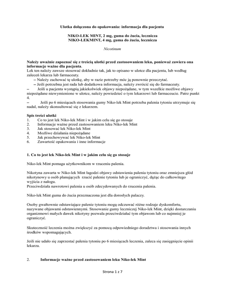 Ulotka dołączona do opakowania: informacja dla pacjenta NIKO-LEK MINT, 2 mg, guma do żucia, lecznicza NIKO-LEKMINT, 4 mg, guma do żucia, lecznicza Nicotinum Należy uważnie zapoznać się z treścią ulotki przed zastosowaniem leku, ponieważ zawiera ona informacje ważne dla pacjenta. Lek ten należy zawsze stosować dokładnie tak, jak to opisano w ulotce dla pacjenta, lub według zaleceń lekarza lub farmaceuty. − Należy zachować tę ulotkę, aby w razie potrzeby móc ją ponownie przeczytać. − Jeśli potrzebna jest rada lub dodatkowa informacja, należy zwrócić się do farmaceuty. − Jeśli u pacjenta wystąpią jakiekolwiek objawy niepożądane, w tym wszelkie możliwe objawy niepożądane niewymienione w ulotce, należy powiedzieć o tym lekarzowi lub farmaceucie. Patrz punkt 4. − Jeśli po 6 miesiącach stosowania gumy Niko-lek Mint potrzeba palenia tytoniu utrzymuje się nadal, należy skonsultować się z lekarzem. Spis treści ulotki 1. Co to jest lek Niko-lek Mint i w jakim celu się go stosuje 2. Informacje ważne przed zastosowaniem leku Niko-lek Mint 3. Jak stosować lek Niko-lek Mint 4. Możliwe działania niepożądane 5. Jak przechowywać lek Niko-lek Mint 6. Zawartość opakowania i inne informacje 1. Co to jest lek Niko-lek Mint i w jakim celu się go stosuje Niko-lek Mint pomaga użytkownikom w rzuceniu palenia. Nikotyna zawarta w Niko-lek Mint łagodzi objawy odstawienia palenia tytoniu oraz zmniejsza głód nikotynowy u osób planujących rzucić palenie tytoniu lub je ograniczyć, dążąc do całkowitego wyjścia z nałogu. Przeciwdziała nawrotowi palenia u osób zdecydowanych do rzucenia palenia. Niko-lek Mint guma do żucia przeznaczona jest dla dorosłych palaczy. Osoby gwałtownie odstawiające palenie tytoniu mogą odczuwać różne rodzaje dyskomfortu, nazywane objawami odstawiennymi. Stosowanie gumy leczniczej Niko-lek Mint, dzięki dostarczaniu organizmowi małych dawek nikotyny pozwala przeciwdziałać tym objawom lub co najmniej je ograniczyć. Skuteczność leczenia można zwiększyć za pomocą odpowiedniego doradztwa i stosowania innych środków wspomagających. Jeśli nie udało się zaprzestać palenia tytoniu po 6 miesiącach leczenia, zaleca się zasięgnięcie opinii lekarza. 2. Informacje ważne przed zastosowaniem leku Niko-lek Mint Strona 1 z 7 Kiedy nie stosować leku Niko-lek Mint − jeśli pacjent ma uczulenie na nikotynę lub którykolwiek z pozostałych składników tego leku (wymienionych w punkcie 6); − jeśli pacjent nie pali tytoniu lub pali go okazjonalnie. Ostrzeżenia i środki ostrożności Przed rozpoczęciem stosowania Niko-lek Mint należy omówić to z lekarzem lub farmaceutą. Możesz samodzielnie stosować gumę Niko-lek Mint, ale powinieneś skonsultować się z lekarzem, jeśli: – przebyłeś ostatnio (w ciągu ostatnich 3 miesięcy) zawał mięśnia sercowego lub udar mózgu, – cierpisz na bóle w klatce piersiowej spowodowane niestabilną dławicą piersiową, – cierpisz na chorobę, która wpływa na częstość bicia i rytm serca, – masz wysokie ciśnienie tętnicze, niepoddające się leczeniu za pomocą środków farmakologicznych, – kiedykolwiek wystąpiły u ciebie reakcje alergiczne, takie jak obrzęk ust, twarzy i gardła (obrzęk naczyniowy), swędzące reakcje skórne (pokrzywka); stosowanie nikotynowej terapii zastępczej może czasami wywołać tego typu reakcje, – cierpisz na umiarkowaną lub ciężką niewydolność wątroby, – masz ciężką niewydolność nerek, – masz cukrzycę, – masz nadczynność tarczycy, – cierpisz z powodu guza chromochłonnego nadnerczy, – stwierdzono u ciebie zapalenie przełyku, – jeśli masz chorobę wrzodową żołądka lub dwunastnicy. Guma do żucia może przyklejać się do protez dentystycznych lub mostów i w rzadkich przypadkach powodować ich uszkodzenie. Dzieci i młodzież Osoby poniżej 18 roku życia nie powinny stosować produktu Niko-lek Mint, chyba że lekarz zdecyduje inaczej. Nikotyna stosowana w dawce właściwej dla osób dorosłych może spowodować poważne, nawet zakończone zgonem, zatrucie u dzieci. Z tego powodu produkt Niko-lek Mint musi być przez cały czas przechowywany w miejscu niewidocznym i niedostępnym dla dzieci. Niko-lek Mint a inne leki Należy powiedzieć lekarzowi lub farmaceucie o wszystkich lekach przyjmowanych przez pacjenta obecnie lub ostatnio, a także o lekach, które pacjent planuje przyjmować. Jest to szczególnie istotne, jeśli stosujesz leki zawierające: − teofilinę (stosowaną w leczeniu astmy), − takrynę (lek stosowany w chorobie Alzheimera), − klozapinę (lek na schizofrenię), − ropinirol (lek stosowany w chorobie Parkinsona). Niko-lek Mint z jedzeniem i piciem Podczas żucia gumy Niko-lek Mint nie powinieneś jeść i pić, gdyż może to zmniejszyć skuteczność jej działania. Napoje, które obniżają pH w ustach, np. kawa, soki owocowe lub napoje gazowane, mogą zmniejszyć wchłanianie nikotyny z jamy ustnej. Aby uzyskać maksymalne wchłanianie nikotyny, należy zachować 15 minutową przerwę pomiędzy spożyciem takiego napoju a przyjęciem leczniczej gumy do żucia. Strona 2 z 7 Ciąża i karmienie piersią Jeśli pacjentka jest w ciąży lub karmi piersią, przypuszcza, że może być w ciąży lub gdy planuje mieć dziecko, powinna poradzić się lekarza lub farmaceuty przed zastosowaniem tego leku. Przerwanie palenia podczas ciąży jest niezwykle istotne, gdyż palenie może negatywnie wpłynąć na rozwój dziecka. Może też doprowadzić do przedwczesnego porodu lub urodzenia martwego dziecka. W sytuacji idealnej kobieta ciężarna powinna zaprzestać palenia bez pomocy leków zawierających nikotynę. Jeśli jednak nie jest to możliwe, produkt Niko-lek Mint można zastosować jedynie po zasięgnięciu porady u osoby prowadzącej ciążę, zawodowo związanej ze służbą zdrowia, u lekarza rodzinnego lub u lekarza pracującego w ośrodku specjaliz
