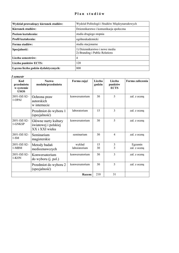Pl a n s t u d i ów Wydział prowadzący kierunek studiów: Wydział Politologii i Studiów Międzynarodowych Kierunek studiów: Dziennikarstwo i komunikacja społeczna Poziom kształcenia: studia drugiego stopnia Profil kształcenia: ogólnoakademicki Forma studiów: studia stacjonarne Specjalność: 1) Dziennikarstwo i nowe media 2) Branding i Public Relations Liczba semestrów: 4 Liczba punktów ECTS: 120 Łączna liczba godzin dydaktycznych: 800 I semestr Kod przedmiotu w systemie USOS 2051-DZ-S21-OPAI Nazwa modułu/przedmiotu Ochrona praw autorskich w internecie Przedmiot do wyboru 1 (specjalność) Forma zajęć Liczba godzin Liczba punktów ECTS Forma zaliczenia konwersatorium 30 5 zal. z oceną laboratorium 15 3 zal. z oceną konwersatorium 30 5 zal. z oceną 2051-DZ-S21-GNKSP Główne nurty kultury światowej i polskiej XX i XXI wieku 2051-DZ-S21-SM Seminarium magisterskie seminarium 30 4 zal. z oceną 2051-DZ-S21-MBM Metody badań medioznawczych wykład laboratorium 15 30 3 3 Egzamin zal. z oceną 2051-DZ-S21-KON Konwersatorium do wyboru (j. pol.) konwersatorium 30 3 zal. z oceną Przedmiot do wyboru 2 (specjalność) konwersatorium 30 5 zal. z oceną 210 31 Razem: II semestr Kod przedmiotu w systemie USOS Nazwa modułu/przedmiotu Forma zajęć Liczba godzin Liczba punktów ECTS Forma zaliczenia 2051-DZ-S21-WSP Współczesne społeczeństwo polskie konwersatorium 30 5 zal. z oceną 2051-DZ-S21-KON Konwersatorium do wyboru (j. obcy) konwersatorium 30 5 zal. z oceną 2051-DZ-S21-TKM Teorie komunikowania masowego wykład ćwiczenia 20 30 3 3 Egzamin zal. z oceną 2051-DZ-S21-SM Seminarium magisterskie konwersatorium 30 4 zal. z oceną 2051-DZ-S21-MLS Media lokalne i środowiskowe wykład 30 5 Egzamin laboratorium 20 4 zal. z oceną 190 29 Forma zajęć Liczba godzin Liczba punktów ECTS Forma zaliczenia Przedmiot do wyboru 3 (specjalność) Razem: III semestr Kod przedmiotu w systemie USOS Nazwa modułu/przedmiotu 2051-DZ-S22-WSM Współczesne stosunki międzynarodowe wykład 30 5 Egzamin 2051-DZ-S22-PI Psychologia internetu konwersatorium 30 5 zal. z oceną 2051-DZ-S22-RMI Reklama i marketing w internecie konwersatorium 30 5 zal. z oceną Przedmiot do wyboru 4 (specjalność) konwersatorium 30 5 zal. z oceną seminarium 30 4 zal. z oceną wykład 30 2 zal. z oceną konwersatorium 30 5 zal. z oceną 210 31 2051-DZ-S22-SM Seminarium magisterskie Wykład ogólnouniwersytecki (do wyboru) Przedmiot do wyboru 5 (specjalność) Razem: IV semestr Kod przedmiotu w systemie USOS Nazwa modułu/przedmiotu Forma zajęć Liczba godzin Liczba punktów ECTS Forma zaliczenia 2051-DZ-S22-SocM Social media konwersatorium 30 4 zal. z oceną 2051-DZ-S22-SKOM Społeczne i kulturowe oddziaływanie mediów konwersatorium 30 4 zal. z oceną 2051-DZ-S22-KM Komunikowanie międzykulturowe wykład 30 5 Egzamin 2051-DZ-S22-SM Seminarium magisterskie seminarium 30 8 zal. z oceną wykład 30 2 zal. z oceną Przedmiot do wyboru 6 (specjalność) laboratorium 20 3 zal. z oceną Przedmiot do wyboru 7 (specjalność) laboratorium 20 3 zal. z oceną 190 29 Wykład ogólnouniwersytecki (do wyboru) Razem: Przedmioty do wyboru - specjalność Dziennikarstwo i nowe media Kod przedmiotu w systemie USOS Nazwa modułu/przedmiotu Forma zajęć Liczba godzin Liczba punktów ECTS Forma zaliczenia laboratorium 15 3 zal. z oceną konwersatorium 30 5 zal. z oceną 20 4 zal. z oceną SEMESTR I 2051-DZ-S2- Język w komunikacji 1-JKI internetowej 2051-DZ-S2- Dziennikarstwo wobec 1-DWNM nowych mediów SEMESTR II 2051-DZ-S2- Internetowe gatunki 1-IGD dziennikarskie laboratorium SEMESTR III 2051-DZ-S2- Dziennikarstwo 2-DS specjalistyczne konwersatorium 30 5 zal. z oceną 2051-DZ-S2- Warsztat korespondenta 2-WKW wojennego konwersatorium 30 5 zal. z oceną SEMESTR IV 2051-DZ-S2- TV online – produkcja 2-TVON multimedialna i wideo laboratorium 20 3 zal. z oceną 2051-DZ-S2- Projektowanie graficzne w 2-PGNM nowych mediach laboratorium 20 3 zal. z oceną Przedmioty do wyboru - specjalność Branding i Public Relations Kod przedmiotu w systemie USOS Nazwa modułu/przedmiotu Forma zajęć Liczba godzin Liczba punktów Forma zaliczenia ECTS SEMESTR I 2051-DZ-S2- Komunikacja 1-KMR marketingowa laboratorium 15 3 zal. z oceną 2051-DZ-S2- Public relations 1-PRI w internecie konwersatorium 30 5 zal. z oceną 20 4 zal. z oceną SEMESTR II 2051-DZ-S2- Branding – badania, 1-BR strategia, wdrożenia laboratorium SEMESTR III 2051-DZ-S2- Zarządzanie zmianą 2-ZM konwersatorium 30 5 zal. z oceną 2051-DZ-S2- Team building 2-TB konwersatorium 30 5 zal. z oceną SEMESTR IV 2051-DZ-S2- Prezentacje 2-PWP i wystąpienia publiczne laboratorium 20 3 zal. z oceną 2051-DZ-S2- Creative Thinking 2-CT laboratorium 20 3 zal. z oceną Plan studiów obowiązuje od semestru zimowego roku akademickiego 2012/2013 Plan studiów został uchwalony na posiedzeniu Rady Wydziału Politologii i Studiów Międzynarodowych w dniu …… r. (podpis Dziekana)