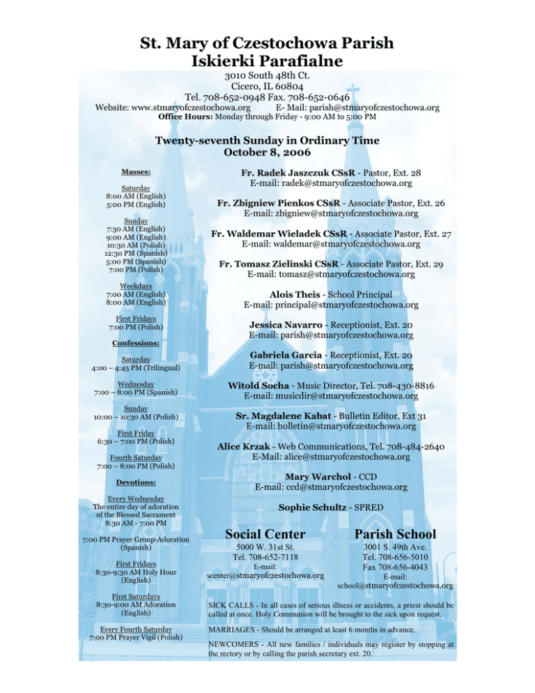 St. Mary of Czestochowa Parish Iskierki Parafialne 3010 South 48th Ct. Cicero, IL 60804 Tel. 708-652-0948 Fax. 708-652-0646 Website: www.stmaryofczestochowa.org E- Mail: [email protected] Office Hours: Monday through Friday - 9:00 AM to 5:00 PM Twenty-seventh Sunday in Ordinary Time October 8, 2006 Masses: Saturday 8:00 AM (English) 5:00 PM (English) Sunday 7:30 AM (English) 9:00 AM (English) 10:30 AM (Polish) 12:30 PM (Spanish) 5:00 PM (Spanish) 7:00 PM (Polish) Weekdays 7:00 AM (English) 8:00 AM (English) First Fridays 7:00 PM (Polish) Confessions: Fr. Radek Jaszczuk CSsR - Pastor, Ext. 28 E-mail: [email protected] Fr. Zbigniew Pienkos CSsR - Associate Pastor, Ext. 26 E-mail: [email protected] Fr. Waldemar Wieladek CSsR - Associate Pastor, Ext. 27 E-mail: [email protected] Fr. Tomasz Zielinski CSsR - Associate Pastor, Ext. 29 E-mail: [email protected] Alois Theis - School Principal E-mail: [email protected] Jessica Navarro - Receptionist, Ext. 20 E-mail: [email protected] Saturday 4:00 – 4:45 PM (Trilingual) Gabriela Garcia - Receptionist, Ext. 20 E-mail: [email protected] Wednesday 7:00 – 8:00 PM (Spanish) Witold Socha - Music Director, Tel. 708-430-8816 E-mail: [email protected] Sunday 10:00 – 10:30 AM (Polish) First Friday 6:30 – 7:00 PM (Polish) Fourth Saturday 7:00 – 8:00 PM (Polish) Sr. Magdalene Kabat - Bulletin Editor, Ext 31 E-mail: [email protected] Alice Krzak - Web Communications, Tel. 708-484-2640 E-Mail: [email protected] Devotions: Mary Warchol - CCD E-mail: [email protected] Every Wednesday The entire day of adoration of the Blessed Sacrament 8:30 AM - 7:00 PM Sophie Schultz - SPRED 7:00 PM Prayer Group-Adoration (Spanish) First Fridays 8:30-9:30 AM Holy Hour (English) First Saturdays 8:30-9:00 AM Adoration (English) Every Fourth Saturday 7:00 PM Prayer Vigil (Polish) Social Center Parish School 5000 W. 31st St. Tel. 708-652-7118 3001 S. 49th Ave. Tel. 708-656-5010 Fax 708-656-4043 E-mail: [email protected] E-mail: [email protected] SICK CALLS - In all cases of serious illness or accidents, a priest should be called at once. Holy Communion will be brought to the sick upon request. MARRIAGES - Should be arranged at least 6 months in advance. NEWCOMERS - All new families / individuals may register by stopping at the rectory or by calling the parish secretary ext. 20. Sunday Iskierki Parafialne MASS INTENTIONS October 8, Twenty-seventh Sunday in Ordinary Time 7:30 Parishioners 9:00 †Ed Kandl (Al Rybinski) †Sisto Padilla (Marissa Martinez) †Bernice & Edward Przepiorka (Stella Wazny) 10:30 Stanisław i Józefa Maturski (25 rocz.ślubu) O szczęśliwe rozwiązanie dla Danuty O szczęśliwą operację i powrót do zdrowia dla Syna Jacka O Boże bł. dla Stanisław i Józefa Maturski ( 25 rocz ślubu) Podziękowanie O Boga za wszystkie łaski z prośbą o nowe O zdrowie dla Jana O Boże bł. dla Alex Furczon (Rodzice) O Dary Ducha Św. dla córki †Andrzej Gil †Józef Piejko †Anna Ceremuga †Franciszek Józwiak †Feliks Nowakowski †Edward Ptak †Janina Kwiatkowska †Jan Tylka †Franciszek Kowalski (rocznica) †Józef i Anna Walkosz †Jozefa i Agnieszka Wyrostek †Jan i Ludwina Pańszczyk †Jan Rzadkosz †Jan Walkosz †Agnieszka Majka †Za Dusze w czyśćcu cierpiące 12:30 Por los Feligreses 5:00 Por los Feligreses 7:00 †Józef, Maria Gabor, Maria Enyedy (daughter & son) †Piotr, Bronisława, Zygmunt Urbanowicz October 9, Monday, Denis and companions/martyrs 7:00 †Celia Stopa (Chris & Deb Barrett) 8:00 †Parents of Victor & Helen Cison October 10, Tuesday, Weekday 7:00 †Theresa Kosizier (Eleanor Alexander) 8:00 †Mike Vavrek (family) October 11, Wednesday, Weekday 7:00 †Irene Cholewa (family) 8:00 †Mary Victoria (family) October 12, Thursday, Weekday 7:00 †Helen Natonski (Dolores Kozerski) 8:00 †John & Helen Ostrowski (Ostrowski family) October 13, Friday, Weekday 7:00 †Celia Stopa (Gen Pawlak) 8:00 Marcela Garcia (Birthday) Margarita Alvarez y familia (Birthday) 4:00 Wedding: America Hernandez & Guillermo Gomez October 14, Saturday) Callistas, pope, martyr 8:00 Parishioners 11:00 Wedding: Katazyna Lys & Piotr Martinczak 1:00 Wedding: Jan Walkosz & Małgorzata Luberda 3:00 Quinceañera: Maria De Luz Lopez 5:00 †Marco Salvino (family) †Jack Patula †Wanda Glowacki October 15, Twenty-eighth Sunday in Ordinary Time 7:30 †Walter Walentin Miarecki 9:00 For those who are homebound (St. Mary’s Choir) †Elias & Julia Vergulak (family) †Ann M. Mietlicki (family) †Michael & Elzbieta Wazny (Stella Wazny) 10:30 O Boże bł. dla Katarzyna Wantuch (urodzinowa) †Feliks Nowakowski †Zuzanna i Józef Augustyn †Kazimiera Kubaczyk †Andrzej Gil †Józef Piejko †Anna Ceremuga †Franciszek Jóżwiak 5:00 Por los Feligreses 7:00 Za parafian Lector Schedule Saturday, October 14 2006 5PM Adam Jasinski Sunday, October 15, 2006 7:30 John Kociolko, 9:00 Nicole Perez, Kim Tross 10:30 Cecylia Pierzchała, Violetta Bielobrakek 12:30 Jessica Cervantes, Virginia Hernandez, Maria Rodriguez 5:00 Martin Duran, Carmen Soto, Juana Salas Marisol Ortiz 7:00 Aldona Dziekonska Eucharistic Ministers Saturday, October 14, 2006 5PM Sunday, October 15, 2006 7:30 Frank Urban, Ed Hennessy 9:00 Eleanore Skora, Raphael Ayala, Irene Saldana, Vicente Saldana, Christine Zaragoza, John Kulaga 10:30 Priests & Polish ministers 12:30 Mario Segoviano, Mariana Garcia 5:00 Margarita Morales, Maria Cruz Rodriguez 7:00 Priests WEDDING BANNS There is a promise of marriage between: III. America N. Hernandez & Guillermo Gomez III. Katarzyna Lys & Piotr Martinczak III. Małgorzata Luberda & Jan Walkosz I. Agnieszka Motyka & Arkadiusz Czech I. Jadwiga Kasperek & Wojciech Miskowiec St. Mary of Czestochowa Sunday Collections October 1, 2006 All Are Welcome! A second meeting will be held on Wednesday, October 11th at 7pm in Makuch Hall for all who were present at the Parish Financial Report meeting on September 21st as well as for all parishioners that are interested i
