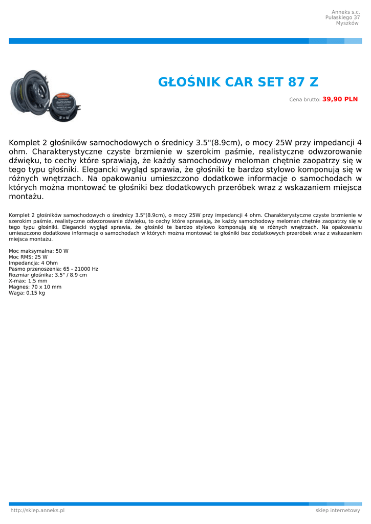 Anneks s.c. Pułaskiego 37 Myszków GŁOŚNIK CAR SET 87 Z Cena brutto: 39,90 PLN Komplet 2 głośników samochodowych o średnicy 3.5"(8.9cm), o mocy 25W przy impedancji 4 ohm. Charakterystyczne czyste brzmienie w szerokim paśmie, realistyczne odwzorowanie dźwięku, to cechy które sprawiają, że każdy samochodowy meloman chętnie zaopatrzy się w tego typu głośniki. Elegancki wygląd sprawia, że głośniki te bardzo stylowo komponują się w różnych wnętrzach. Na opakowaniu umieszczono dodatkowe informacje o samochodach w których można montować te głośniki bez dodatkowych przeróbek wraz z wskazaniem miejsca montażu. Komplet 2 głośników samochodowych o średnicy 3.5"(8.9cm), o mocy 25W przy impedancji 4 ohm. Charakterystyczne czyste brzmienie w szerokim paśmie, realistyczne odwzorowanie dźwięku, to cechy które sprawiają, że każdy samochodowy meloman chętnie zaopatrzy się w tego typu głośniki. Elegancki wygląd sprawia, że głośniki te bardzo stylowo komponują się w różnych wnętrzach. Na opakowaniu umieszczono dodatkowe informacje o samochodach w których można montować te głośniki bez dodatkowych przeróbek wraz z wskazaniem miejsca montażu. Moc maksymalna: 50 W Moc RMS: 25 W Impedancja: 4 Ohm Pasmo przenoszenia: 65 - 21000 Hz Rozmiar głośnika: 3.5" / 8.9 cm X-max: 1.5 mm Magnes: 70 x 10 mm Waga: 0.15 kg http://sklep.anneks.pl sklep internetowy