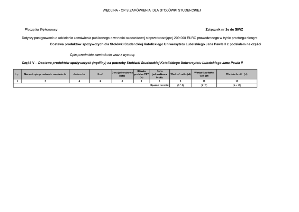 WĘDLINA - OPIS ZAMÓWIENIA DLA STOŁÓWKI STUDENCKIEJ Pieczątka Wykonawcy Załącznik nr 2e do SIWZ Dotyczy postępowania o udzielenie zamówienia publicznego o wartości szacunkowej nieprzekraczającej 209 000 EURO prowadzonego w trybie przetargu nieograniczonego pn.: Dostawa produktów spożywczych dla Stołówki Studenckiej Katolickiego Uniwersytetu Lubelskiego Jana Pawła II z podziałem na części Opis przedmiotu zamówienia wraz z wyceną: Część V – Dostawa produktów spożywczych (wędliny) na potrzeby Stołówki Studenckiej Katolickiego Uniwersytetu Lubelskiego Jana Pawła II Lp. Nazwa i opis przedmiotu zamówienia Jednostka Ilość 1 2 4 5 Stawka Cena jednostkowa podatku VAT netto (%) 6 7 Cena jednostkowa brutto Wartość netto (zł) Wartość podatku VAT (zł) Wartość brutto (zł) 8 9 10 11 Sposób liczenia: (5 * 6) (9 * 7) (9 + 10) WĘDLINA - OPIS ZAMÓWIENIA DLA STOŁÓWKI STUDENCKIEJ 1. Boczek wędzony Skład: azotan sodu, substancja zagęszczająca: karagen, glukoza, fosforan diskrobiowy, wzmacniacz smaku: glutaminian monosodowy, przeciwutleniacz: izoaskorbinian sodu, substancja konserwująca: azotyn sodu. Skład: boczek wieprzowy 86%,woda, sól, białko sojowe, stabilizator: trifosforany, cytryniany Zawiera alergeny: soję. Produkt może zawierać śladowe ilości glutenu, selera, gorczycy, mleka. kg 40 2. Filet wędzony z indyka Skład: filet z indyka 83%, woda, sól, białko sojowe, stabilizator: trifosforany, cytryniany sodu, substancja zagęszczająca: karagen, glukoza, fosforan diskrobiowy, wzmacniacz smaku: glutaminian monosodowy, przeciwutleniacz: izoaskorbinian sodu, aromaty naturalne, substancja konserwująca: azotyn sodu. Zawiera alergeny: soję. Produkt może zawierać śladowe ilości glutenu, selera, gorczycy, mleka. kg 100 WĘDLINA - OPIS ZAMÓWIENIA DLA STOŁÓWKI STUDENCKIEJ 3. Kiełbasa krakowska Skład: mięso wieprzowe 63%, woda, mięso wołowe 10%, sól, błonnik sojowy, przyprawy naturalne, gorczyca, seler, białko sojowe, stabilizator: trifosforany, substancja zagęszczająca: karagen, glukoza, fosforan diskrobiowy, wzmacniacz smaku: glutaminian monosodowy, białko zwierzęce kolagenowe, przeciwutleniacz: izoaskorbinian sodu, substancja konserwująca: azotyn sodu. Zawiera alergeny: soję, gorczycę, seler. Produkt może zawierać śladowe ilości glutenu, mleka. kg 200 4. Kabanosy Skład: mięso wieprzowe (do wyprodukowania 100 g produktu użyto 189 g surowca), sól, przyprawy naturalne, cukier, wzmacniacz smaku: glutaminian monosodowy, substancja konserwująca: azotyn sodu. kg 50 WĘDLINA - OPIS ZAMÓWIENIA DLA STOŁÓWKI STUDENCKIEJ 5. Polędwica cygańska Skład: schab wieprzowy b/k 75%, woda, sól, liść laurowy, białko sojowe i zwierzęce, cukry: maltodekstryna, glukoza, stabilizatory: trifosforany, difosforany, octan i mleczan potasu, octan sodu, substancja zagęszczająca: karagen, białko mleka, przeciwutleniacz: izoaskorbinian sodu, wzmacniacz smaku: glutaminian monosodowy, aromaty naturalne, substancja konserwująca: azotyn sodu. Zawiera alergeny: soję, mleko. Produkt może zawierać śladowe ilości glutenu, selera, gorczycy. kg 100 WĘDLINA - OPIS ZAMÓWIENIA DLA STOŁÓWKI STUDENCKIEJ 6. Parówki księżopolskie Skład: mięso wieprzowe 64%, woda, białko sojowe, błonnik sojowy, skrobia modyfikowana, sól, kasza manna, stabilizator: trifosforany, cytryniany sodu, difosforany, substancja zagęszczająca: karagen, glukoza, maltodekstryna, wzmacniacz smaku: glutaminian monosodowy, przeciwutleniacz: izoaskorbinian sodu, kwas askorbinowy, przyprawy, koncentraty i ekstrakty przypraw, aromaty, regulator kwasowości: octany sodu, kwas cytrynowy, mono i diglicerydy kwasów tłuszczowych, substancja konserwująca: azotyn sodu. Zawiera alergeny: soję, gluten, mleko. Produkt może zawierać śladowe ilości selera, gorczycy. kg 300 WĘDLINA - OPIS ZAMÓWIENIA DLA STOŁÓWKI STUDENCKIEJ 7. Szynka domowa Skład: szynka wieprzowa b/k 91%, woda, sól, białko sojowe, stabilizator: trifosforany, cytryniany sodu, substancja zagęszczająca: karagen, glukoza, fosforan diskrobiowy, wzmacniacz smaku: glutaminian monosodowy, przeciwutleniacz: izoaskorbinian sodu, aromaty naturalne, substancja konserwująca: azotyn sodu. Zawiera alergeny: soję. Produkt może zawierać śladowe ilości glutenu, selera, gorczycy, mleka. kg 100 8. Szynka gotowana w siatce Skład: mięso wieprzowe 58%, woda, sól, skrobia acetylowana, białko sojowe, stabilizatory: trifosforany, difosforany, polifosforany, substancja zagęszczająca: karagen, błonnik pszenny, wzmacniacz smaku: glutaminian monosodowy, białko wieprzowe kolagenowe, dekstroza, przeciwutleniacz: izo- i askorbinian sodu, aromaty naturalne, substancja konserwująca: azotyn sodu. Zawiera alergeny: soję, gluten. Produkt może zawierać śladowe ilości selera, gorczycy. kg 100 WĘDLINA - OPIS ZAMÓWIENIA DLA STOŁÓWKI STUDENCKIEJ 9. Polędwica z indyka Skład: filet z indyka 57%, woda, skrobia acetylowana, sól, białko sojowe, stabilizatory: trifosforany, difosforany, polifosforany, substancja zagęszczająca: karagen, błonnik pszenny, wzmacniacz smaku: glutaminian monosodowy, rybonukleotydy disodowe, białko wieprzowe, dekstroza, przeciwutleniacz: izo- i askorbinian sodu, ekstrakty drożdżowe, hydrolizowane białka roślinne, aromaty, ekstrakty i przyprawy naturalne, aromat z kurczaka, substancja konserwująca: azotyn sodu. Zawiera alergeny: soję, gluten, seler. Produkt może zawierać śladowe ilości gorczycy, mleka. kg 100 WĘDLINA - OPIS ZAMÓWIENIA DLA STOŁÓWKI STUDENCKIEJ 10. Salceson sołtysa Skład: łopatka wieprzowa b/k 70%, woda, tkanka łączna, sól, stabilizator: trójfosforan pentasodowy, maltodekstryna, białko zwierzęce wieprzowe kolagenowe, cukry, glukoza, stabilizator: karagen, błonnik pszenny, cytrynian trisodowy, przeciwutleniacz: izoaskorbinian sodu, wzmacniacz smaku: glutaminian monosodowy, hydrolizowane białko sojowe, regulator kwasowości: kwas cytrynowy, octan potasu, 