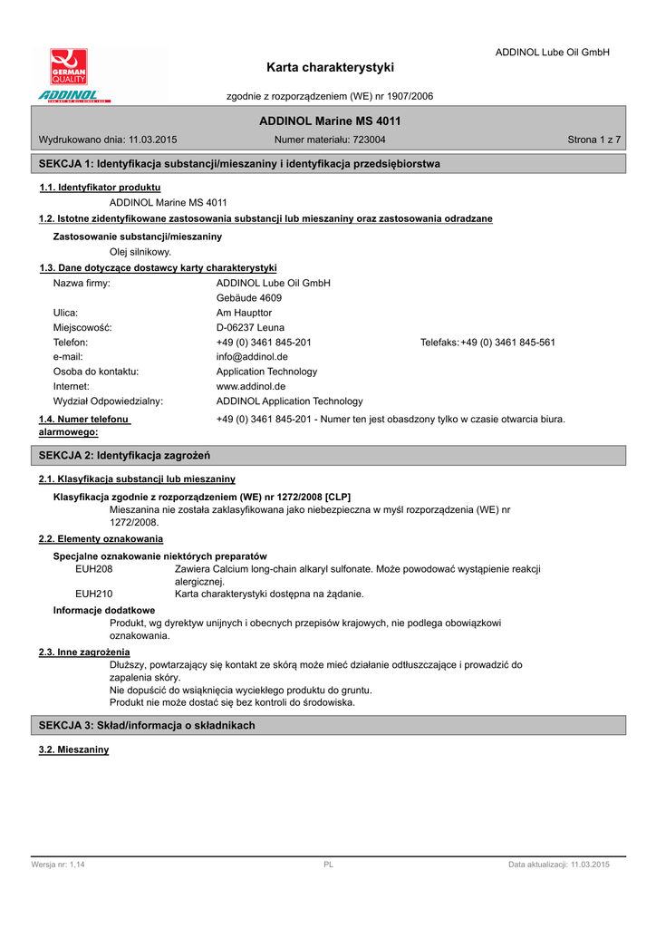 ADDINOL Lube Oil GmbH Karta charakterystyki zgodnie z rozporządzeniem (WE) nr 1907/2006 ADDINOL Marine MS 4011 Wydrukowano dnia: 11.03.2015 Strona 1 z 7 Numer materiału: 723004 SEKCJA 1: Identyfikacja substancji/mieszaniny i identyfikacja przedsiębiorstwa 1.1. Identyfikator produktu ADDINOL Marine MS 4011 1.2. Istotne zidentyfikowane zastosowania substancji lub mieszaniny oraz zastosowania odradzane Zastosowanie substancji/mieszaniny Olej silnikowy. 1.3. Dane dotyczące dostawcy karty charakterystyki Nazwa firmy: ADDINOL Lube Oil GmbH Gebäude 4609 Ulica: Miejscowość: Telefon: e-mail: Am Haupttor D-06237 Leuna +49 (0) 3461 845-201 [email protected] Osoba do kontaktu: Internet: Wydział Odpowiedzialny: Application Technology www.addinol.de ADDINOL Application Technology 1.4. Numer telefonu alarmowego: Telefaks: +49 (0) 3461 845-561 +49 (0) 3461 845-201 - Numer ten jest obasdzony tylko w czasie otwarcia biura. SEKCJA 2: Identyfikacja zagrożeń 2.1. Klasyfikacja substancji lub mieszaniny Klasyfikacja zgodnie z rozporządzeniem (WE) nr 1272/2008 [CLP] Mieszanina nie została zaklasyfikowana jako niebezpieczna w myśl rozporządzenia (WE) nr 1272/2008. 2.2. Elementy oznakowania Specjalne oznakowanie niektórych preparatów EUH208 Zawiera Calcium long-chain alkaryl sulfonate. Może powodować wystąpienie reakcji alergicznej. EUH210 Karta charakterystyki dostępna na żądanie. Informacje dodatkowe Produkt, wg dyrektyw unijnych i obecnych przepisów krajowych, nie podlega obowiązkowi oznakowania. 2.3. Inne zagrożenia Dłuższy, powtarzający się kontakt ze skórą może mieć działanie odtłuszczające i prowadzić do zapalenia skóry. Nie dopuścić do wsiąknięcia wyciekłego produktu do gruntu. Produkt nie może dostać się bez kontroli do środowiska. SEKCJA 3: Skład/informacja o składnikach 3.2. Mieszaniny Wersja nr: 1,14 PL Data aktualizacji: 11.03.2015 ADDINOL Lube Oil GmbH Karta charakterystyki zgodnie z rozporządzeniem (WE) nr 1907/2006 ADDINOL Marine MS 4011 Wydrukowano dnia: 11.03.2015 Strona 2 z 7 Numer materiału: 723004 Składniki niebezpieczne Nazwa chemiczna Nr WE Nr CAS Ilość Klasyfikacja zgodnie z 67/548/EWG Klasyfikacja zgodnie z rozporządzeniem (WE) nr 1272/2008 [CLP] Nr Index Nr REACH < 1,15 % Polyolefin polyamine succinimide, polyol Polymer R53 Aquatic Chronic 4; H413 < 0,30 % Calcium long-chain alkaryl sulfonate confident R43-53 Skin Sens. 1, Aquatic Chronic 4; H317 H413 Wydźwięk zdań R-, H- i EUH: patrz sekcja 16. Informacja uzupełniająca DMSO-Extrakt < 3 %, IP 346. Stężenie PCB < 1mg/kg. Classification system: The classification corresponds to the current EC lists and is completed by information from specialist literature and company information. SEKCJA 4: Środki pierwszej pomocy 4.1. Opis środków pierwszej pomocy Wskazówki ogólne Samoochrona udzielających pierwszej pomocy. Zdjąć całą zanieczyszczoną odzież. Nie wolno przechowywać w kieszeniach ubrania matriałów nasączonych produktem. W przypadku wdychania Poszkodowanych przetransportować na świeże powietrze. Osoby z obrażeniamiami doprowadzić w bezpieczne i ciepłe miejsce. W razie długotrwałego występowania dolegliwości sprowadzić lekarza. W przypadku kontaktu ze skórą Zanieczyszczoną skórę natychmiast przemyć dużą ilością wody z mydłem. Zdjąć całą zanieczyszczoną odzież. Należy udać się do dermatologa. W przypadku kontaktu z oczami W przypadku kontaktu z oczami natychmiast przemyć je przez około 10 do 15 minut pod bieżącą wodą nie zamykając powiek. Następnie udać się do okulisty. W przypadku połknięcia Nie należy wywoływać wymiotów. Jamę ustną przepłukać dokładnie wodą. Natychmiast sprowadzić lekarza. 4.2. Najważniejsze ostre i opóźnione objawy oraz skutki narażenia Nie istnieją żadne informacje. 4.3. Wskazania dotyczące wszelkiej natychmiastowej pomocy lekarskiej i szczególnego postępowania z poszkodowanym Pierwsza pomoc, odkażanie, leczenie objawów. SEKCJA 5: Postępowanie w przypadku pożaru 5.1. Środki gaśnicze Wersja nr: 1,14 PL Data aktualizacji: 11.03.2015 ADDINOL Lube Oil GmbH Karta charakterystyki zgodnie z rozporządzeniem (WE) nr 1907/2006 ADDINOL Marine MS 4011 Wydrukowano dnia: 11.03.2015 Strona 3 z 7 Numer materiału: 723004 Odpowiednie środki gaśnicze Piana. Suchy środek gaśniczy. Dwutlenek węgla (CO2). Woda w sprayu. Niewłaściwe środki gaśnicze Pełny strumień wody. 5.2. Szczególne zagrożenia związane z substancją lub mieszaniną Podczas pożaru mogą powstawać: Tlenek węgla. Dwutlenek węgla (CO2). Tlenki siarki. Tlenki fosfor. Tlenki azotu (NOx). Sadza. 5.3. Informacje dla straży pożarnej W razie pożaru: Stosować niezależny sprzęt do ochrony dróg oddechowych. Informacja uzupełniająca Środki gaśnicze należy dostosować do otoczenia. Do ochrony osób i dla schłodzenia pojemników w obszarze zagrożenia używać strumienia wody. Nie wdychać dymów powstających w wyniku pożaru lub wybuchu. Należy osobno składować skażone płyny gaśnicze. Nie odprowadzać do kanalizacji i zbiorników wodnych. SEKCJA 6: Postępowanie w przypadku niezamierzonego uwolnienia do środowiska 6.1. Indywidualne środki ostrożności, wyposażenie ochronne i procedury w sytuacjach awaryjnych Rozlany/wysypany produkt może powodować poślizgnięcie lub upadek. Oddalić źródła zapłonu. Przy oddziaływaniu oparów, pyłów i aerozoli należy używać maski chroniącej drogi oddechowe. Unikać kontaktu ze skórą, oczami i odzieżą. 6.2. Środki ostrożności w zakresie ochrony środowiska Nie odprowadzać do kanalizacji i zbiorników wodnych. W przypadku ulatniania się gazu lub przedostania się do wody, gleby lub kanalizacji zawiadomić kompetentne organy władzy. Unikać rozprzestrzenienia się po powierzchni (np. przez zatamowanie lub zagrodzenie olejem). 6.3. Metody i materiały zapobiegające rozprzestrzenianiu się skażenia i służące do usuwania skażenia Należy zebrać pr